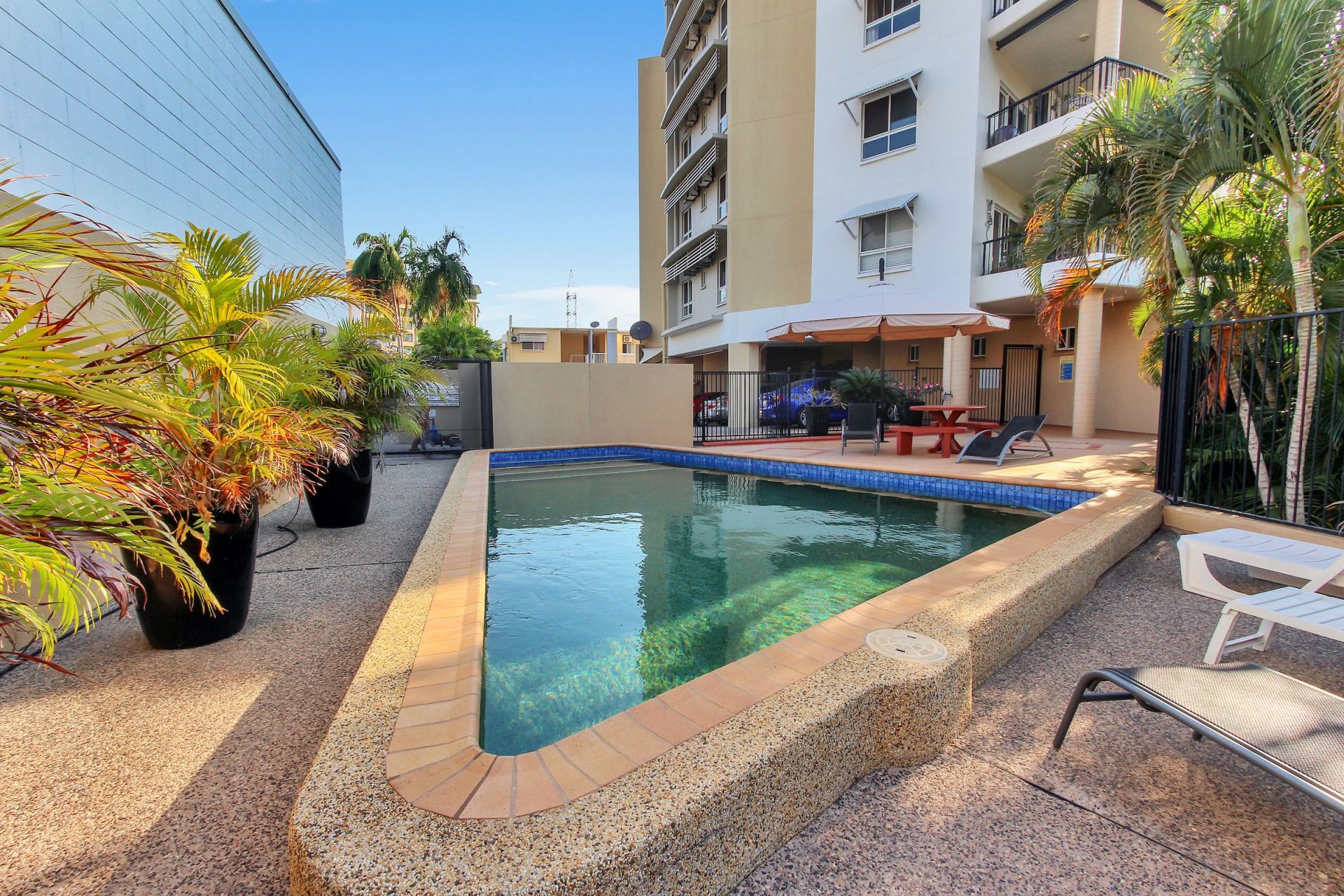 Enjoy the tropical breeze on the third floor balcony that has a private, relaxing green outlook over the Mindil Beach precinct with sea views in the distance. Walking distance to the Botanic Gardens, golf links and the Mindil Beach precinct and all areas of the city without being overrun.