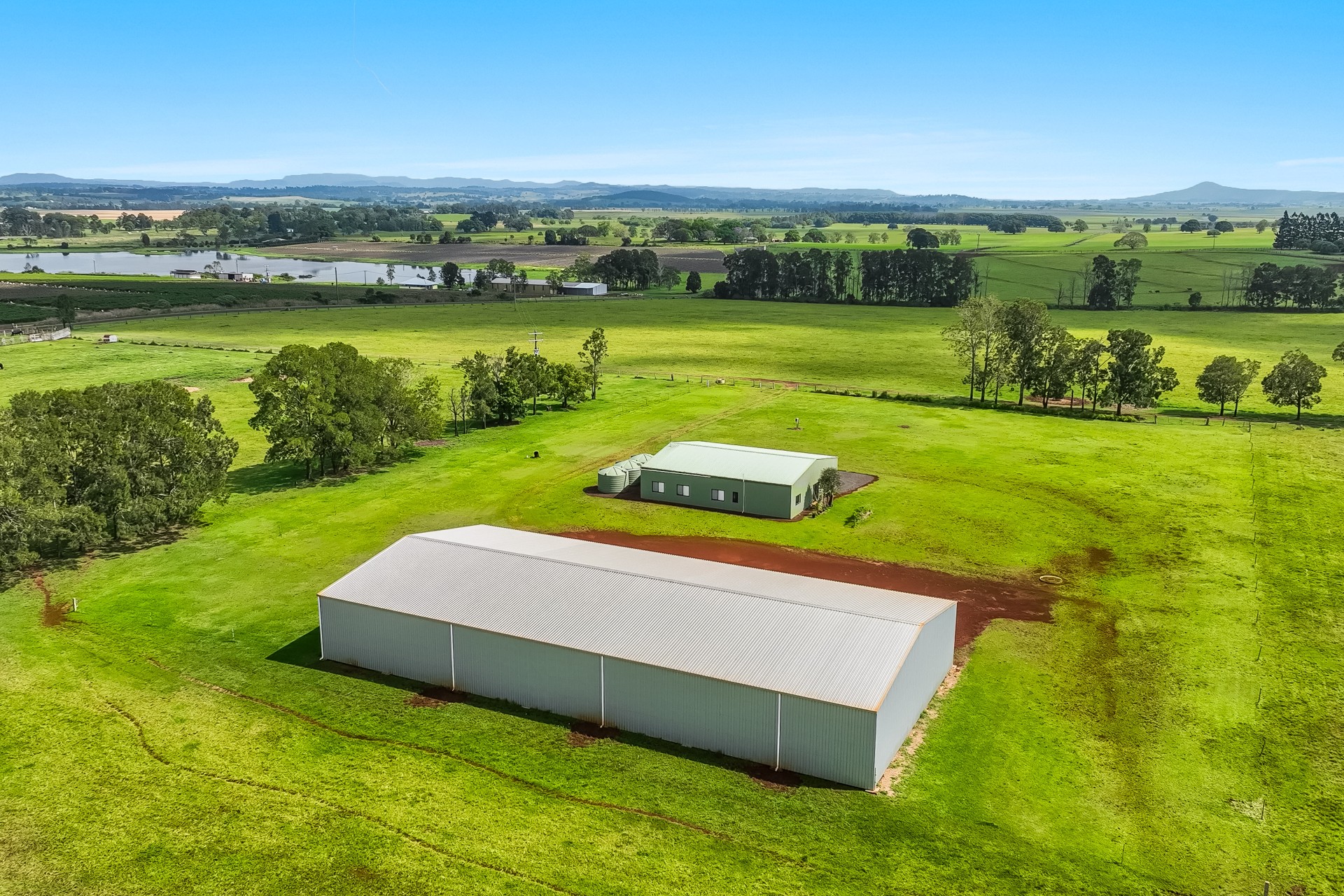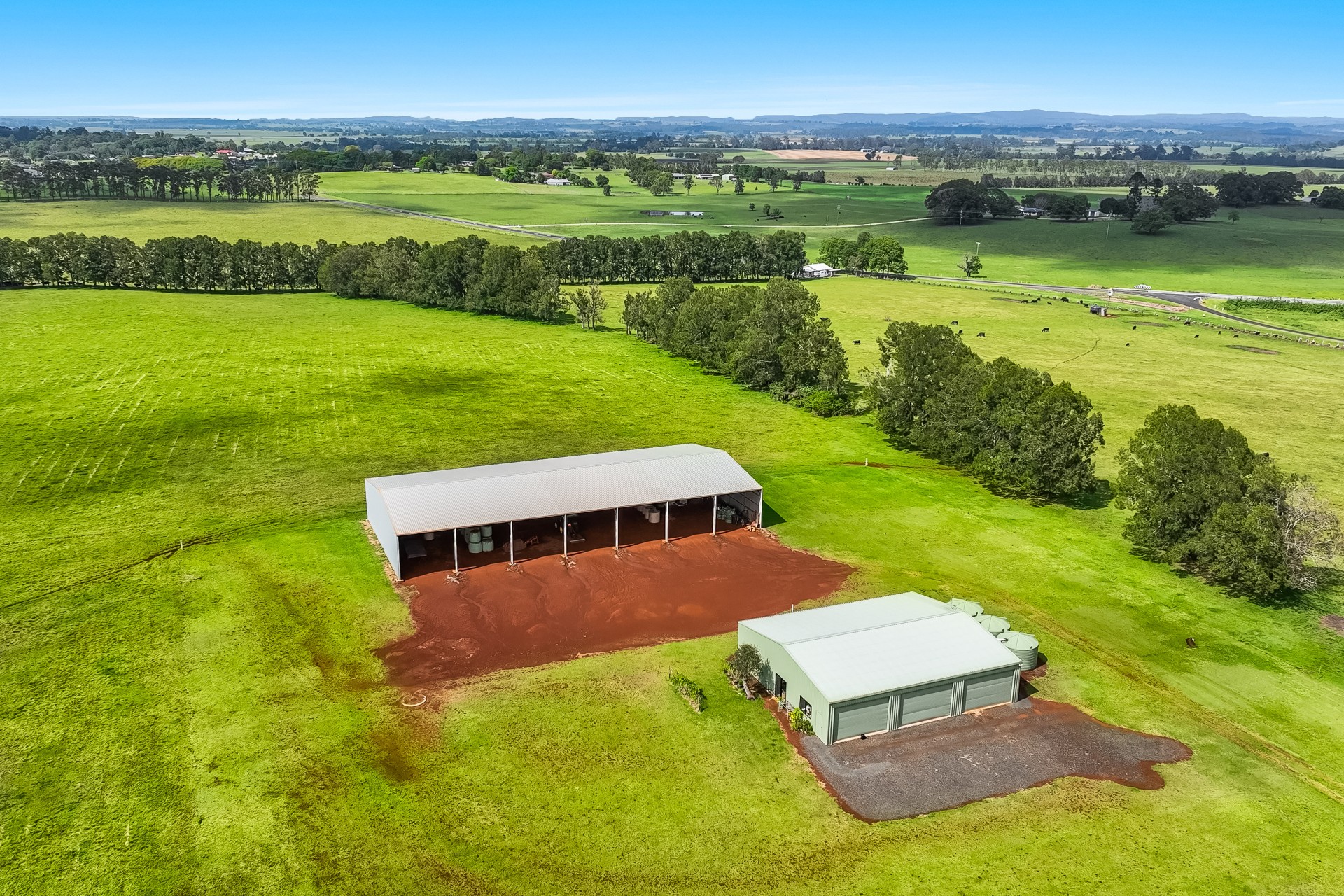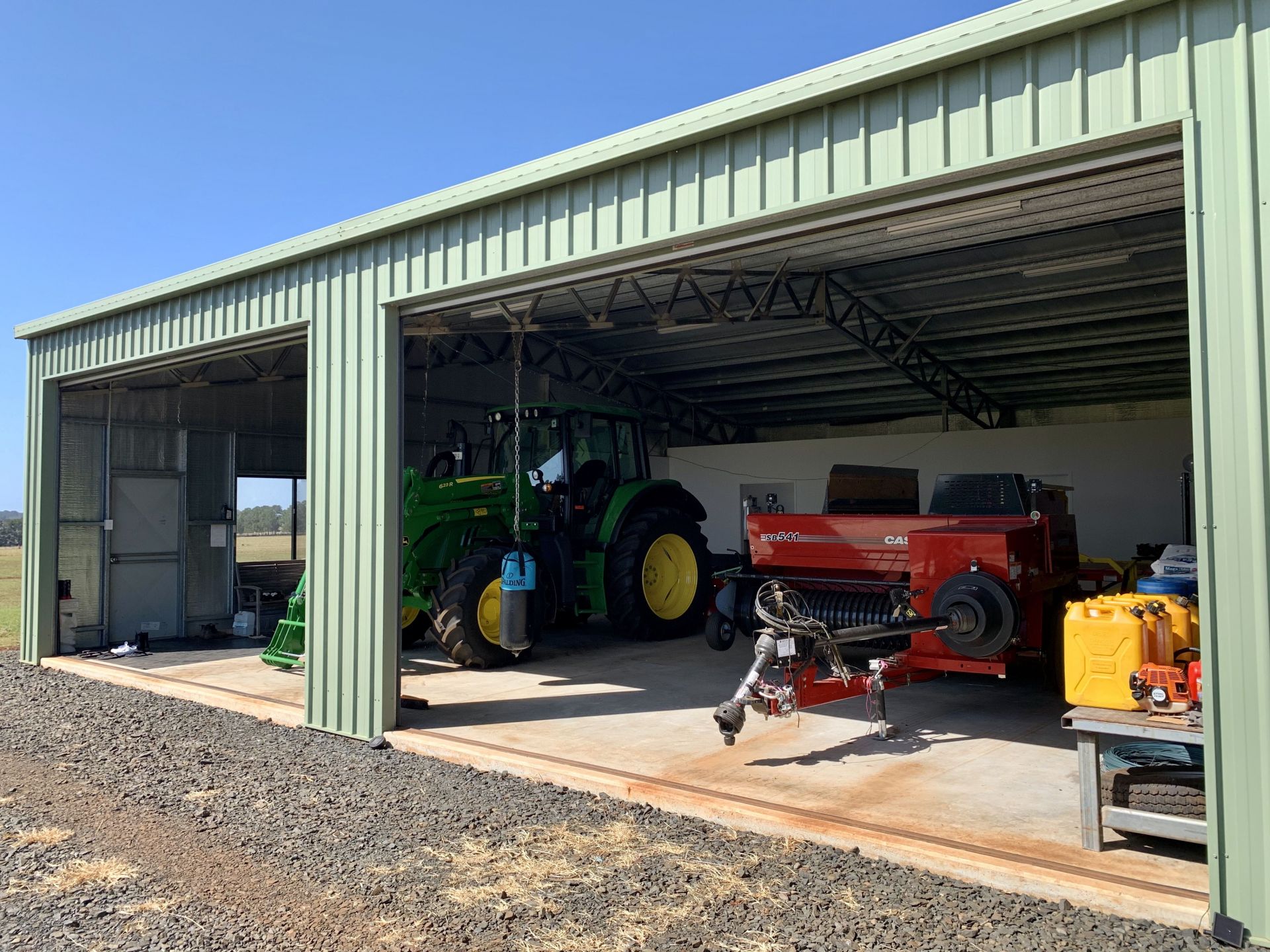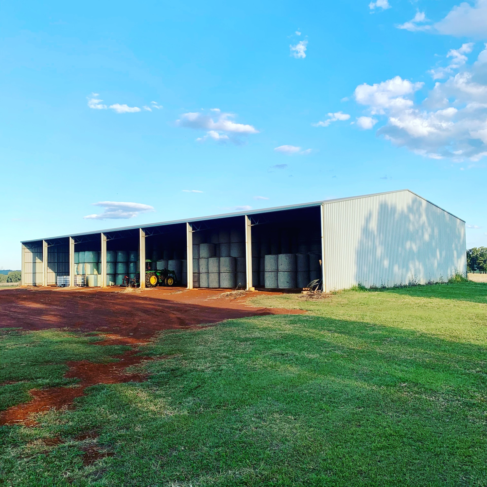 - Massive open-front hay and machinery shed 42m long x 20m wide x 4.2m high, comprising 7 x 6m bays with galvanised steel truss frames.