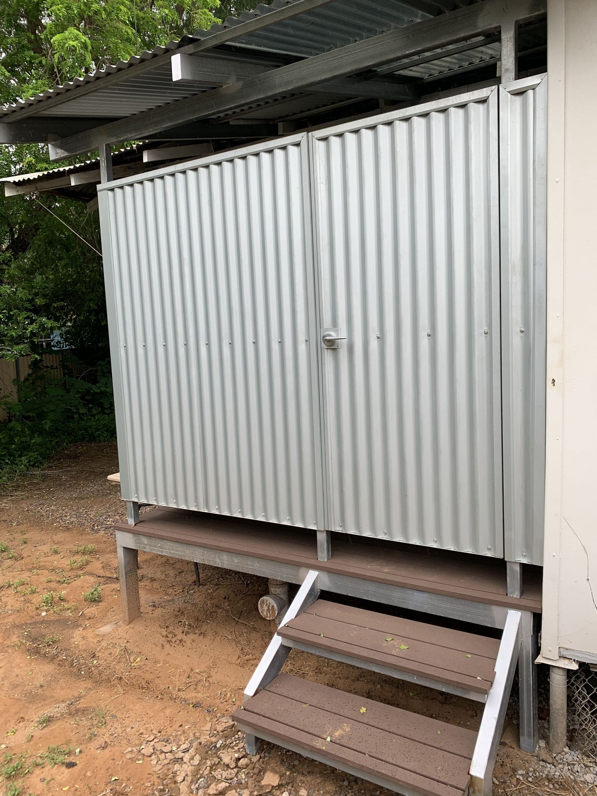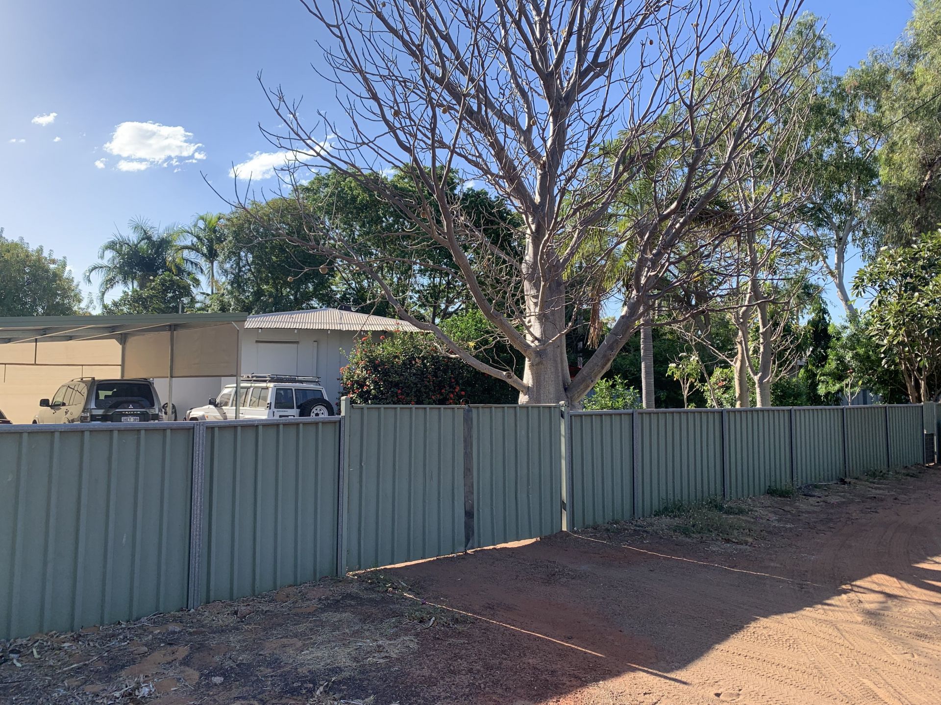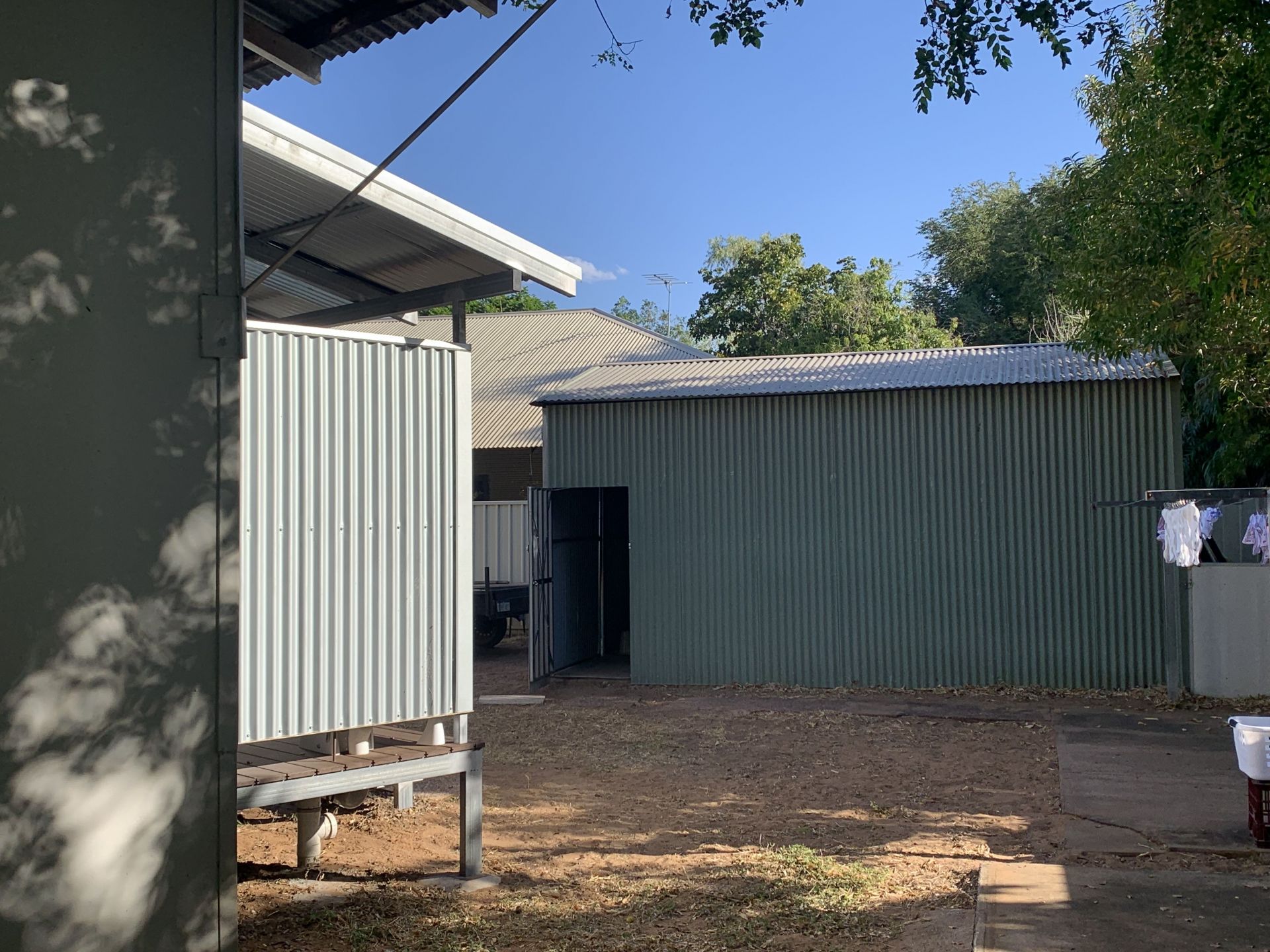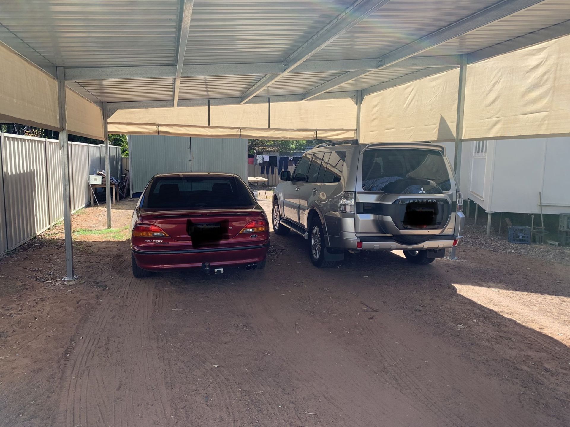 8x6 carport with drive through roll up shade cloth to approximately 6x4 shed. Big driveway which can fit multiple cars/boats.