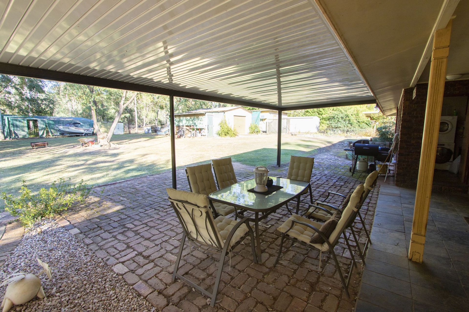 The covered large outdoor entertainment area overlooks the back yard and is the perfect place to entertain family and friends. Slate floors and exposed internal brick walls add a unique feel to this property. Positioned towards the end of a cul-de-sac street adds to this serene and quiet setting. Situated on a flat block, the dam and commercial size green house could be utilised to fund a business venture. There is also an oversized single garage and two other smaller sheds.