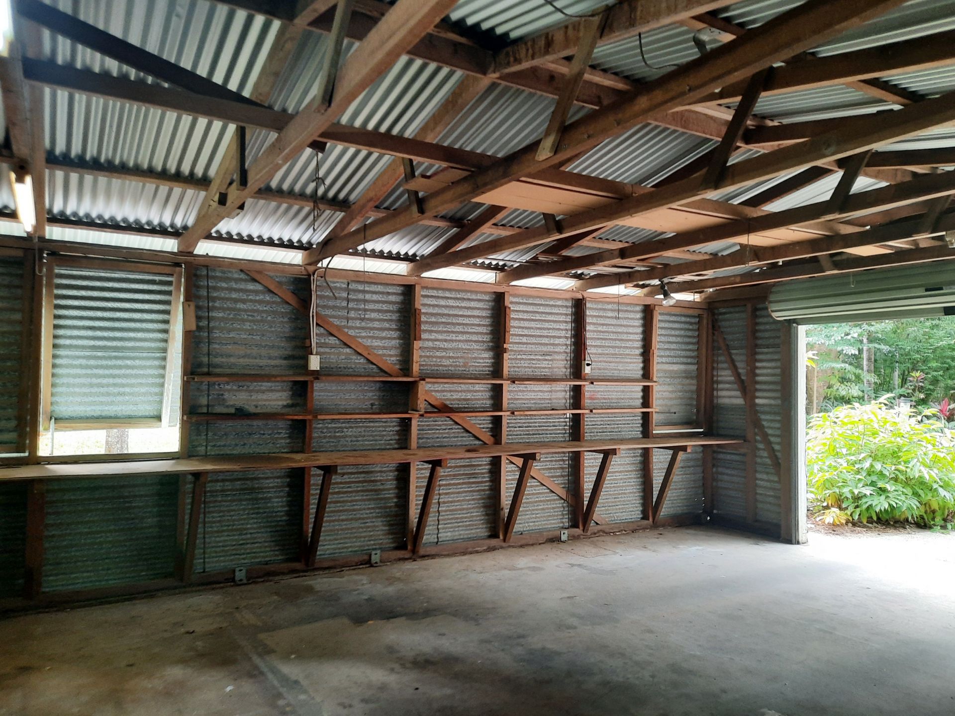 The large open shed between it and the lean to is also wired with shelving all around.