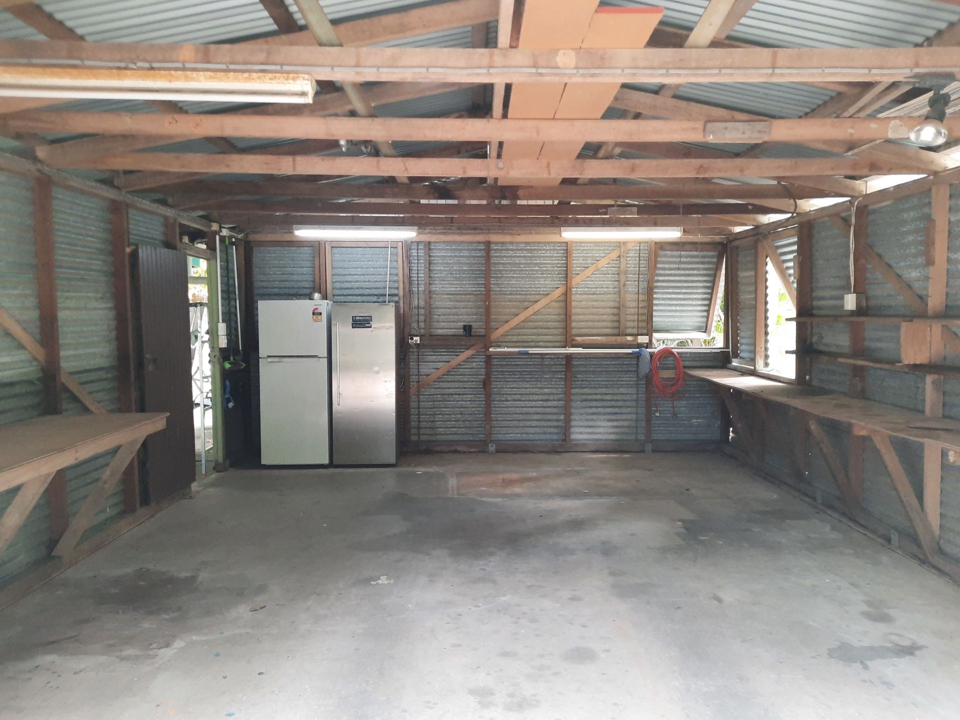 The shed alongside the house is 5.5mts wide x 7.5mts deep with side benches and a roller door and fully wired.