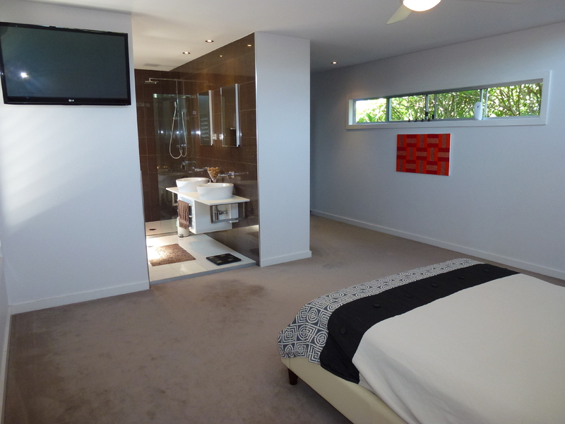 Upstairs the sensational master bedroom features ample his and hers storage, pure wool carpets and a stylish, luxurious ensuite boasting stone benchtops, twin vanity, shower and free standing bath.