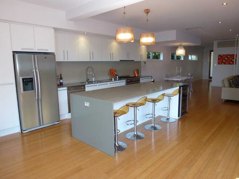 An immaculate kitchen, featuring a large island bench with Caesar stone finish and Smeg appliances including upright oven, microwave and dishwasher, is an entertainers dream.