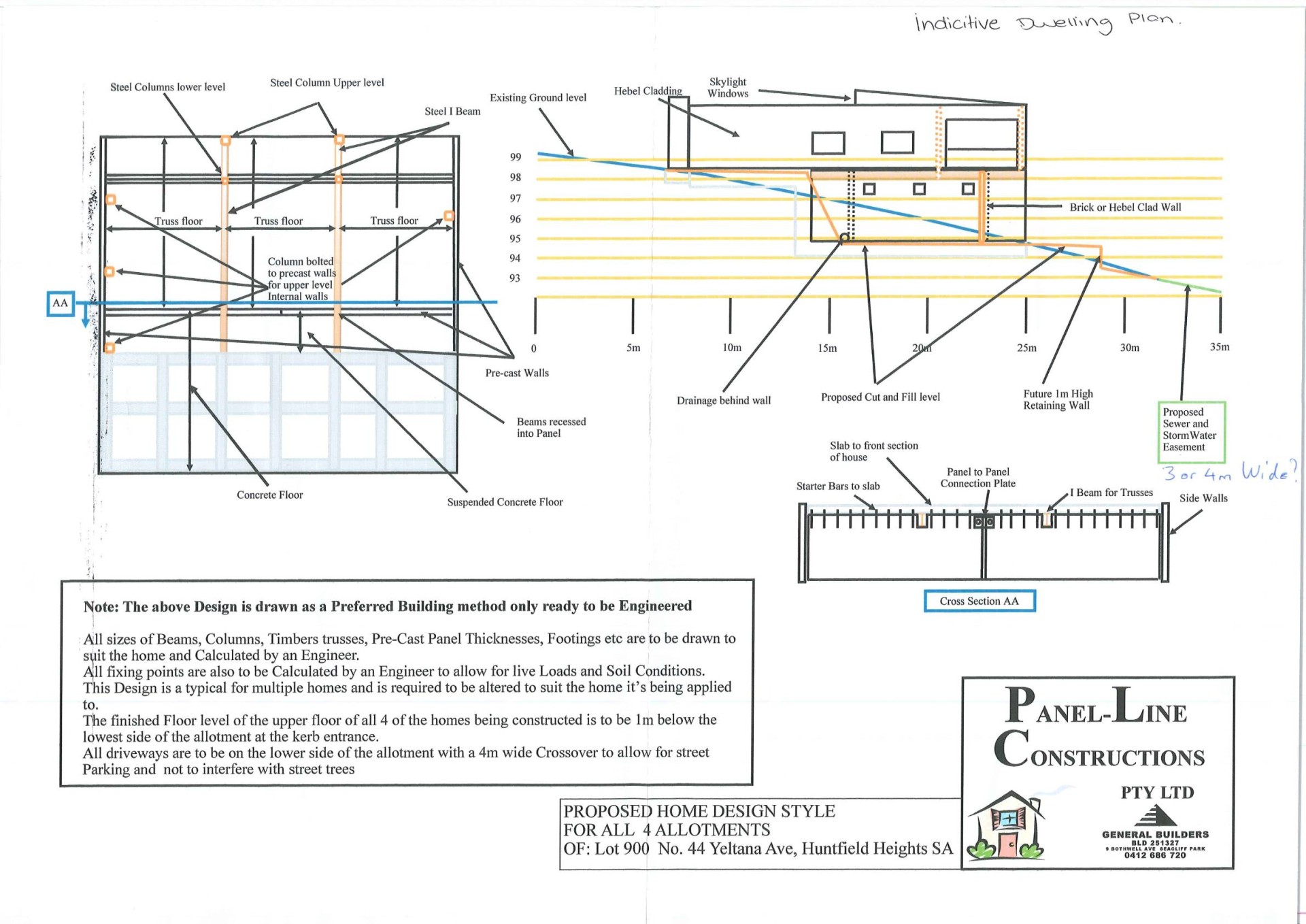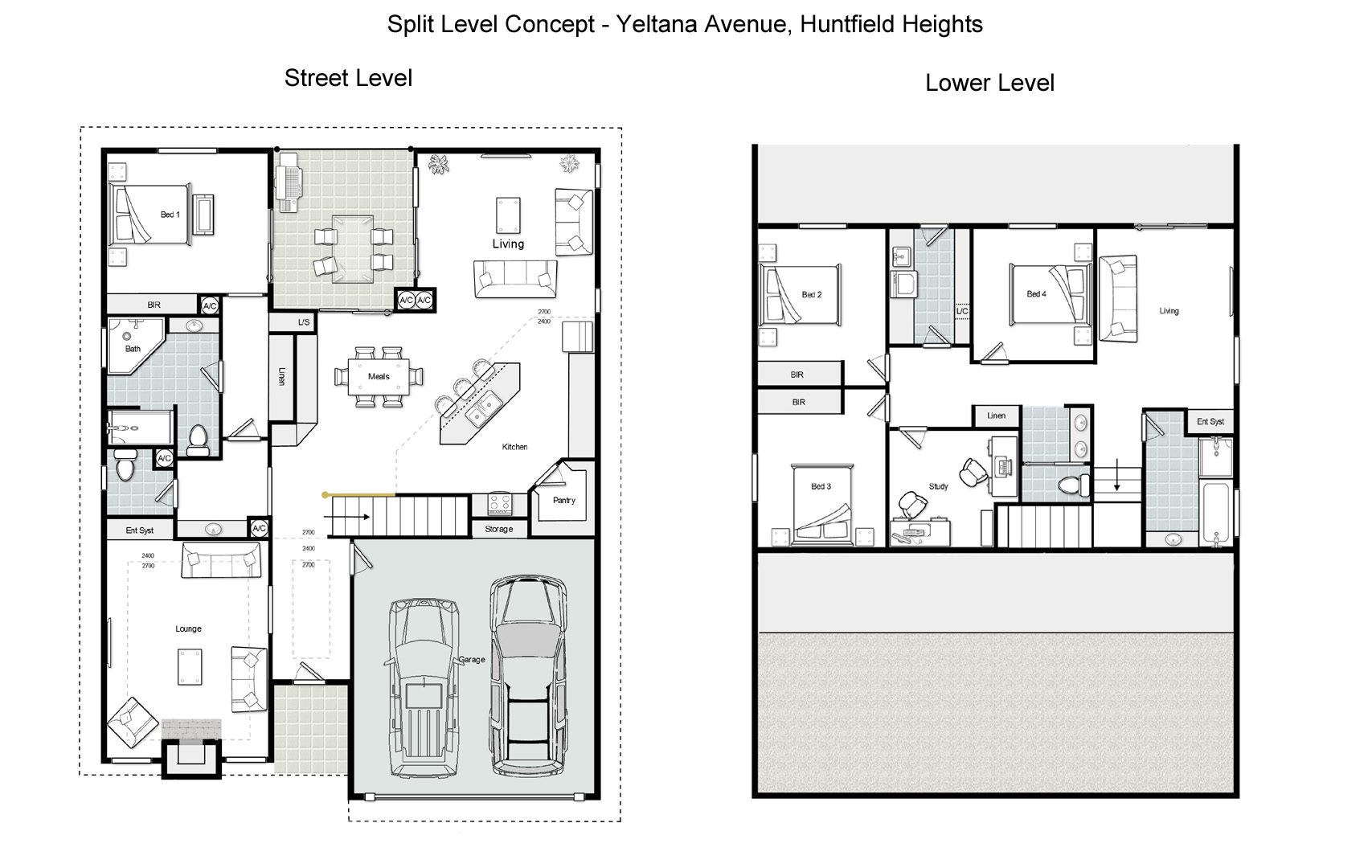 Concept designs have been prepared demonstrating how a modern split-level home can be constructed efficiently on the site, with garage access at street level and living areas opening toward the rear.