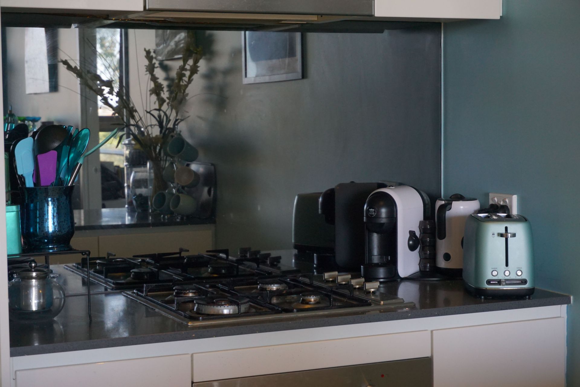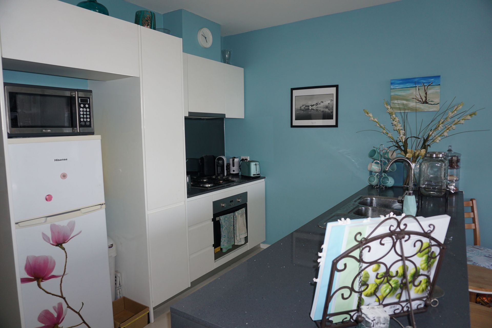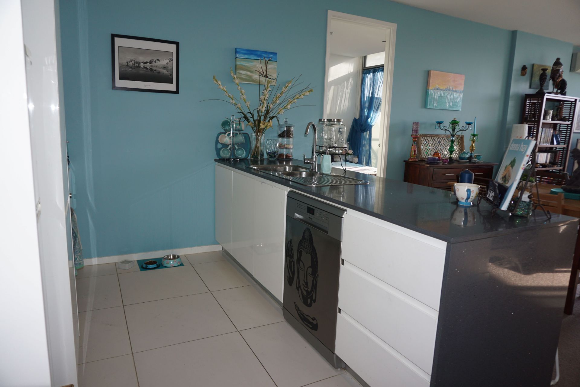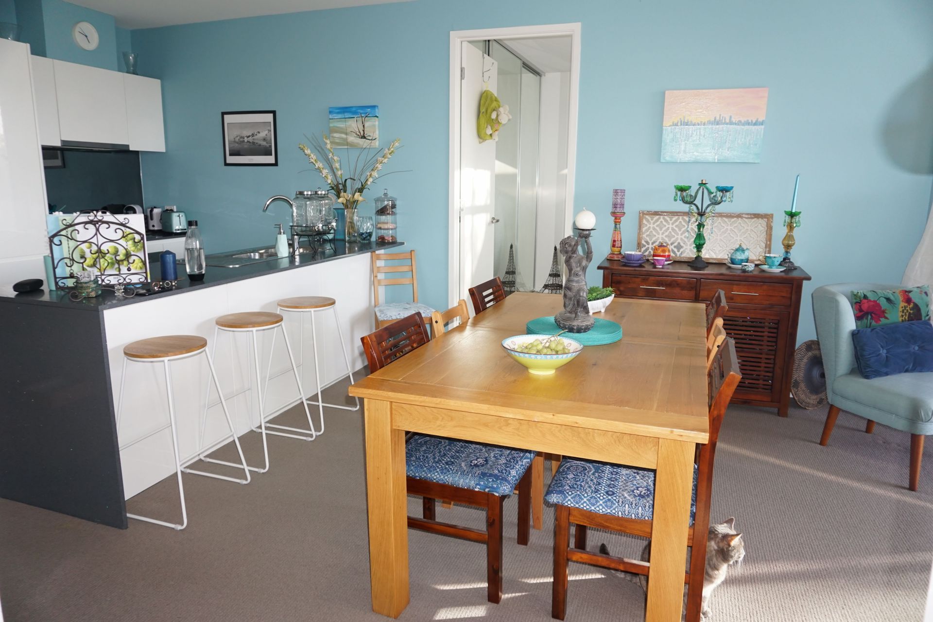 This modern kitchen has stone benchtops, stainless steel appliances, gas stove and plenty of storage space with soft close cabinets and drawers. The fridge space is larger than you'll find in most apartments. The breakfast bar easily fits 3 stools, it becomes such a social space when entertaining.