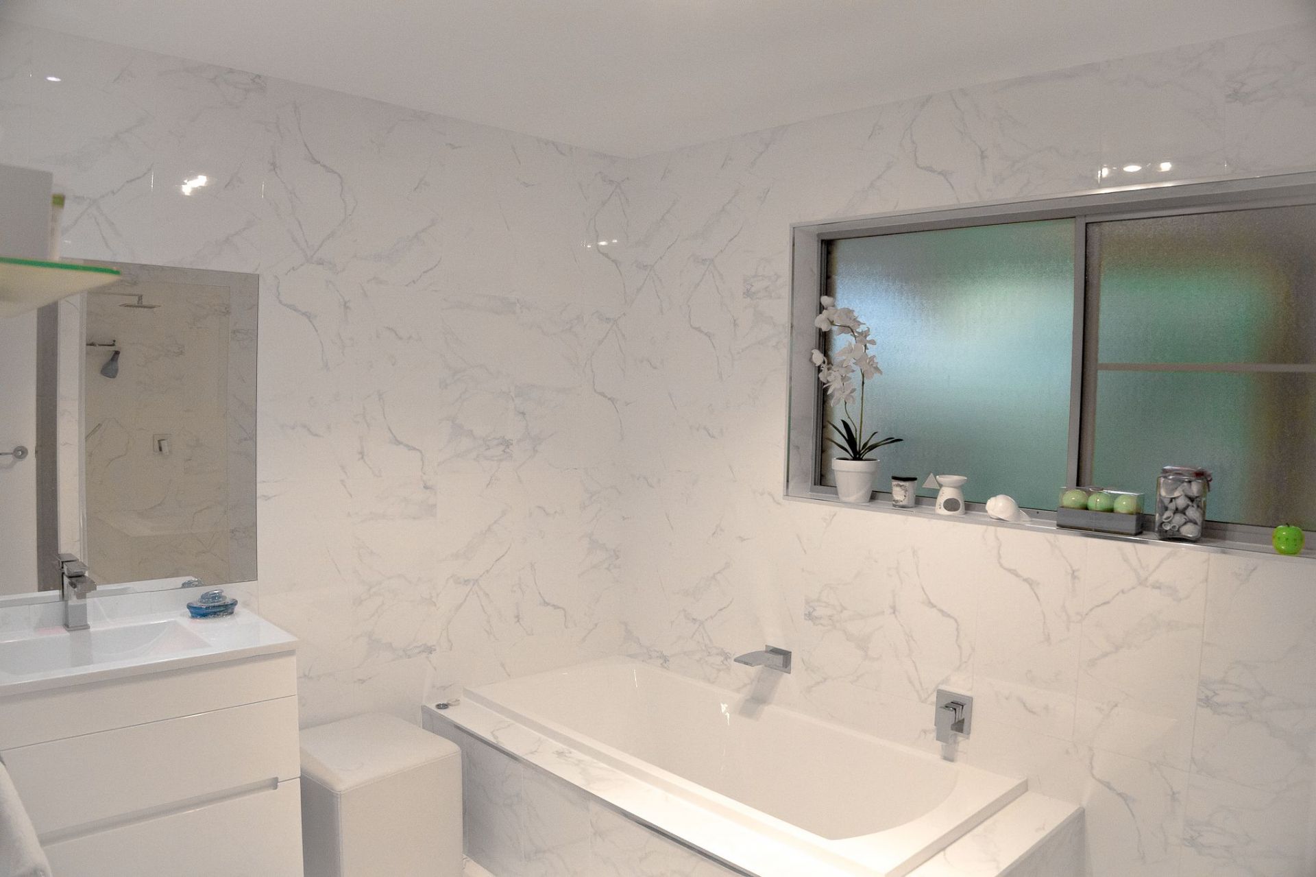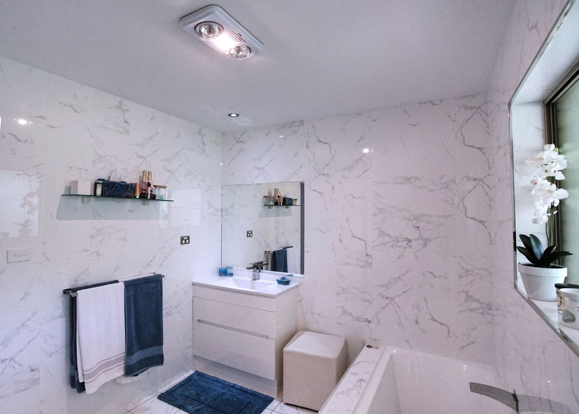 * Tiled area downstairs with an extra bathroom and separate laundry.