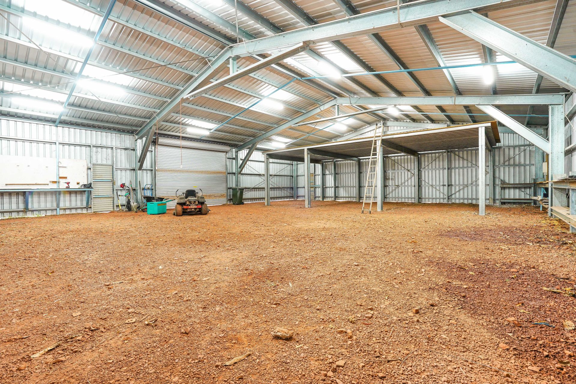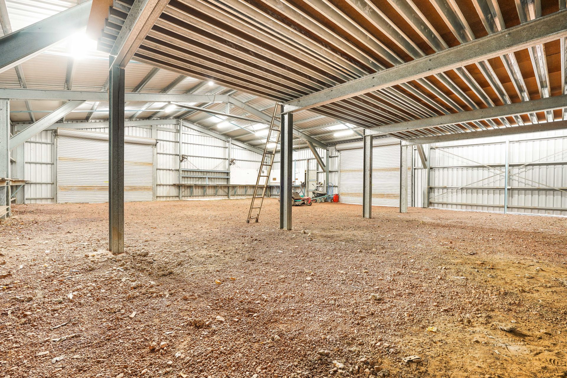 A massive steel shed is 270sqm and offers secure storage, 3 phase power, fully lockable with 2x roller doors and 2 personal access doors. Dimensions are 15mx18m with a minimum height of 3.6m reaching 5.19m at its apex. In one third of the shed exists a mezzanine floor 10mx6m at a height of 2.7m (mezzanine floor not certified but solid construction). There is a 12,000L rain water tank connected to the roof of the shed for a back-up water supply.