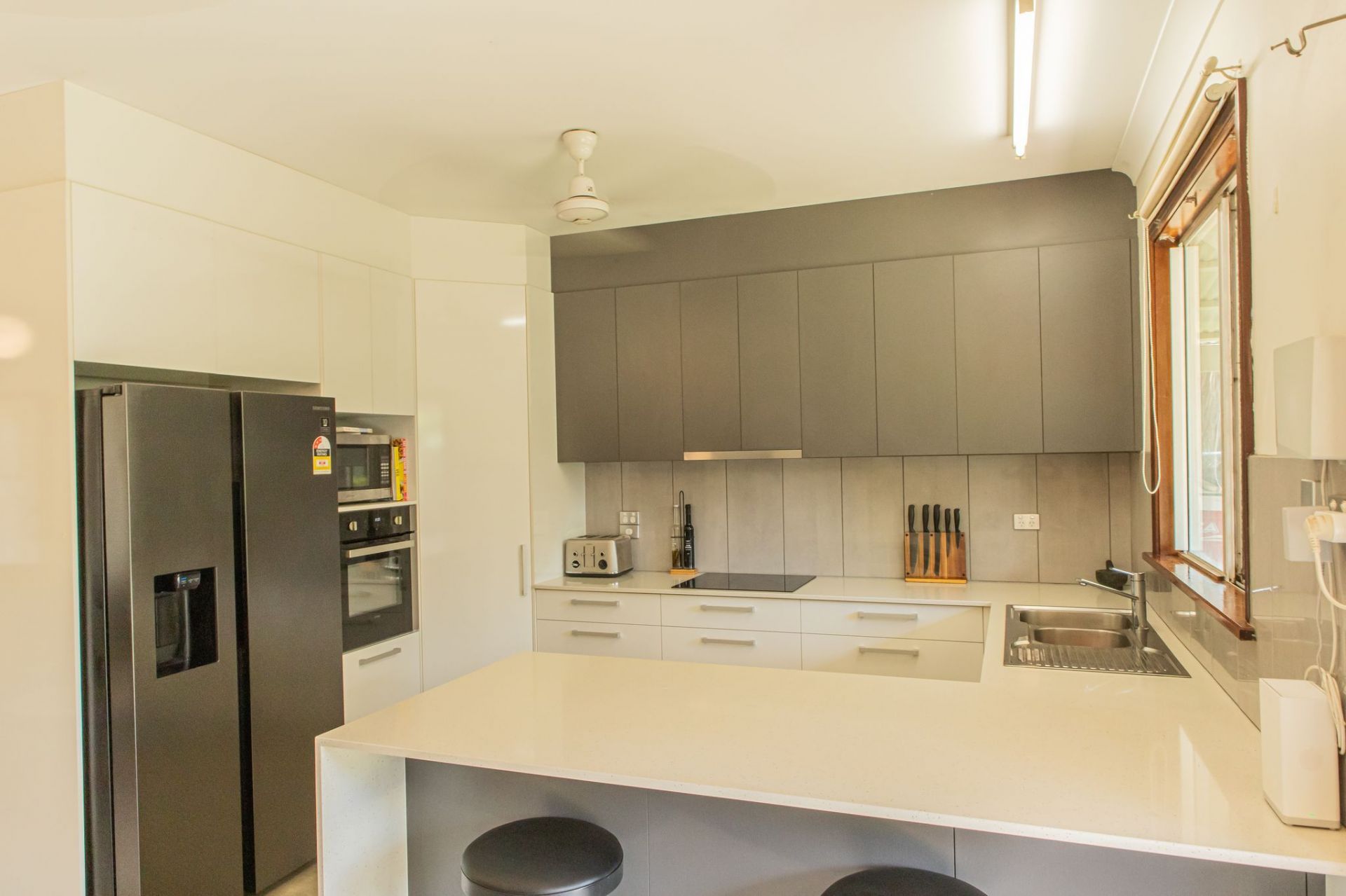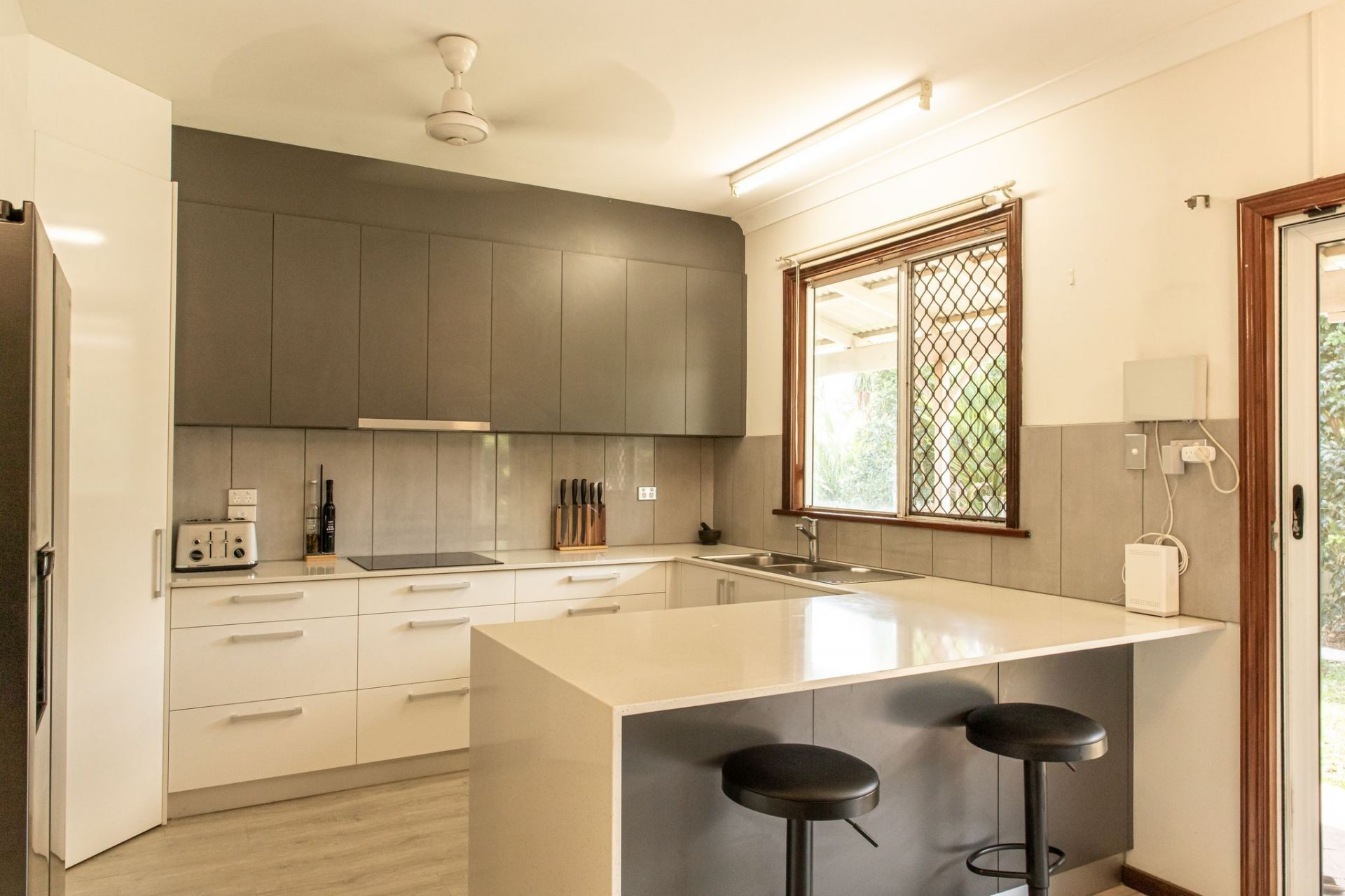 Inside is a renovated modern kitchen with wrap-around stone benchtops, soft close drawers and doors, a pantry, and a breakfast bar. Open plan living/dining with split system air conditioning.