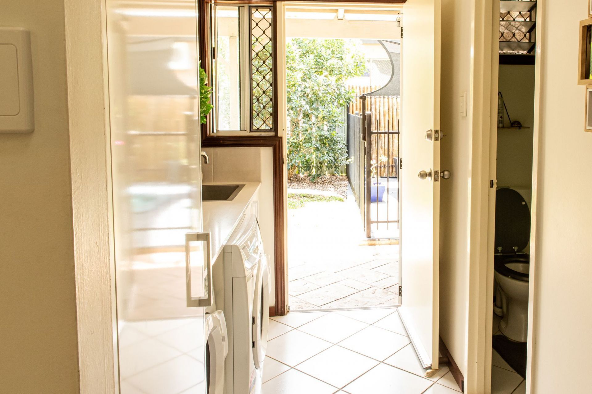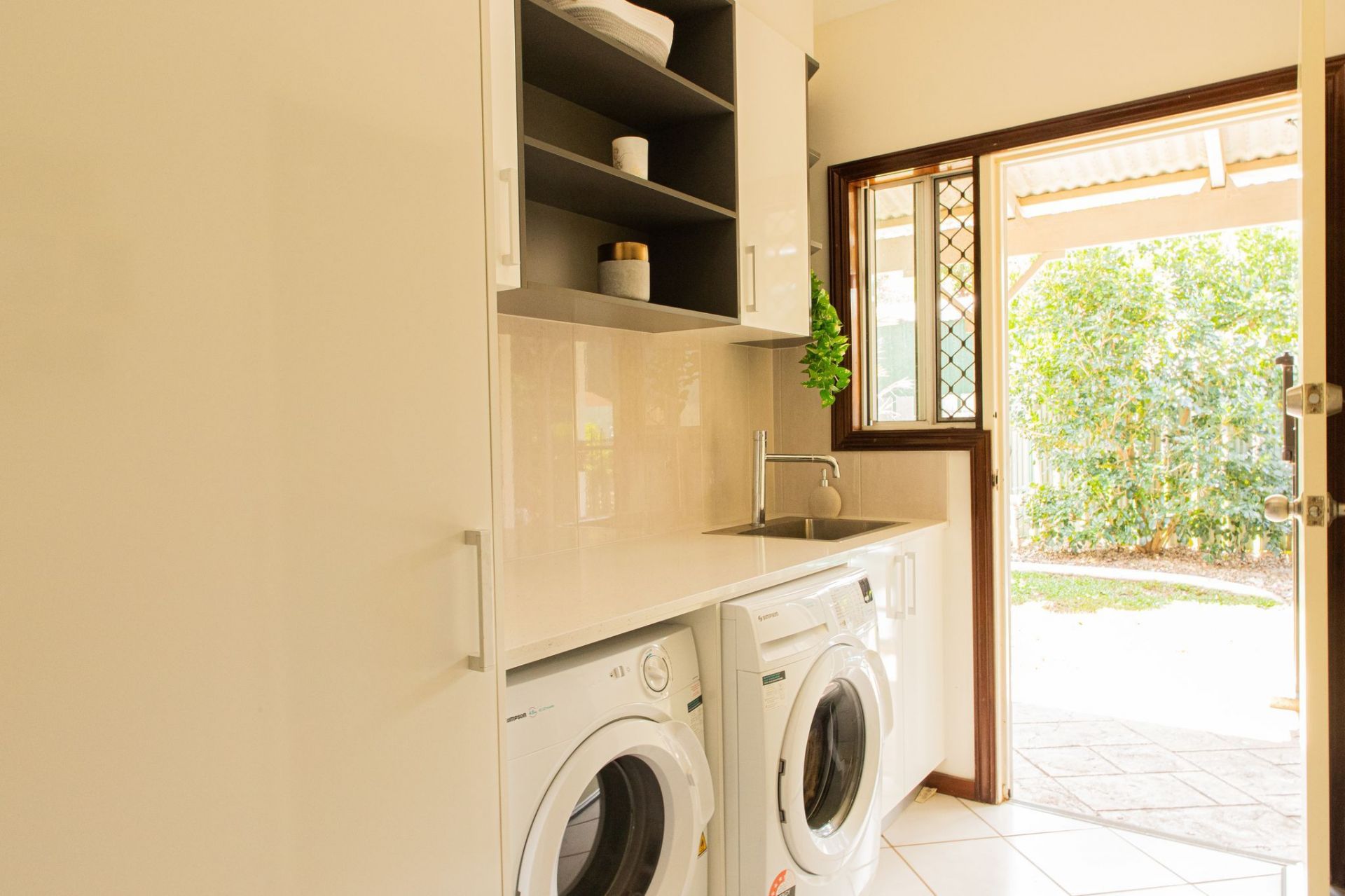 Renovated internal laundry with stone top bench soft-close doors, linen cupboard, and plenty of storage.