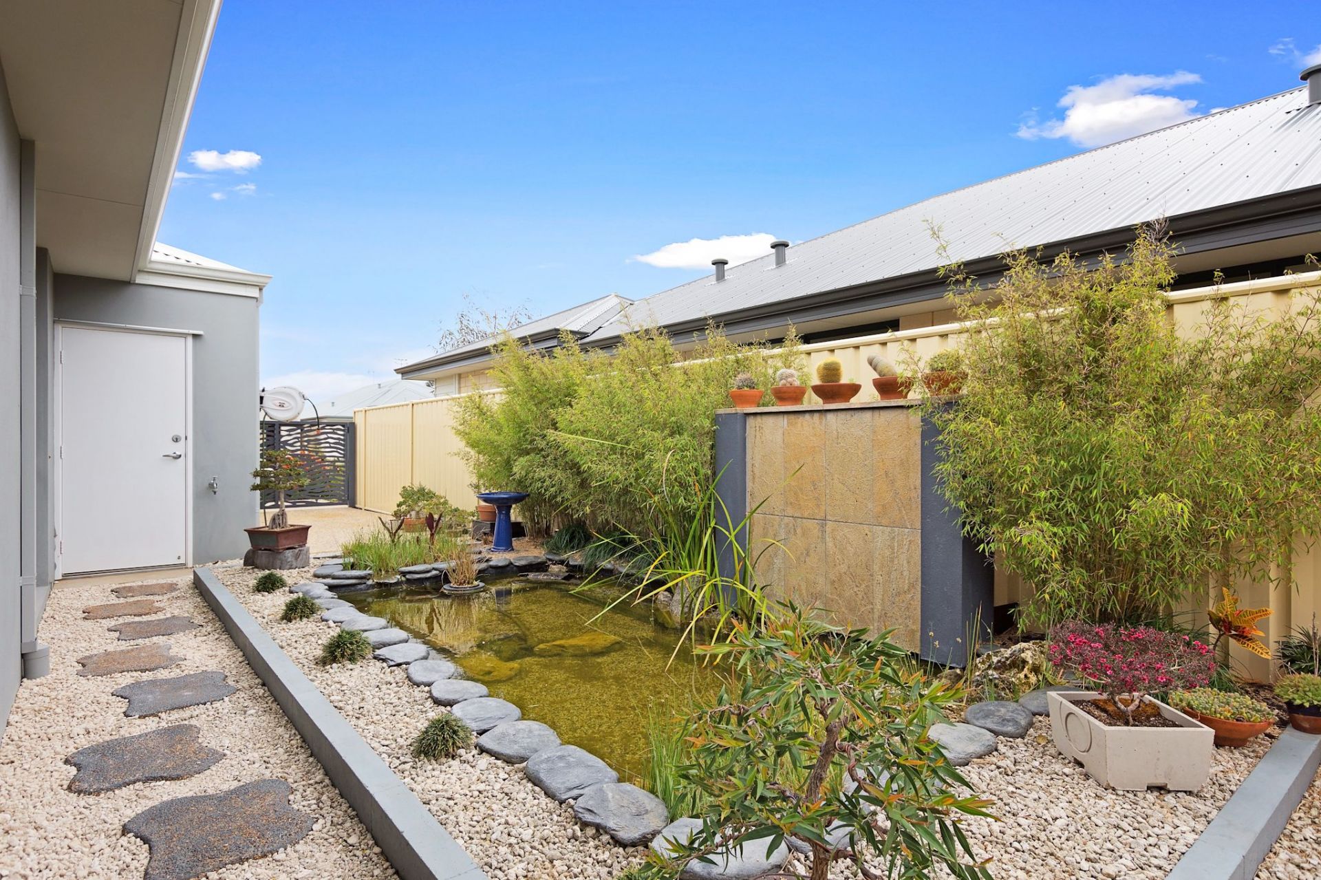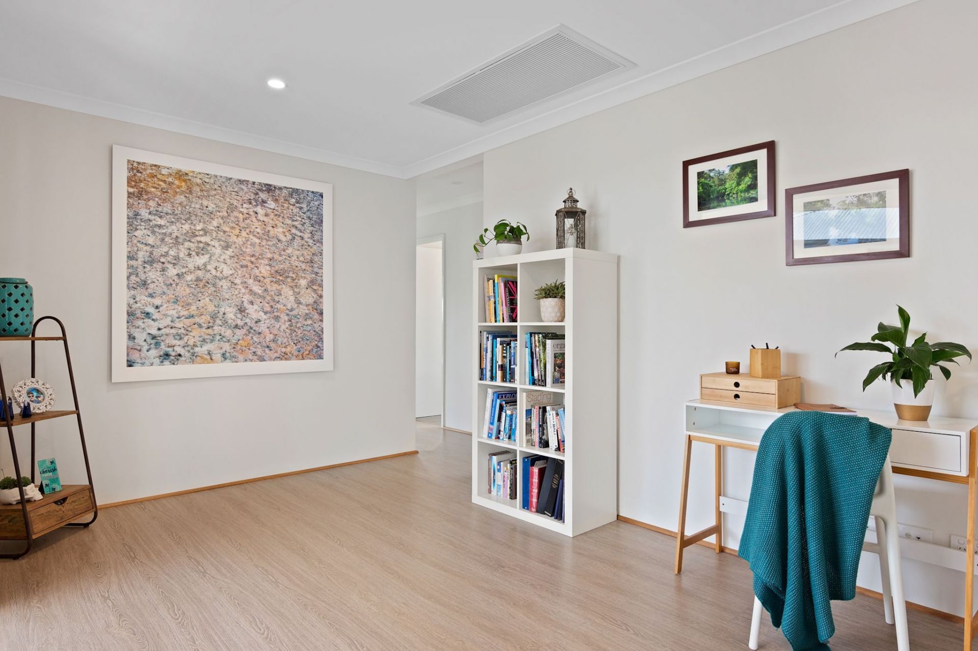 A walk through study nook or children's activity room comes off the light filled, open plan kitchen, living and dining area, which is well appointed and overlooks the tranquil pond with water feature.