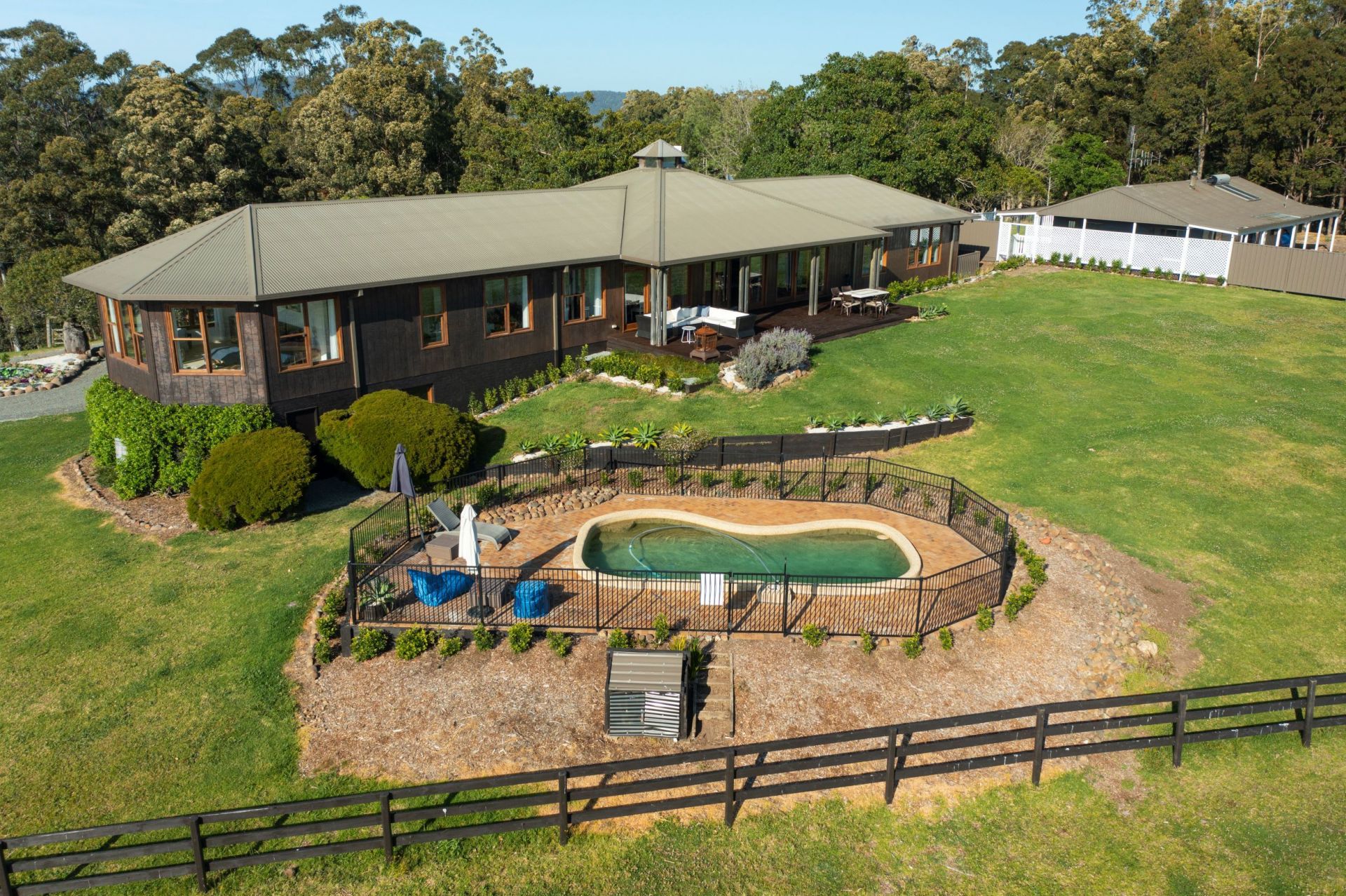 In addition, there is a modern and spacious 2 bedroom cottage complete with a new stainless steel kitchen and bathroom. Solar heated hot water and a slow combustion wood heater keep bills low while a large fully fenced backyard safeguards fur babies. There is a large wrap-around verandah and carport. The cottage has been an Airbnb favourite averaging 4.8/5 pts in reviews with frequent returning guests.