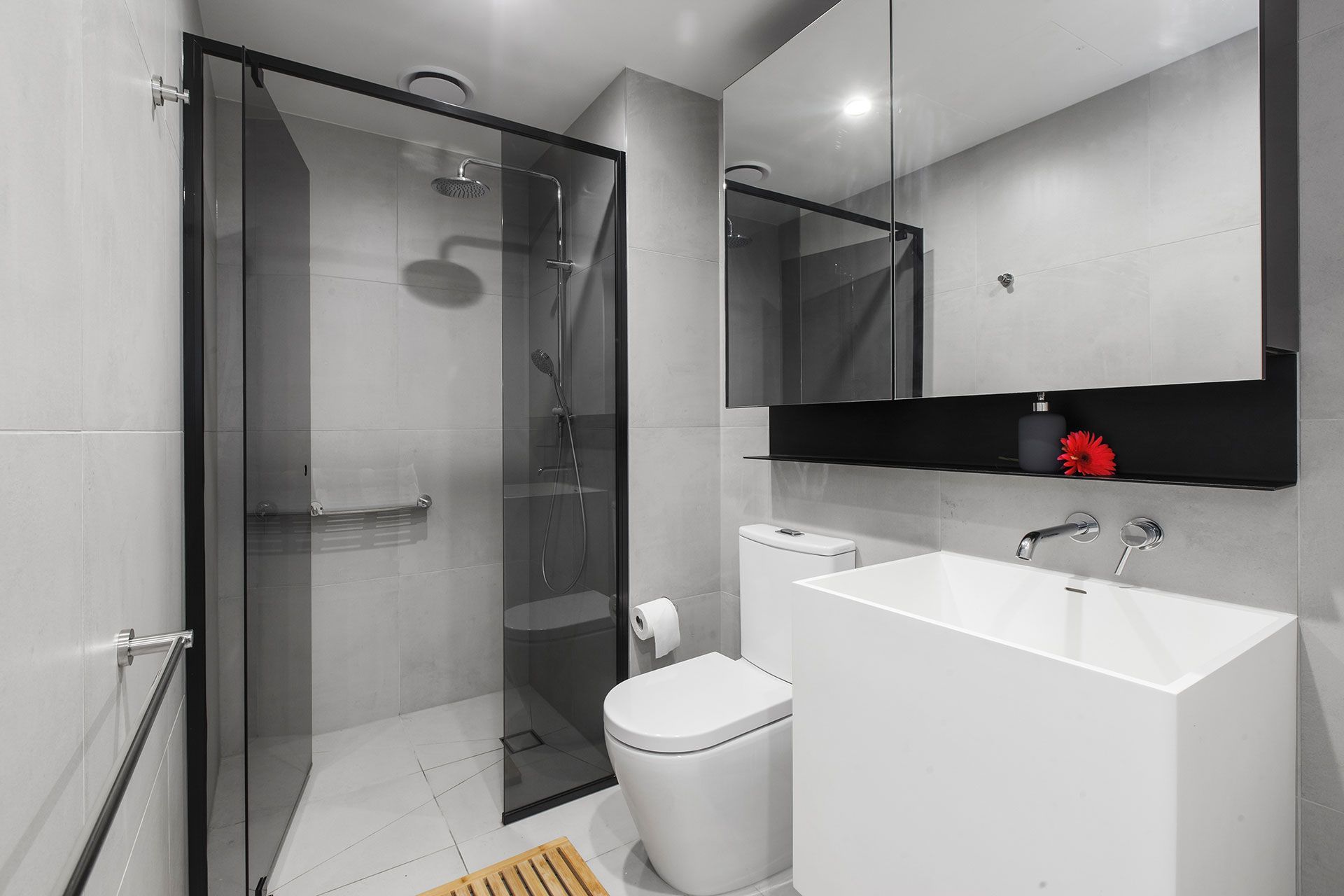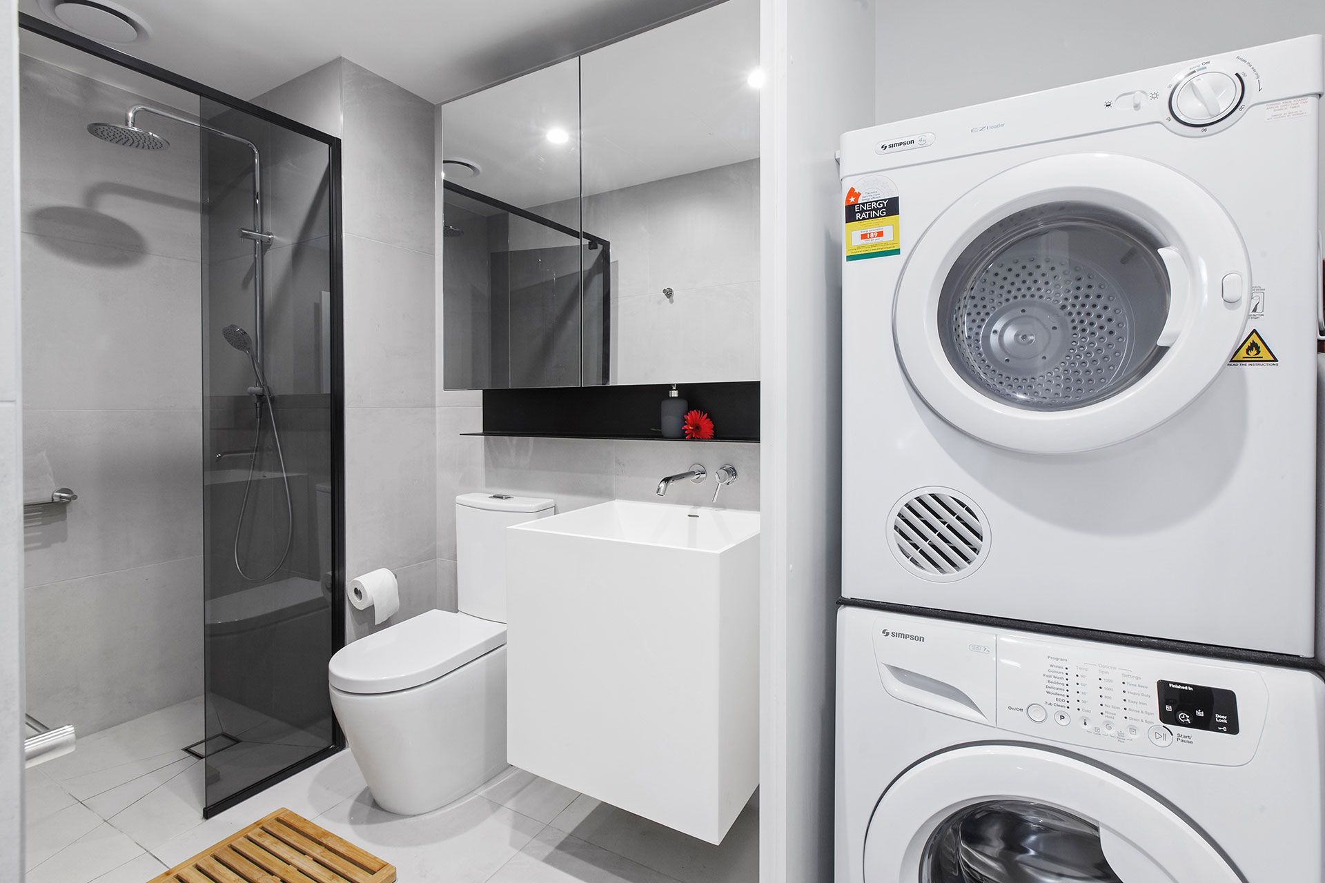 - Bathroom with large shower, vanity storage, Euro laundry