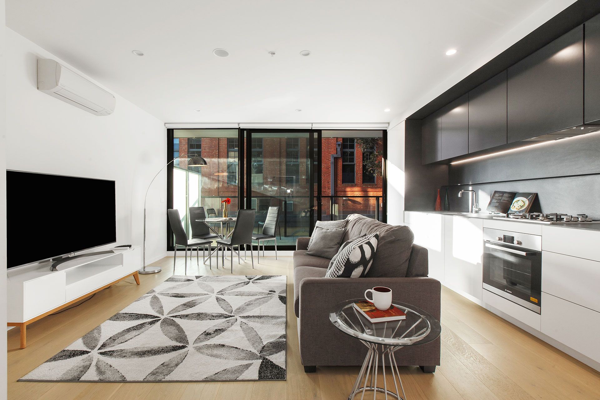- Open light-filled living/dining area with access to the balcony