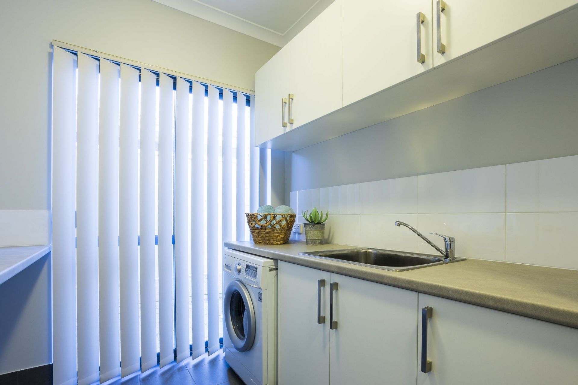 The laundry has plenty of bench space and lots of storage with the linen cupboard and overhead cabinetry.