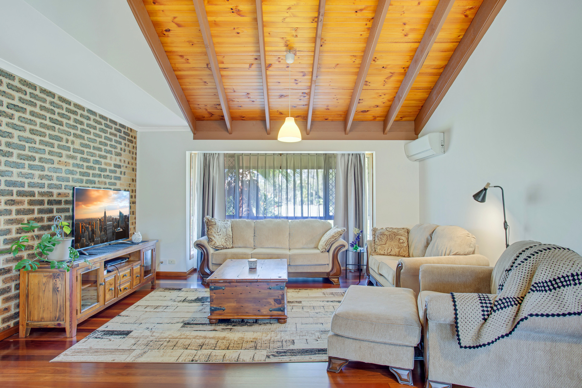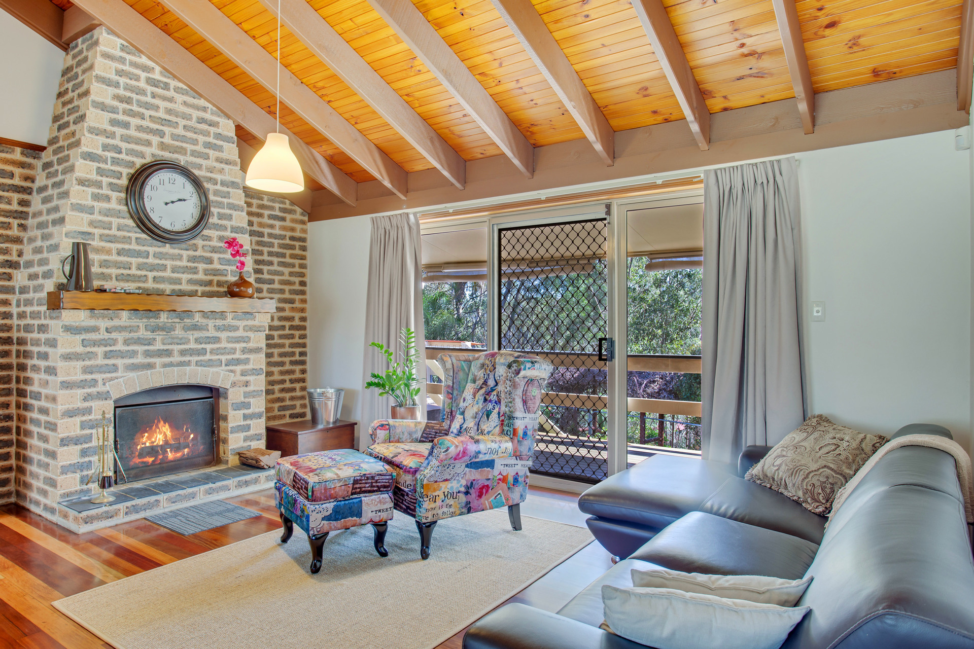 ~ Combined lounge/dinning with bay window, vaulted ceiling with exposed timber beams, ambient open fireplace with brick feature wall and sliding door access to rear veranda