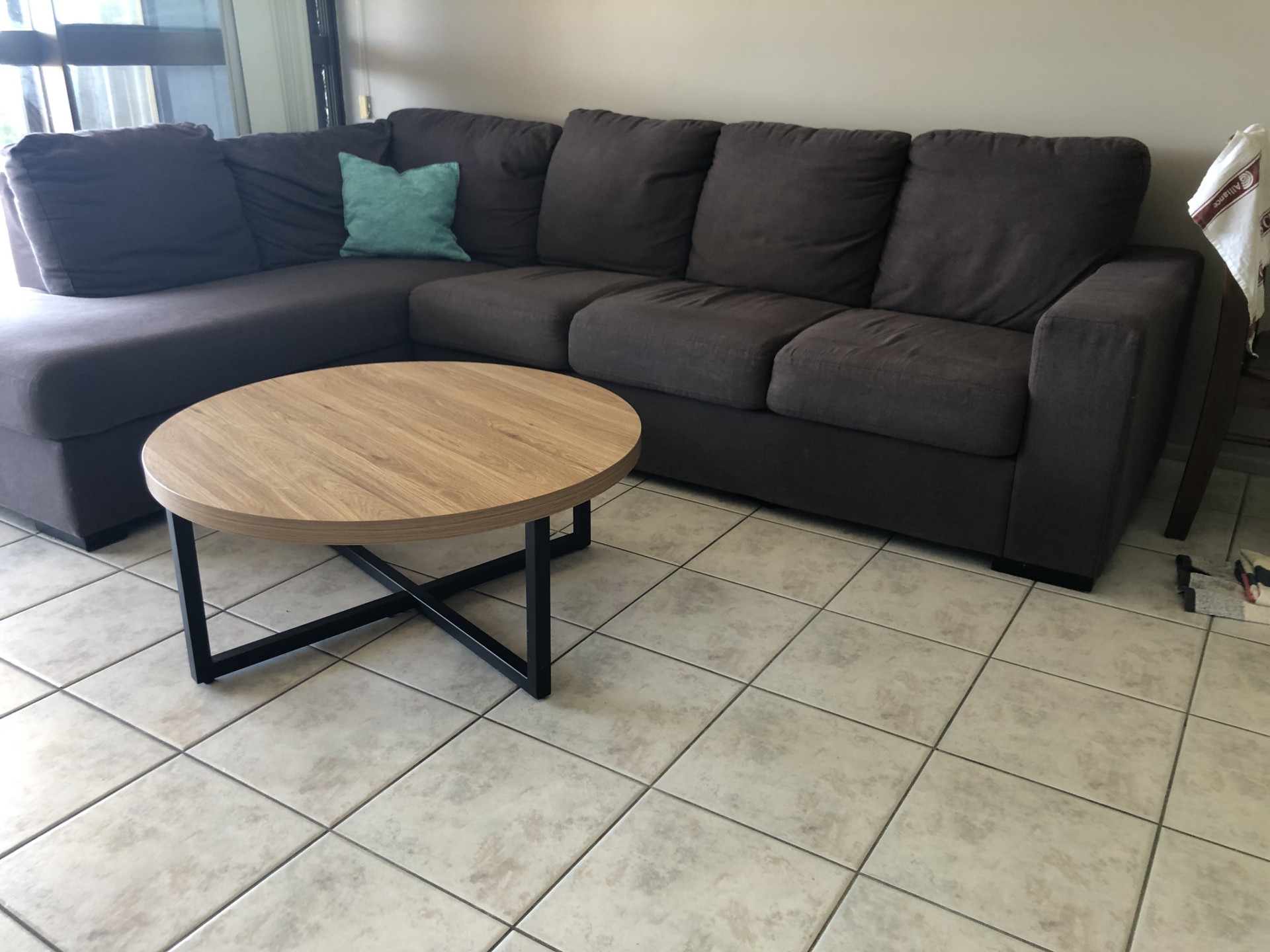 furniture included is a modular lounge, bedroom suite, table and chairs, fridge, coffee table, and single bed.