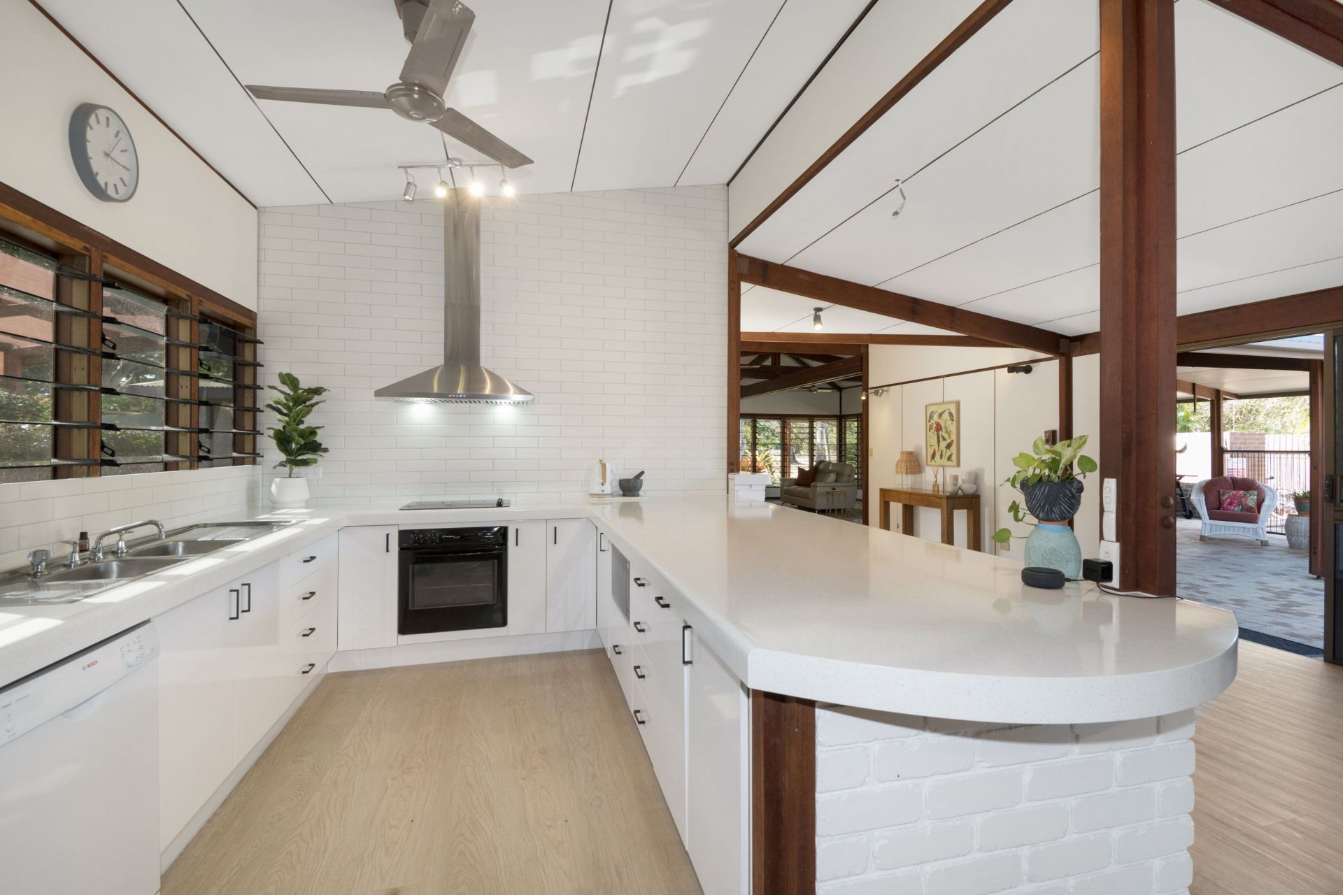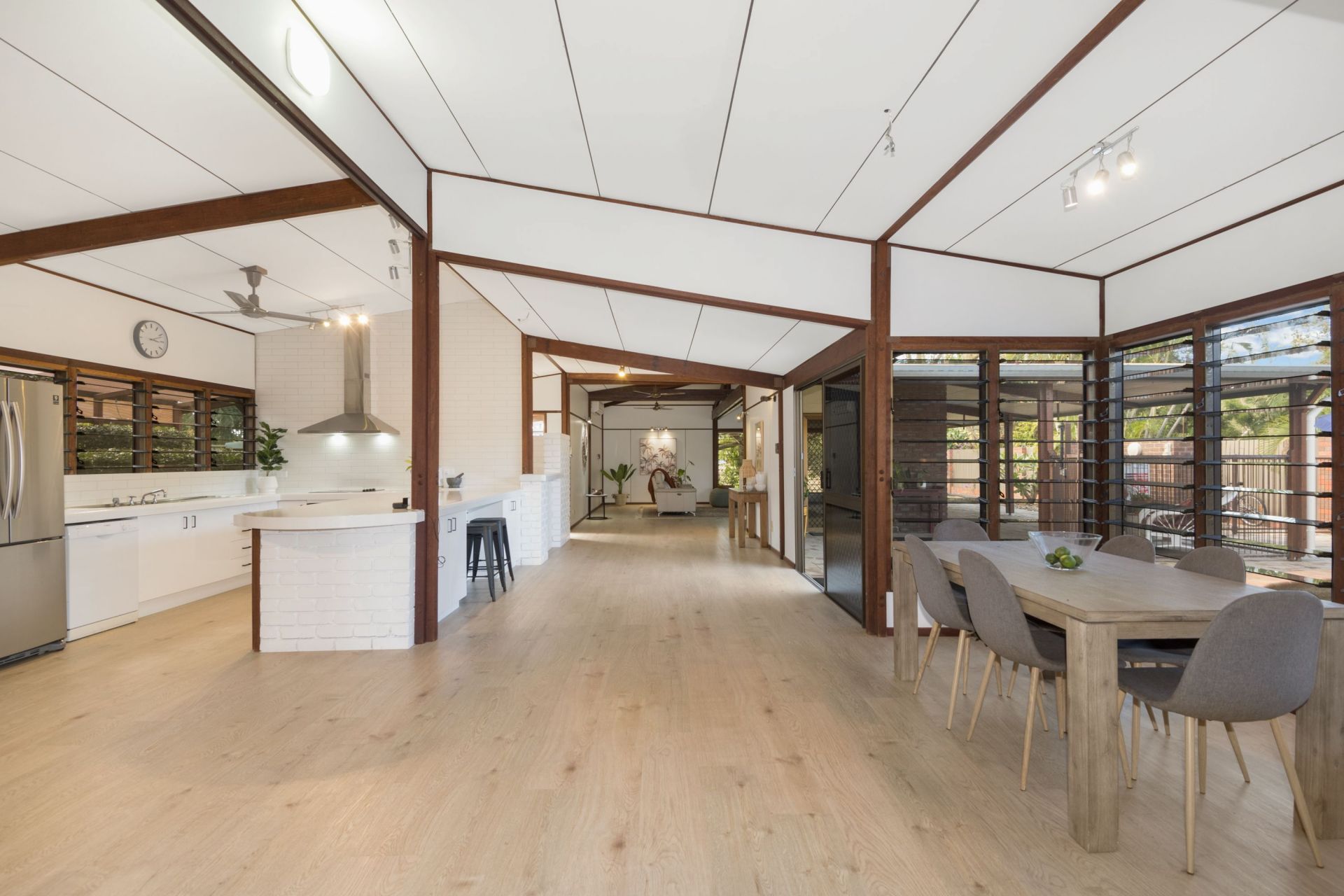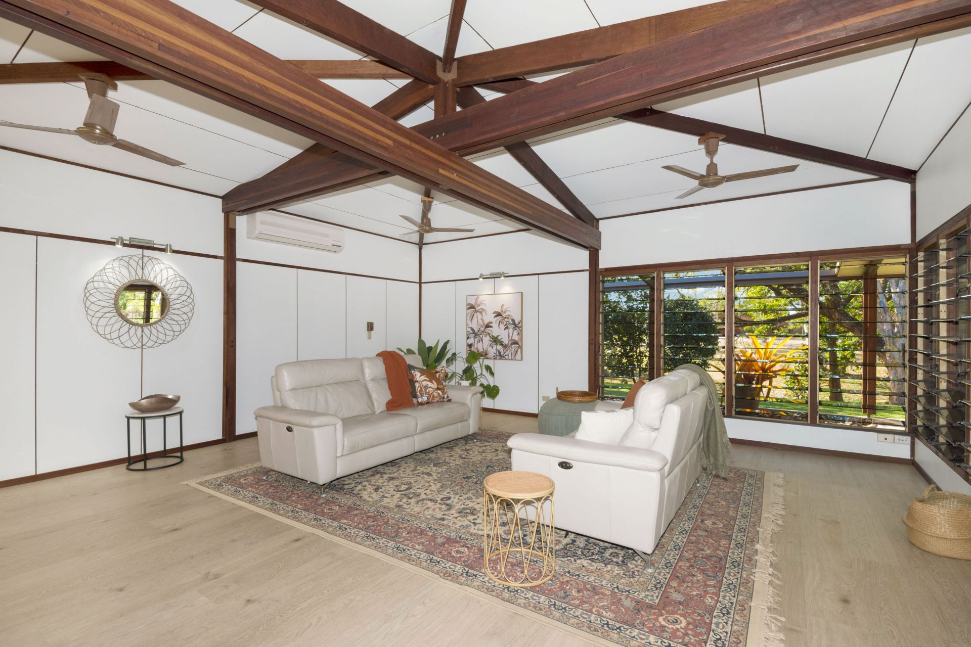 - The vast open plan design is enhanced by raked ceilings and exposed timber rafters