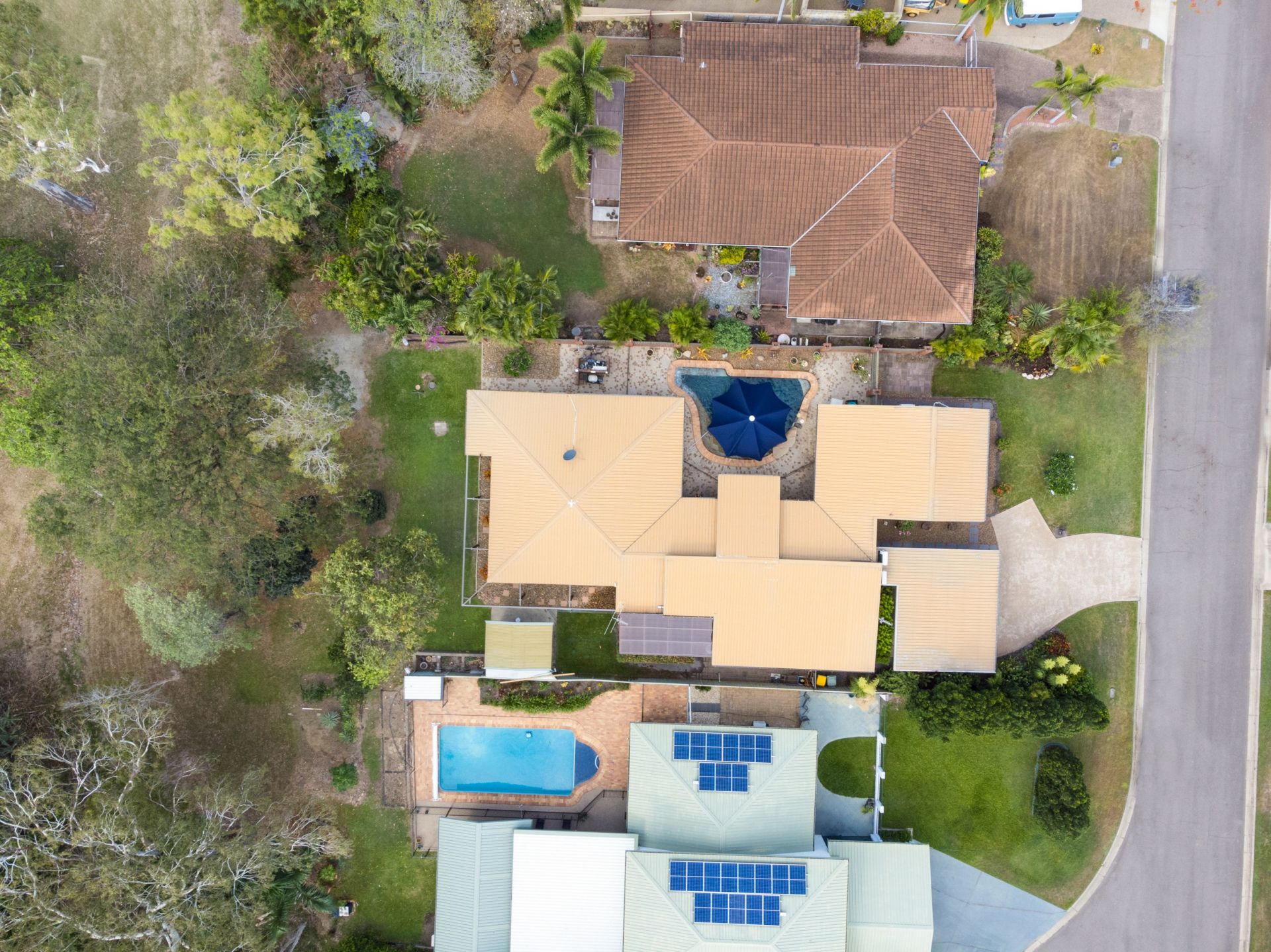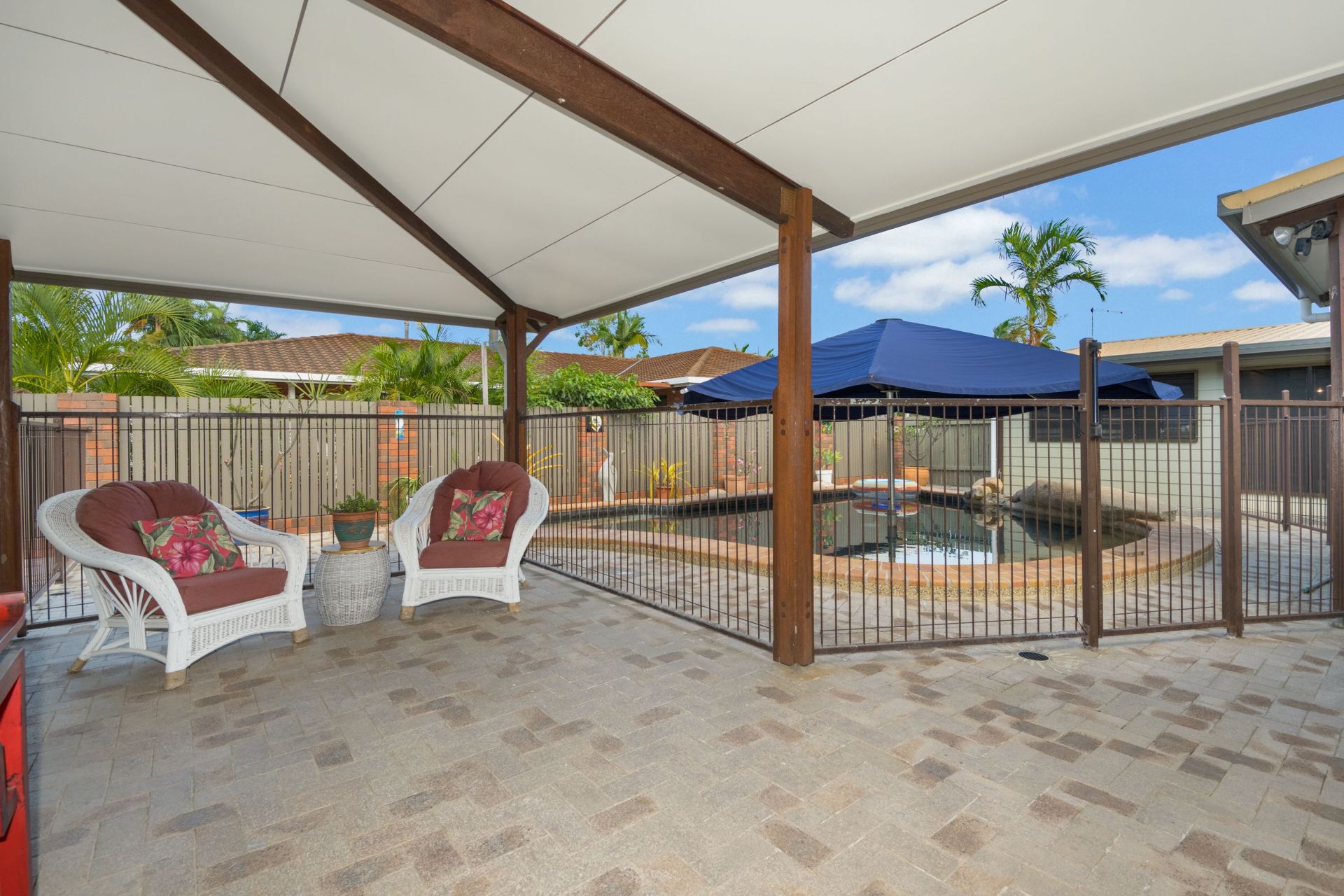 - The house wraps around a huge pool with large built-in umbrella