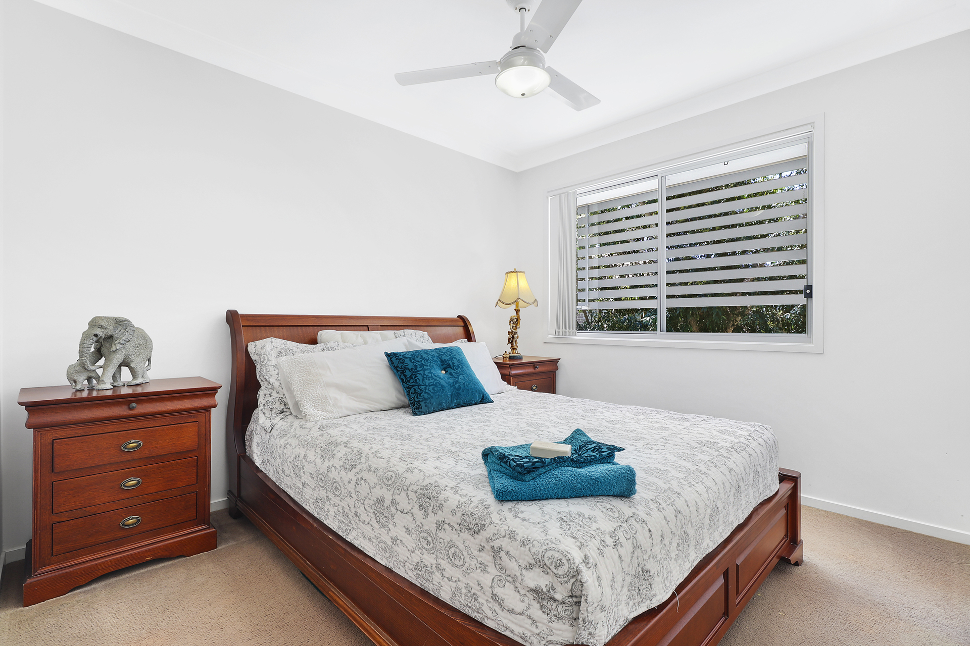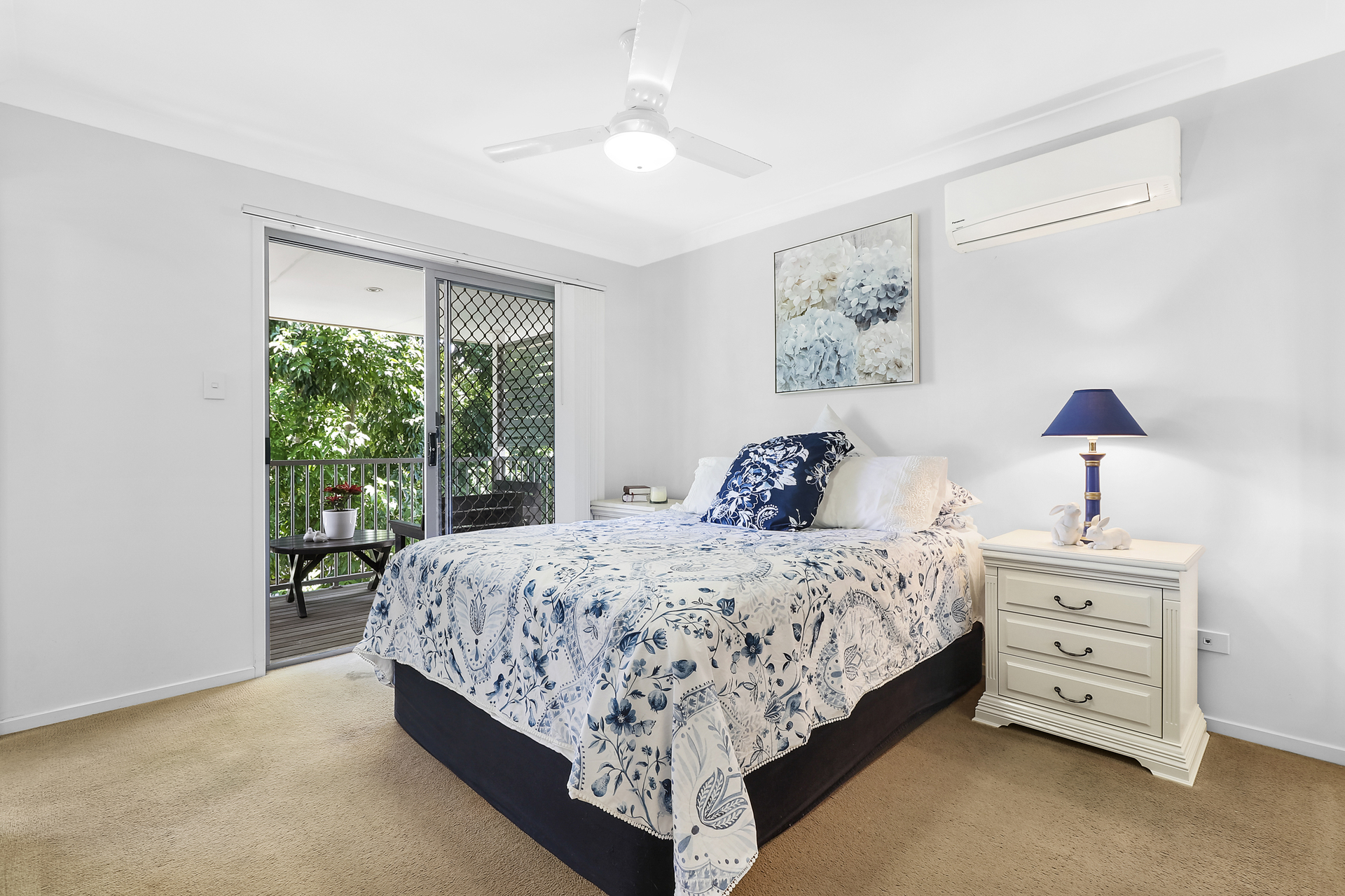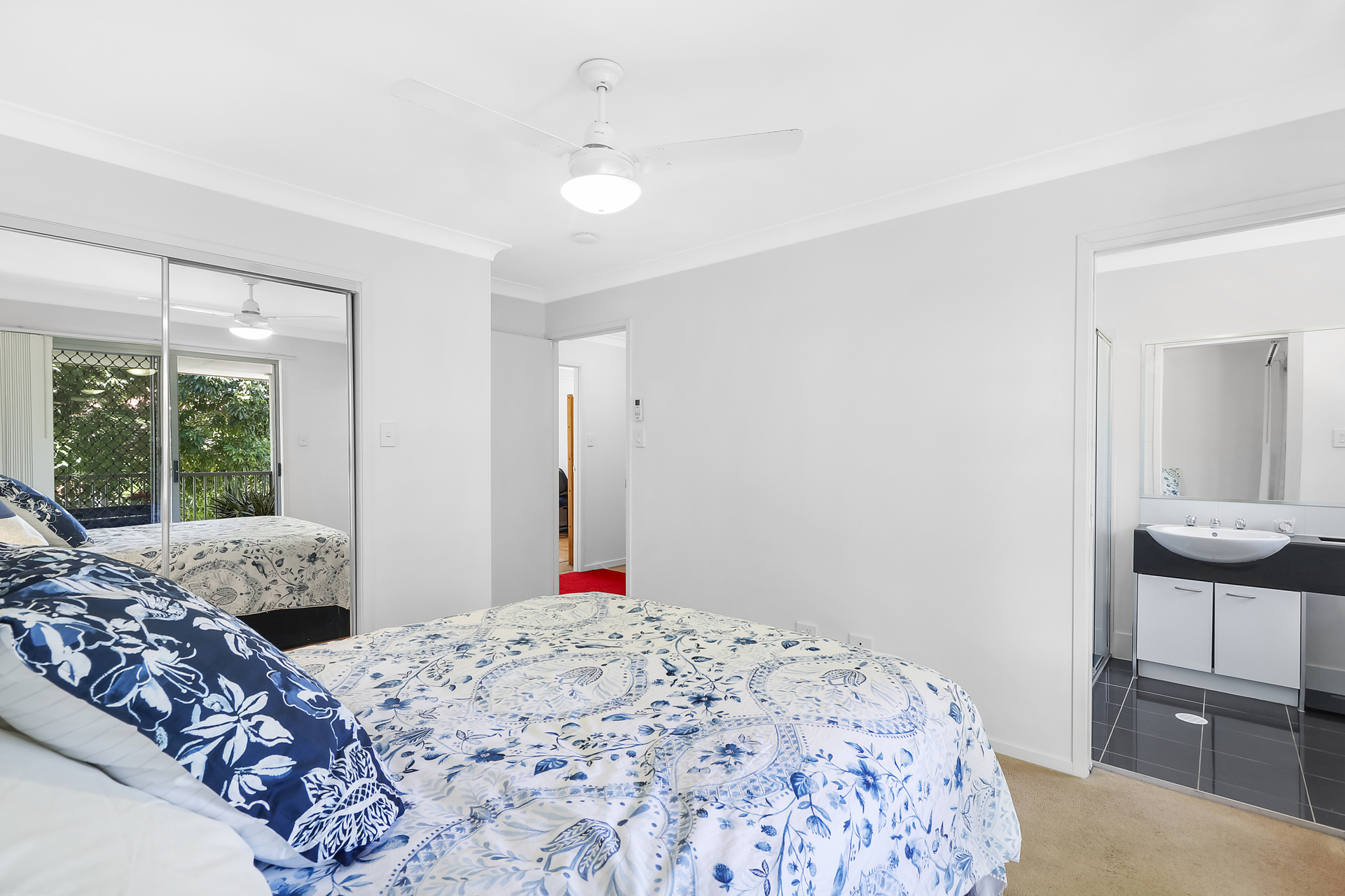 Speaking of stairs; these have newly laid high pile carpeting up to the landing. Upstairs features the master bedroom with en-suite and walk-in robe. There is a balcony from the master bedroom where you can set up your reading chair whilst you chill and take it all in. There are another 2 good size bedrooms with robes. All bedrooms have ceiling fans.
