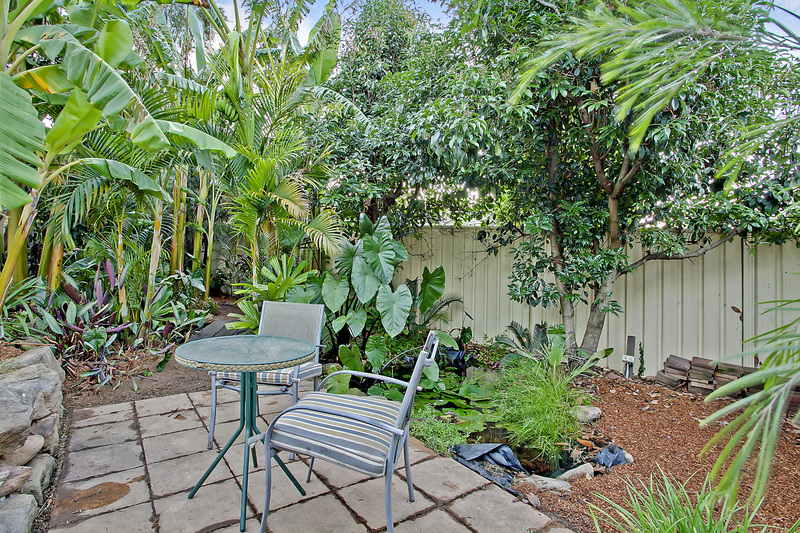 * Lush tropical garden area with waterfall and stream.