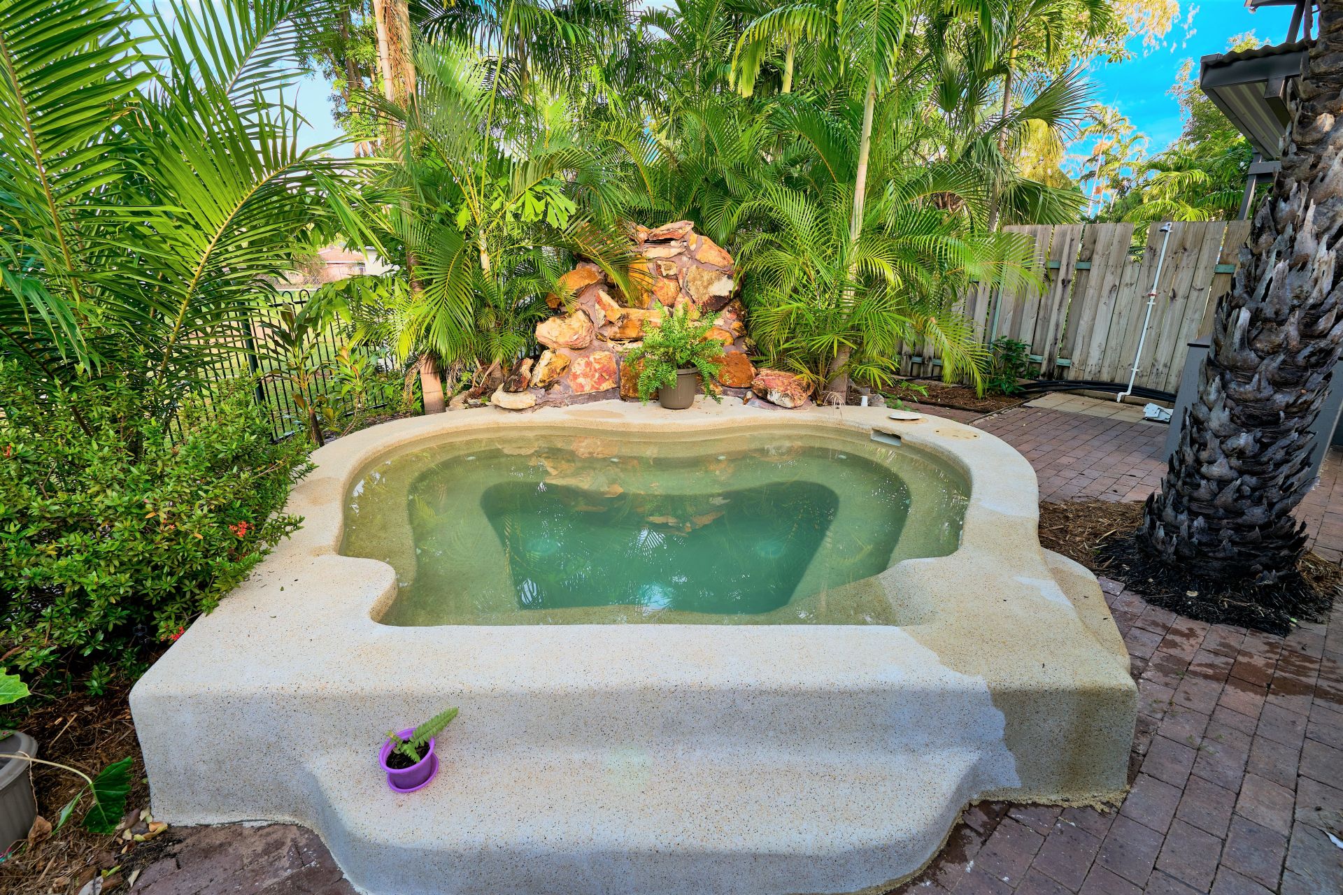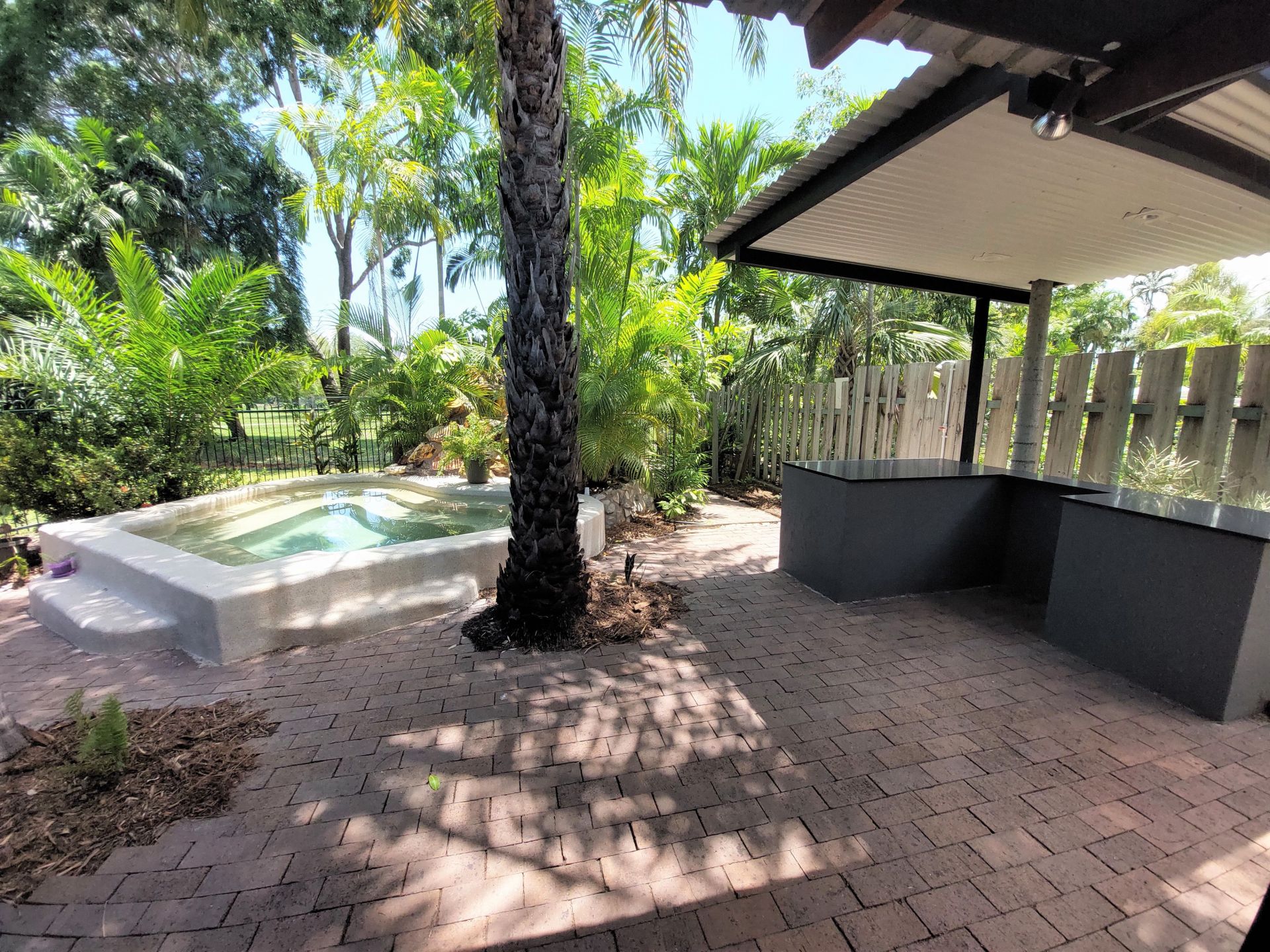 This family home has a sensational outdoor entertaining area with a large Tropical spa and stone bench top BBQ and entertaining area.
