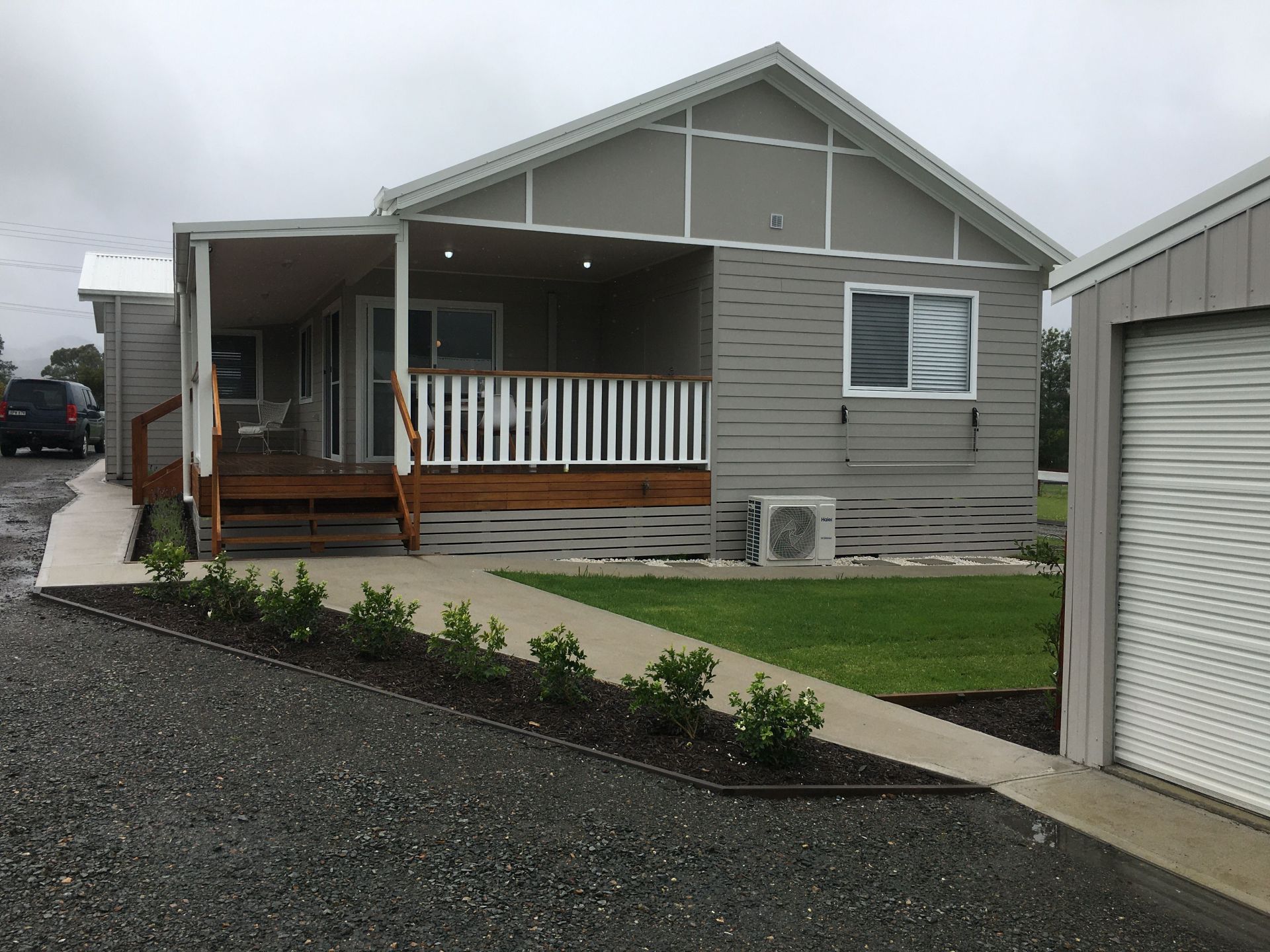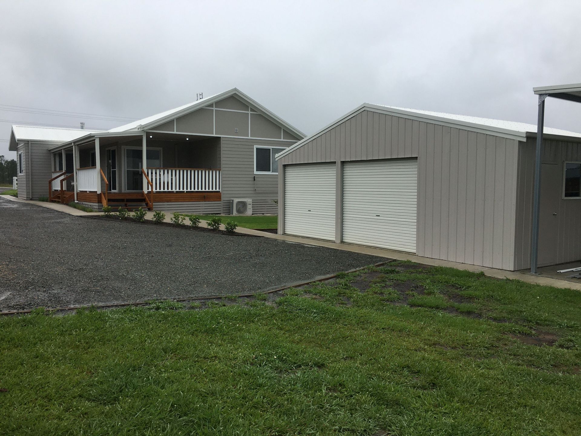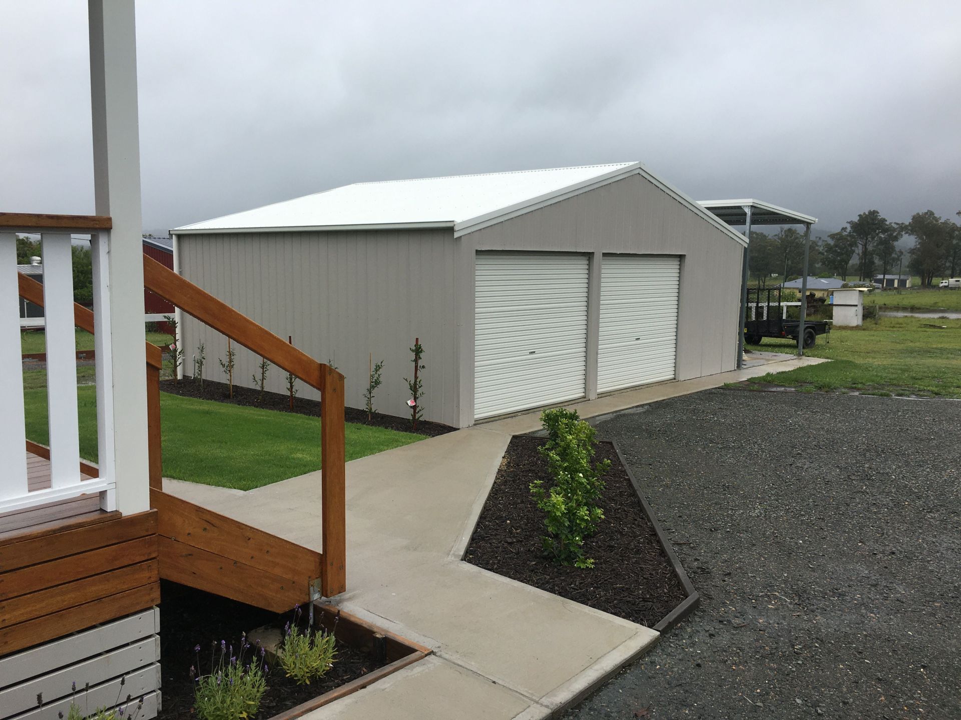 7 metre x 10 metre garage with high roof carport to suit motor home or caravan.