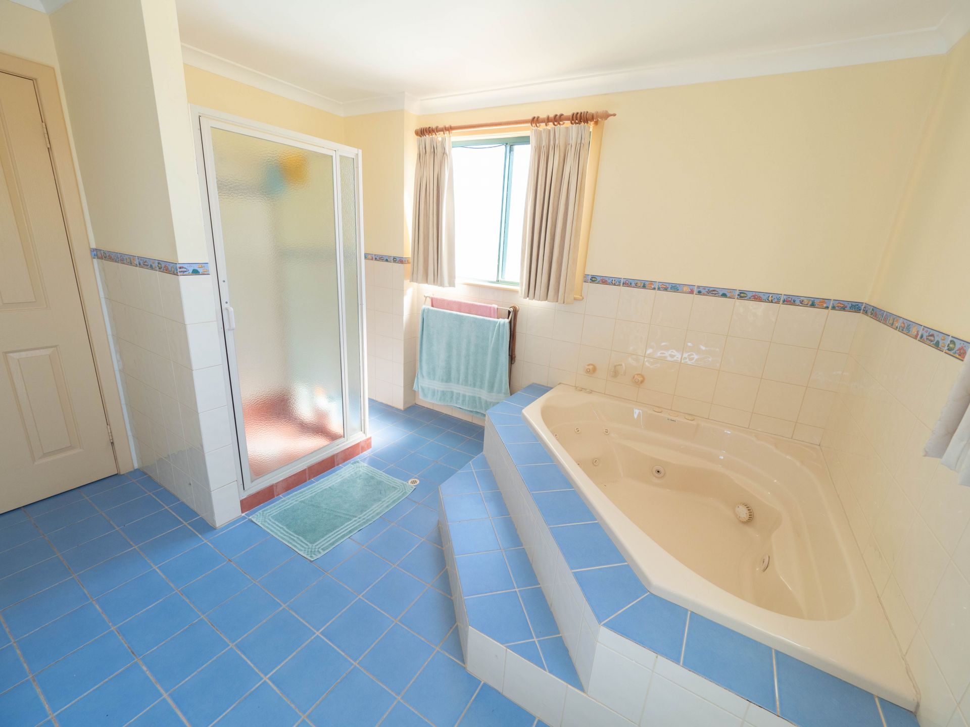 • Large bathroom with spa bath, shower, and double vanity