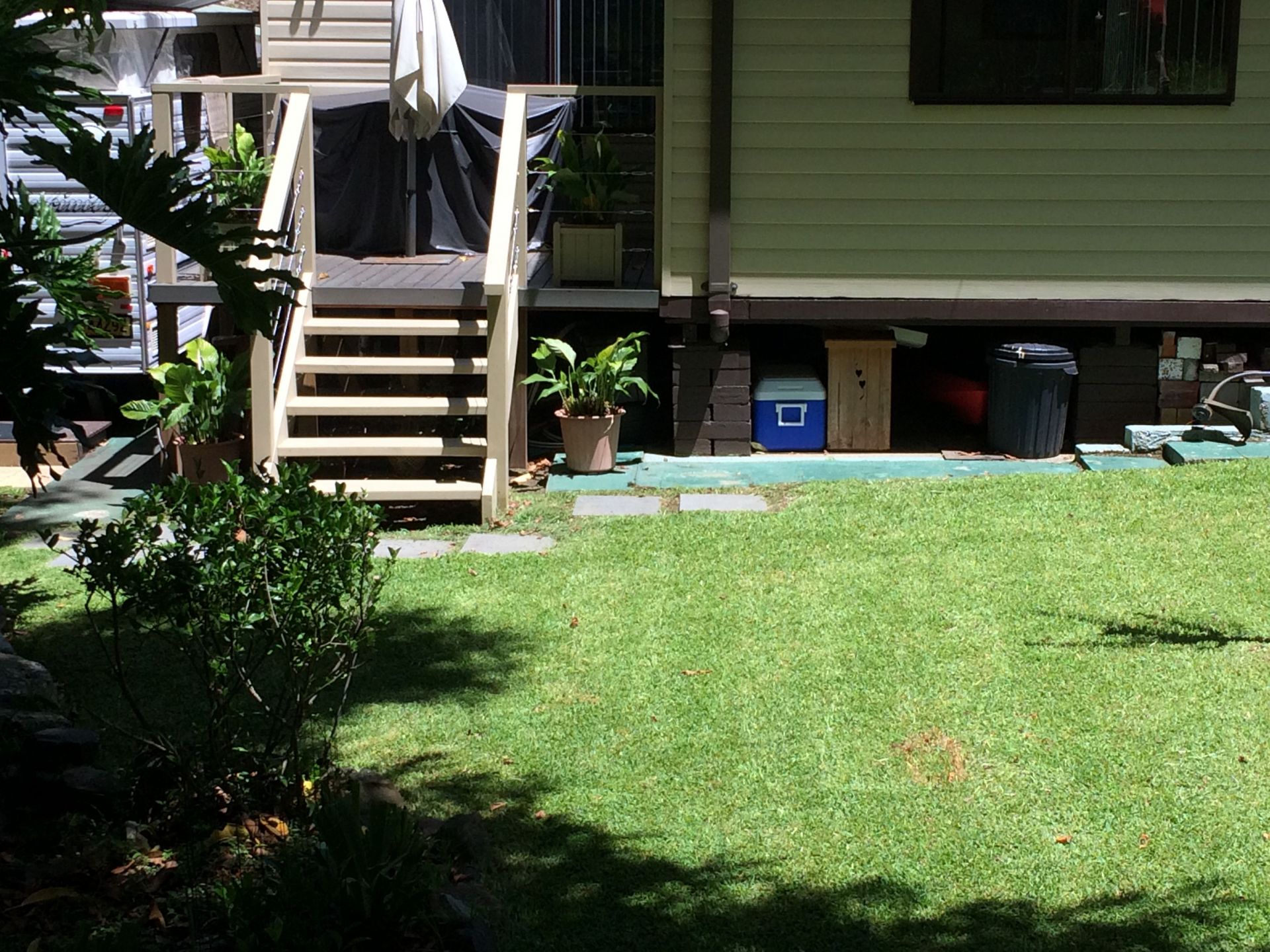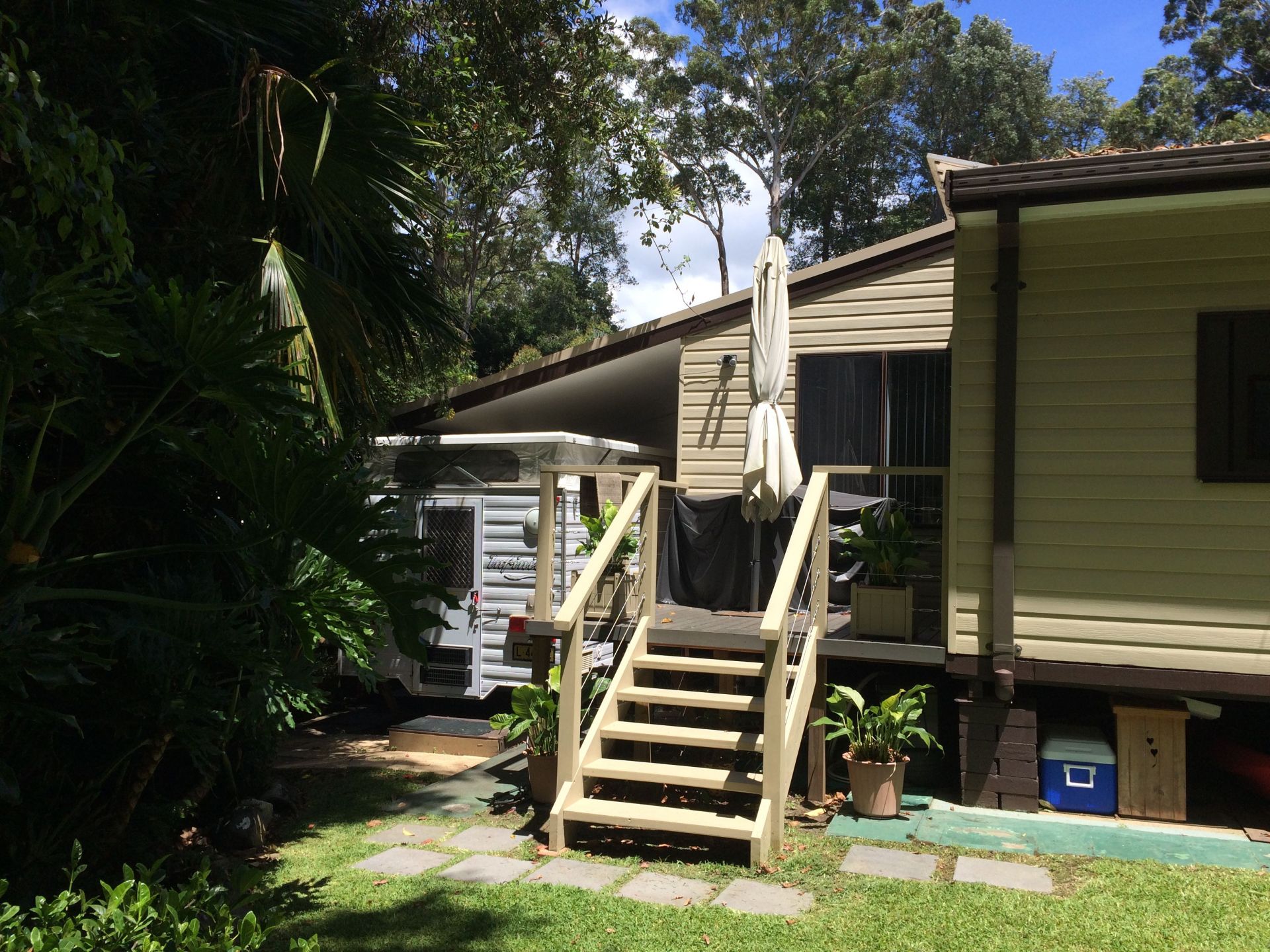 • The carport on the side of the house is long and high enough to house your caravan or motorhome (when you're not travelling) as well as two cars. There is even room for a small boat and trailer on the other side of the house.