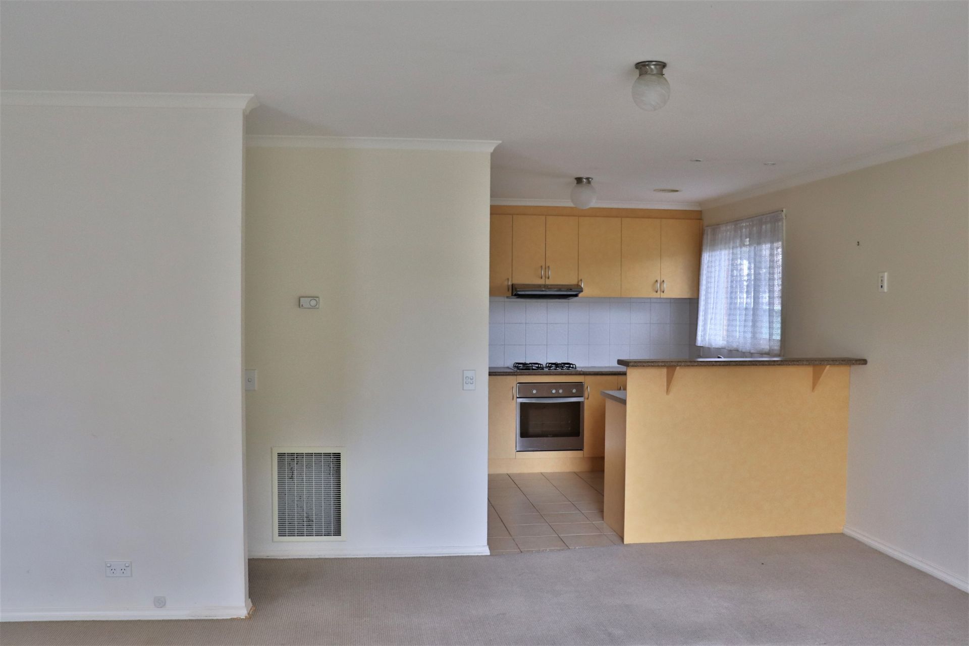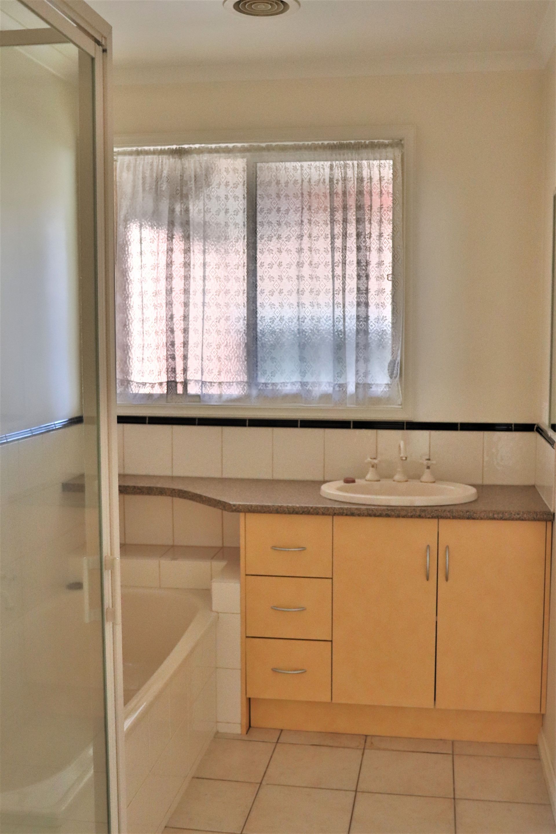 The bathroom, with separate shower & bath, the laundry, toilet and kitchen areas are all tiled, with the remaining areas carpeted.
