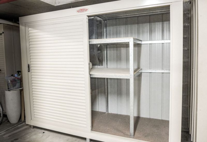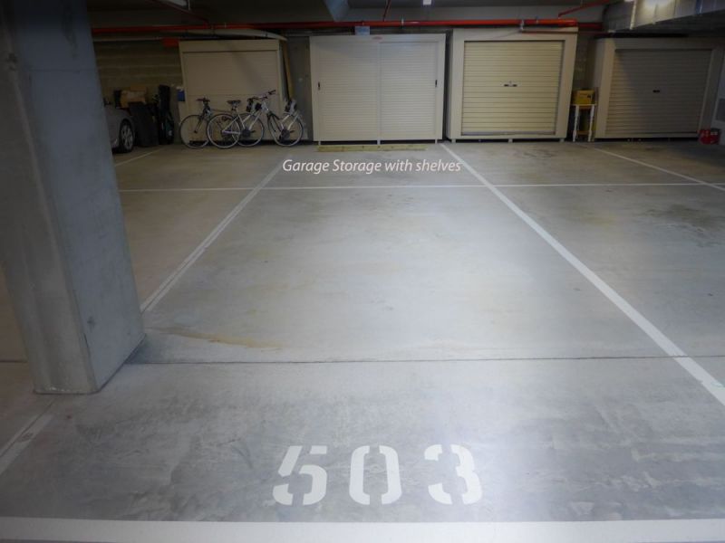 - Large double storage unit with shelves in garage with lockable sliding doors for easy access.