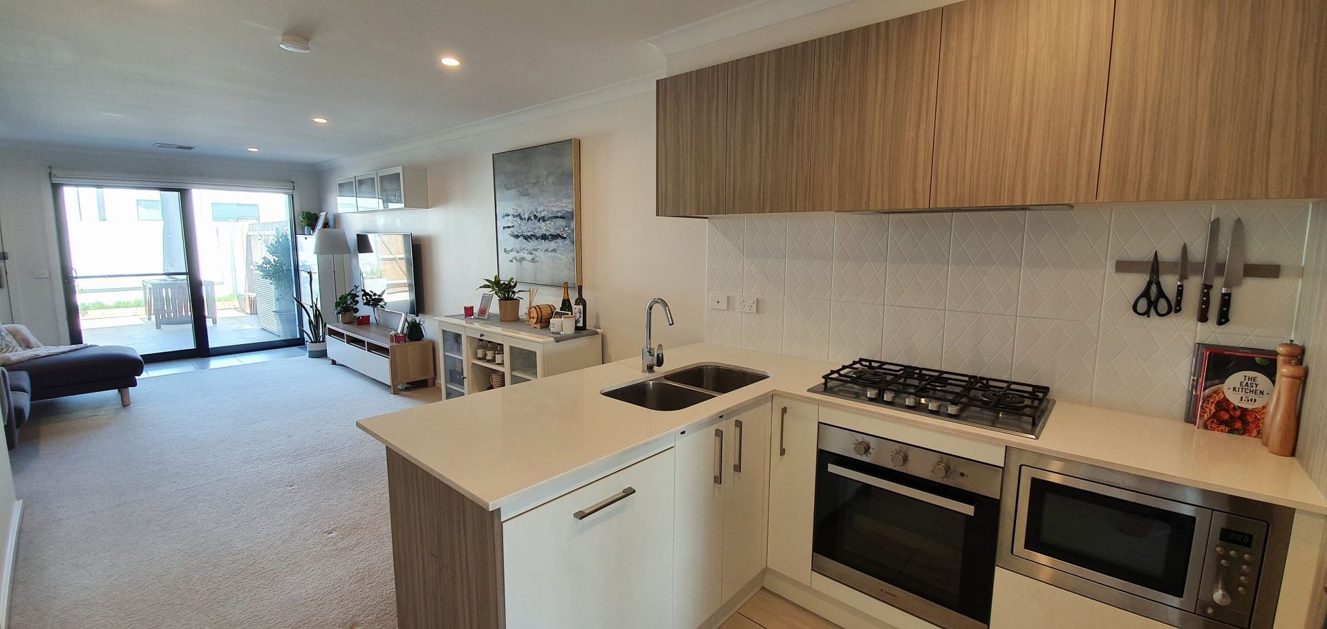 • Modern kitchen appliances, including a 75cm gas cooktop, oven, externally ducted rangehood, and integrated microwave & dishwasher