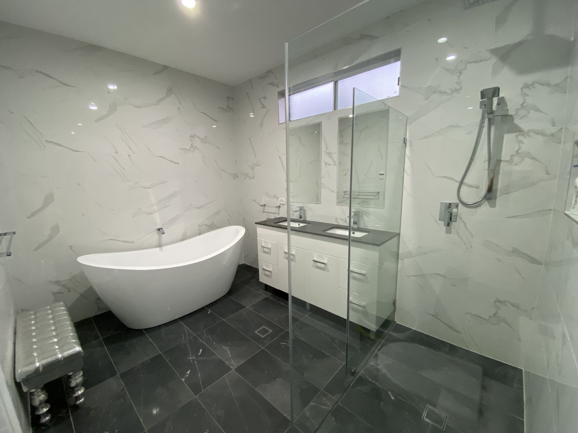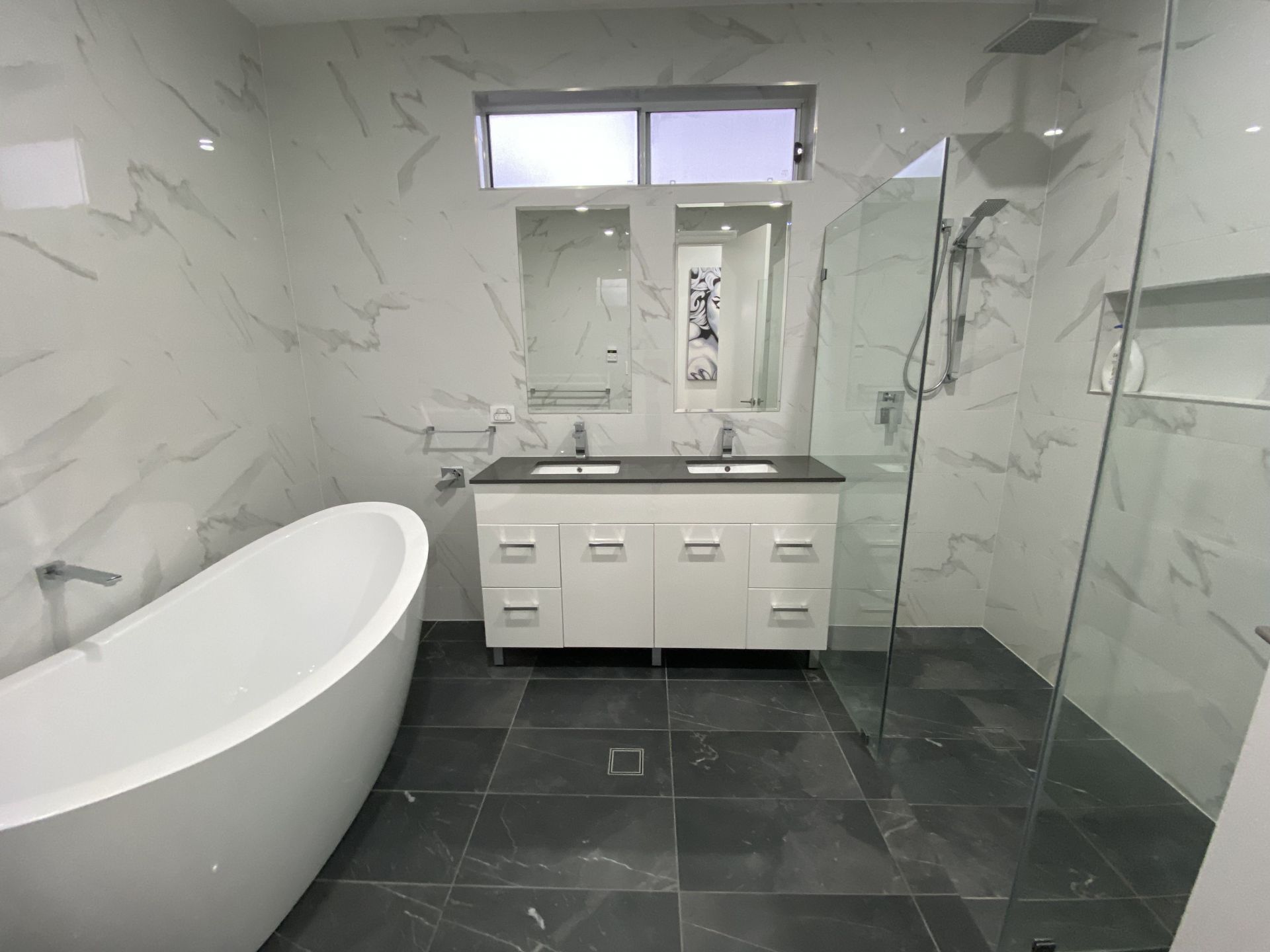 The other two bedrooms have their own build in robes and are serviced by a large main bathroom ,which offers freestanding bath, double vanity with stone top and floor to ceiling porcelain tiles.