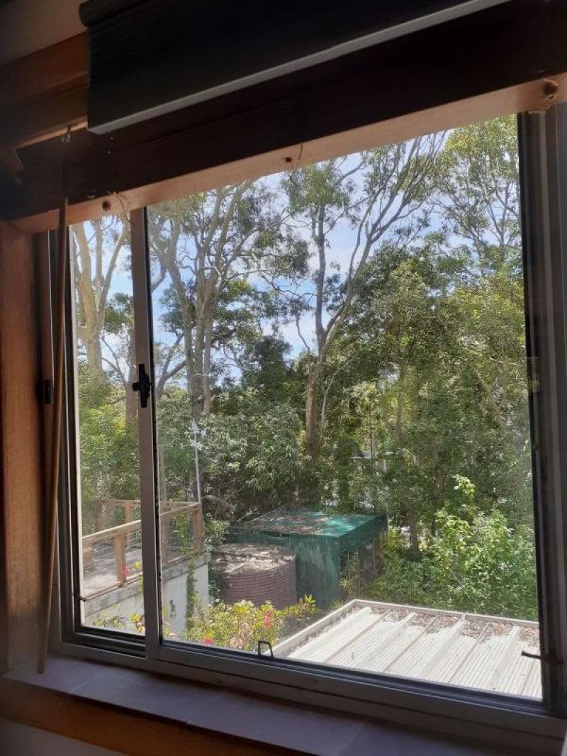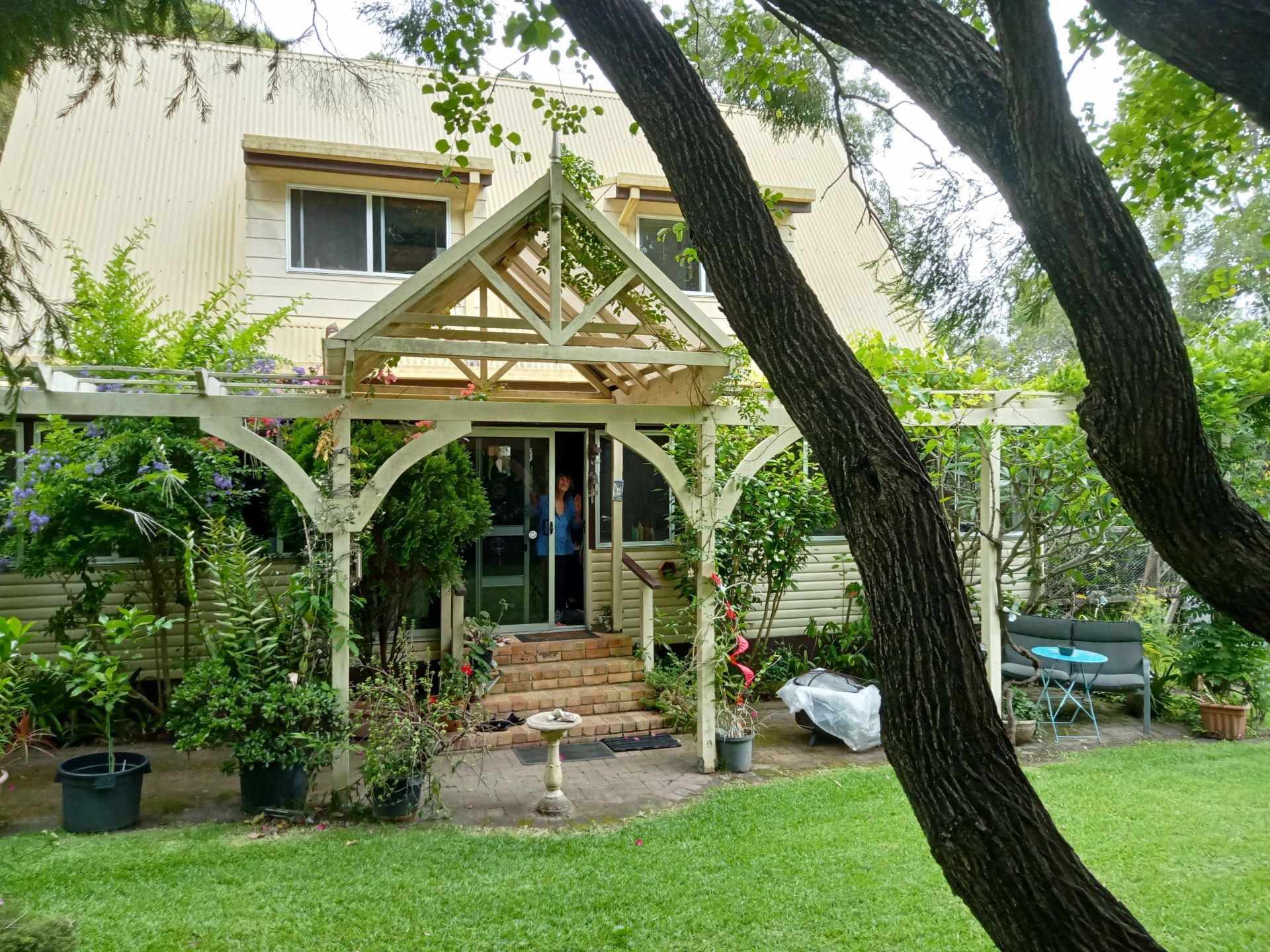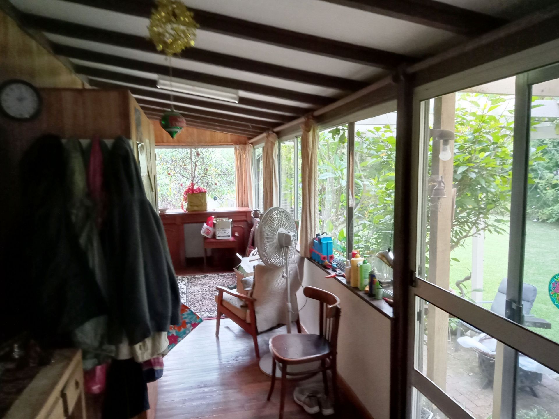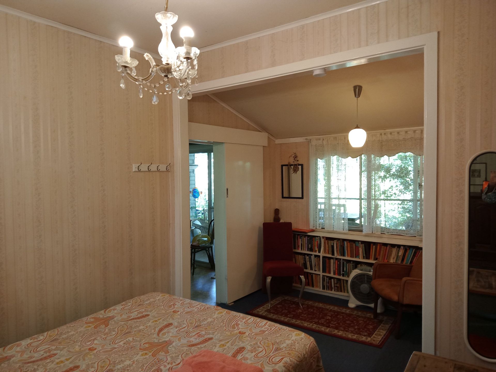 The central living area is surrounded by an enclosed covered verandah with hardwood floors. Sunny seating areas and dining area overlooking the front garden. We use part of the verandah as an office - it can easily become a bedroom. This verandah leads into a bathroom with good sized bath, toilet and laundry with washing machine and steel sink. Then through to the back deck and up to clothes lines on top of garage.