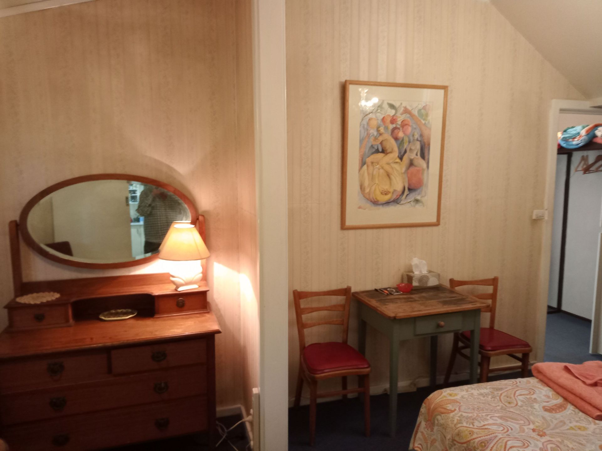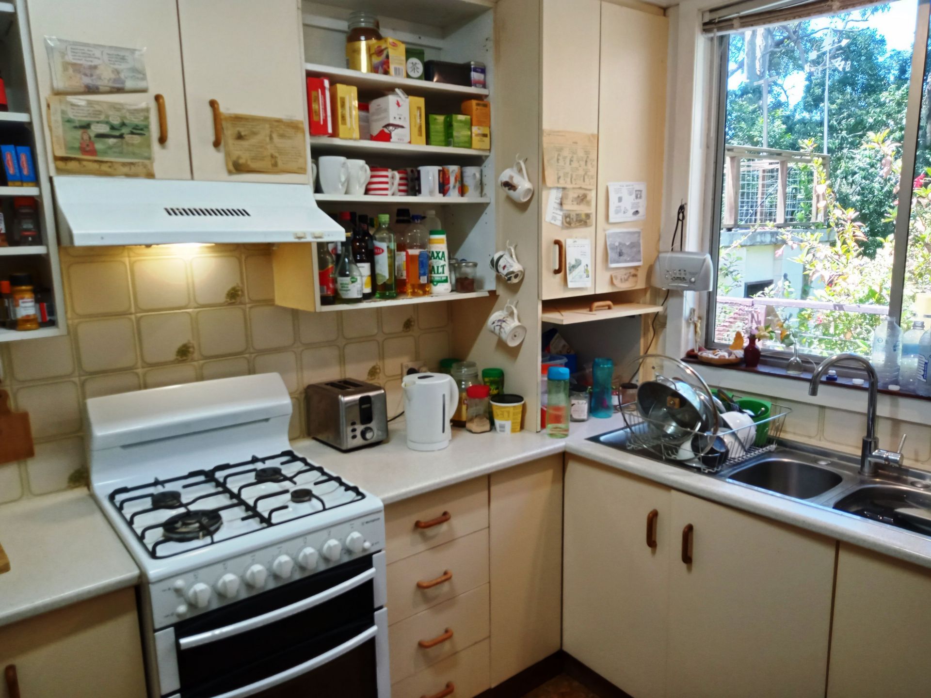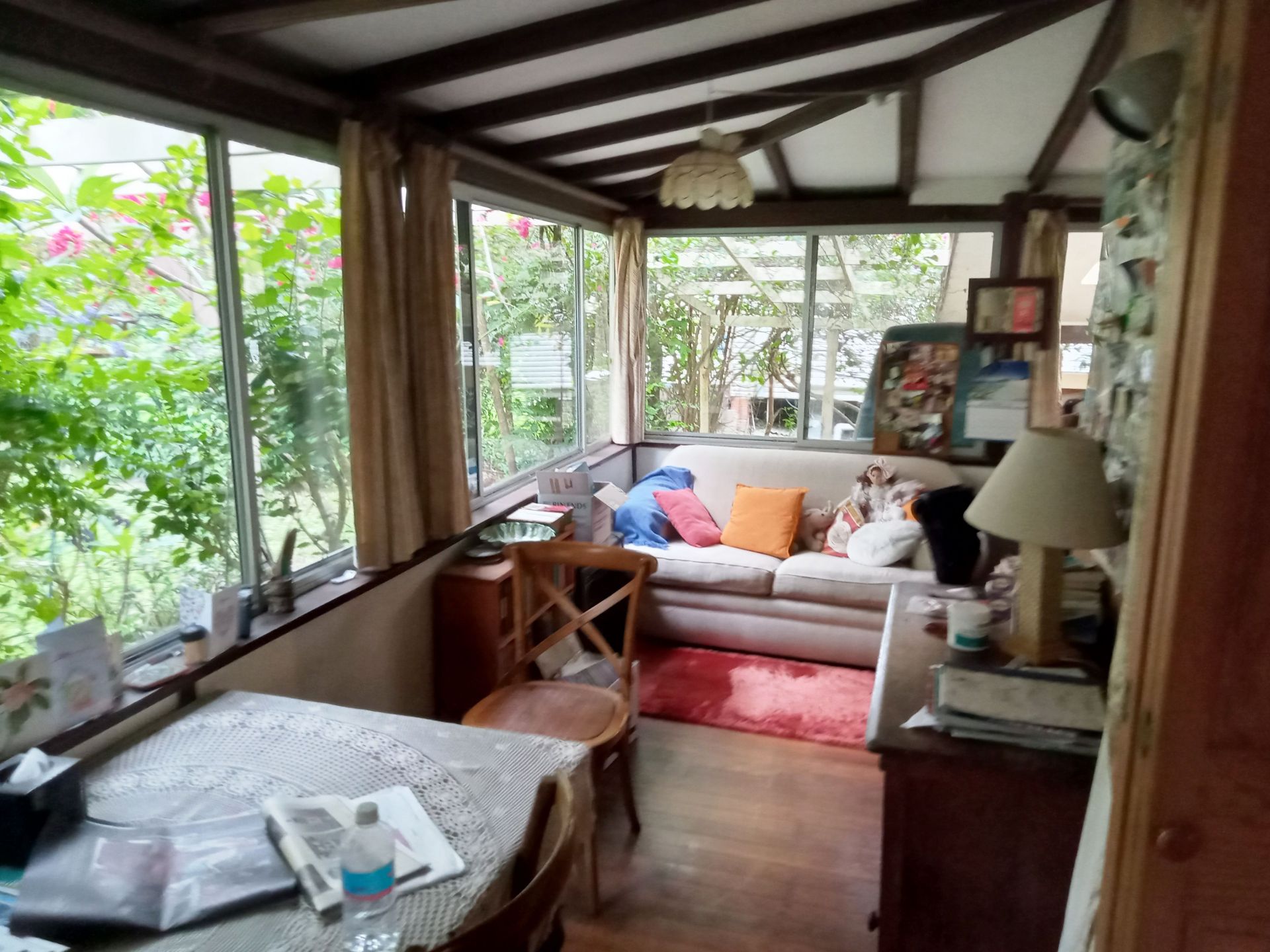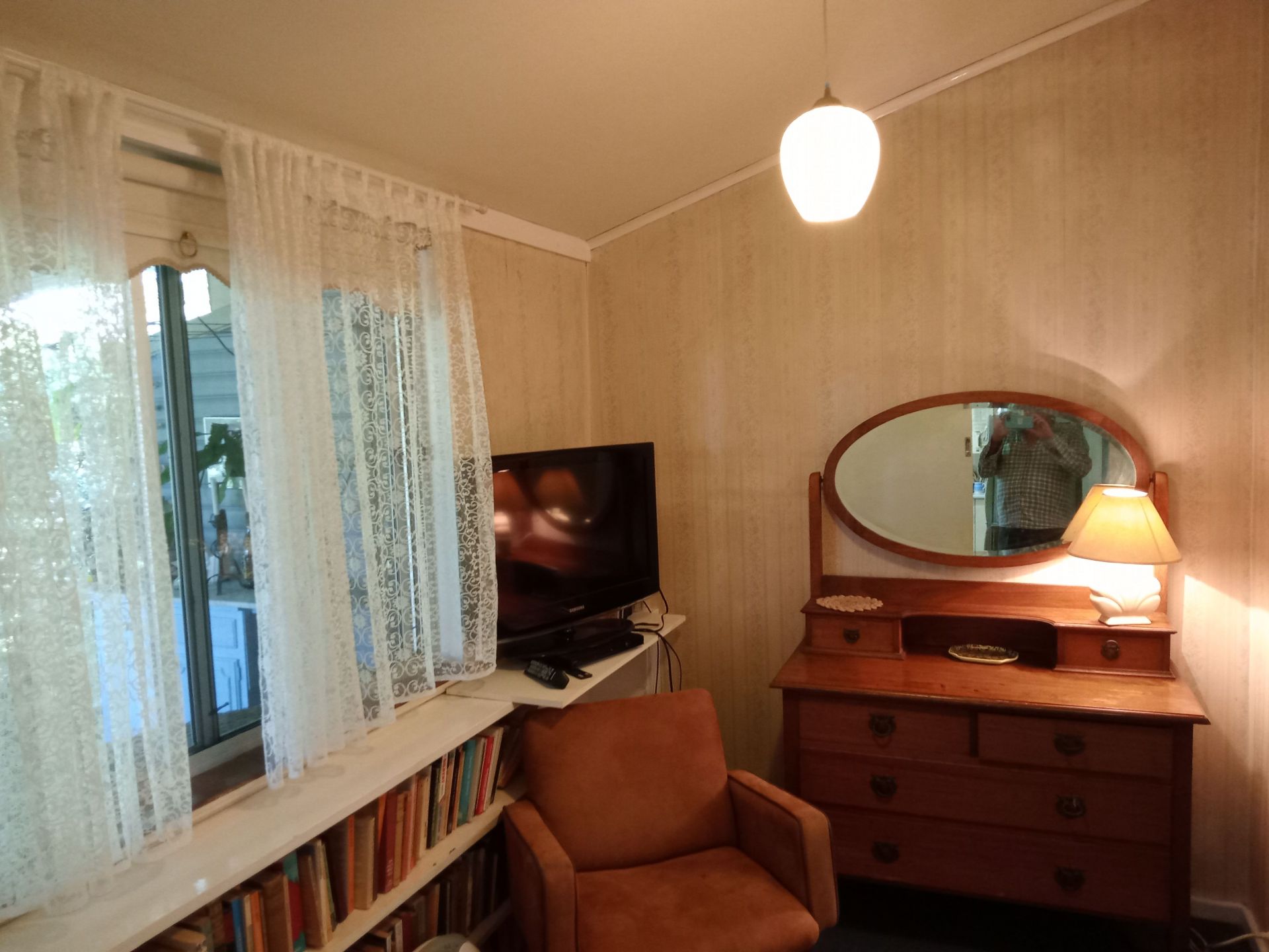 The central living area is surrounded by an enclosed covered verandah with hardwood floors. Sunny seating areas and dining area overlooking the front garden. We use part of the verandah as an office - it can easily become a bedroom. This verandah leads into a bathroom with good sized bath, toilet and laundry with washing machine and steel sink. Then through to the back deck and up to clothes lines on top of garage.
