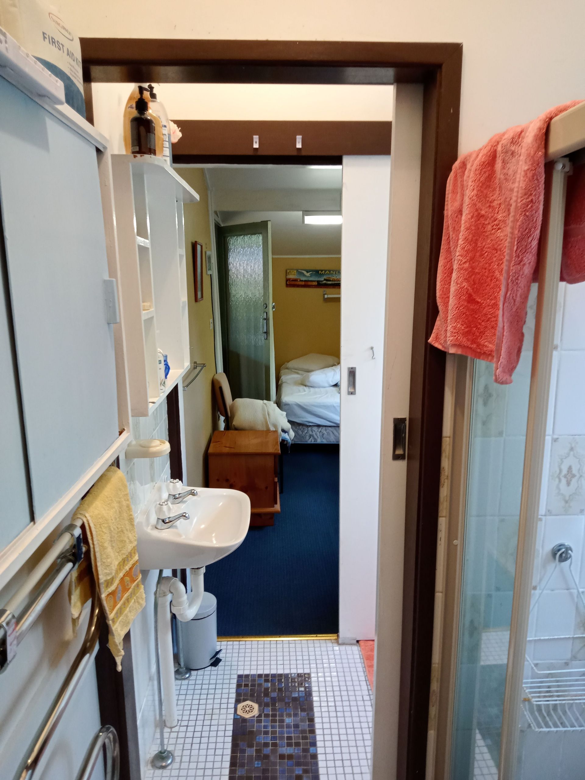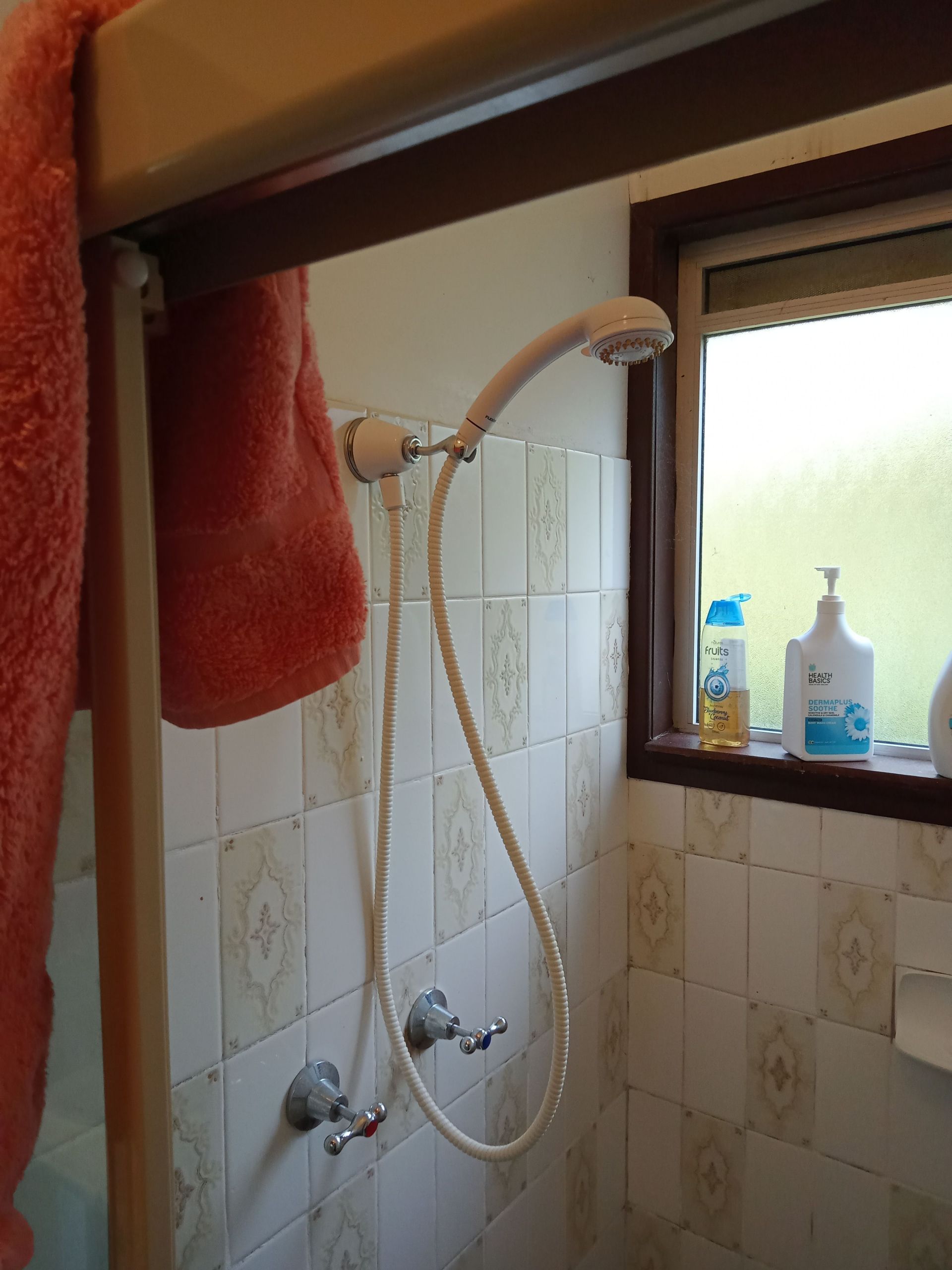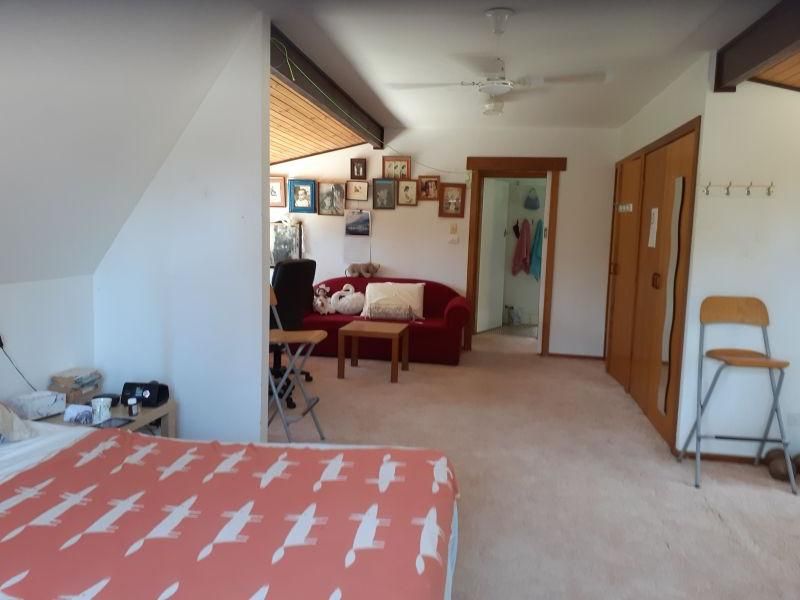 Outdoor shower - good for humans who've been on the sandy beach - and rainwater tank for watering the plants...Upstairs there is one large room with small balcony north facing, bathroom and kitchenette - which we use to store photos... Upstairs has one queen size bed and fold out double bed but this large room could be converted very easily into two rooms. Downstairs is a bedroom with queen size bed, walk in closet, ensuite shower/toilet and a smaller room with double bed leading onto back deck.