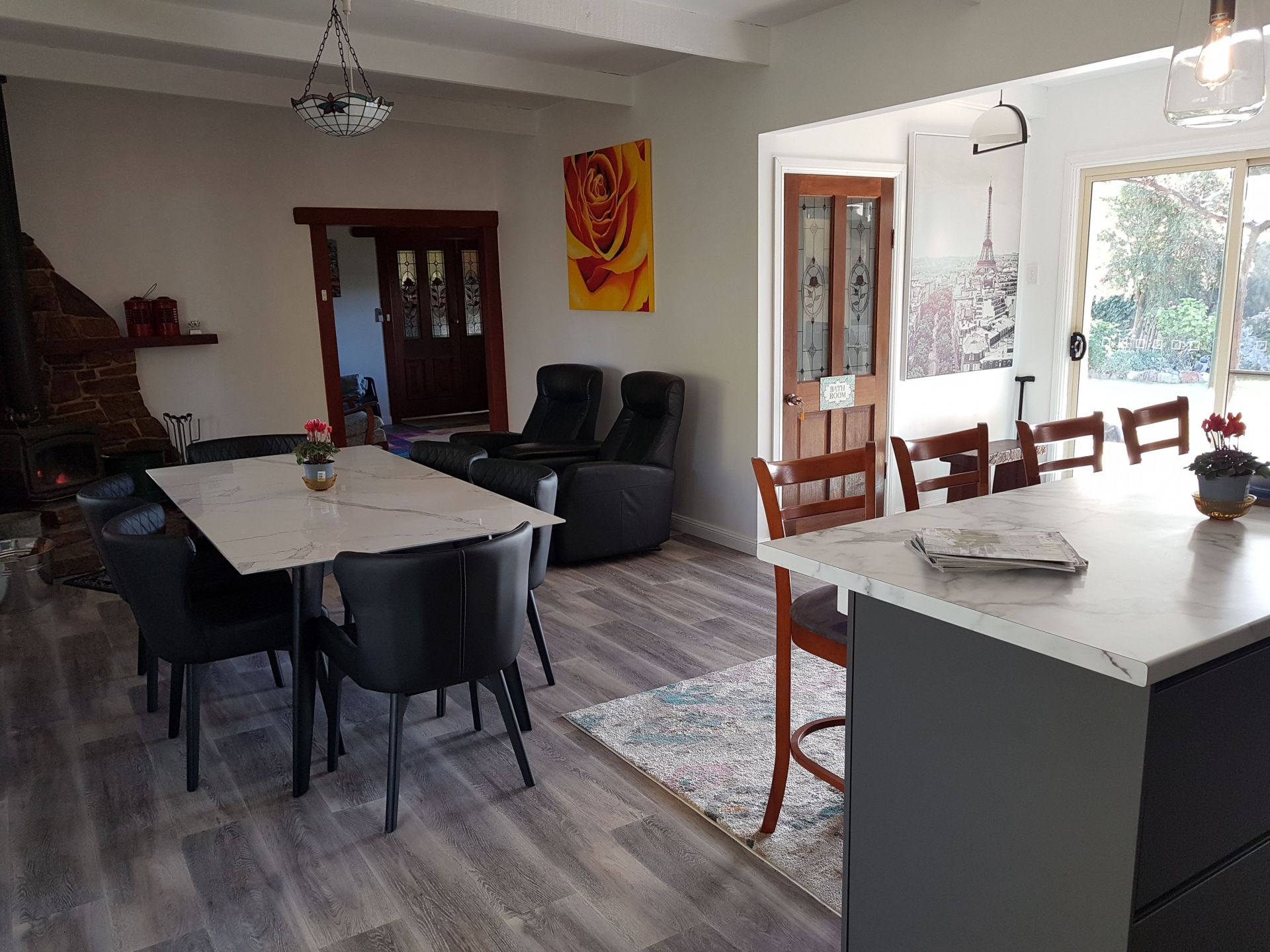 As you drive up the tree lined driveway, and enter the spacious, air-conditioned kitchen / family / dining room you will be impressed by the bright exposure to the inviting gardens both front and rear. A wood fire in the family room is great for those cold winter nights. The house is cool in summer and cosy in winter due to the rendered brick façade and verandahs front and back.