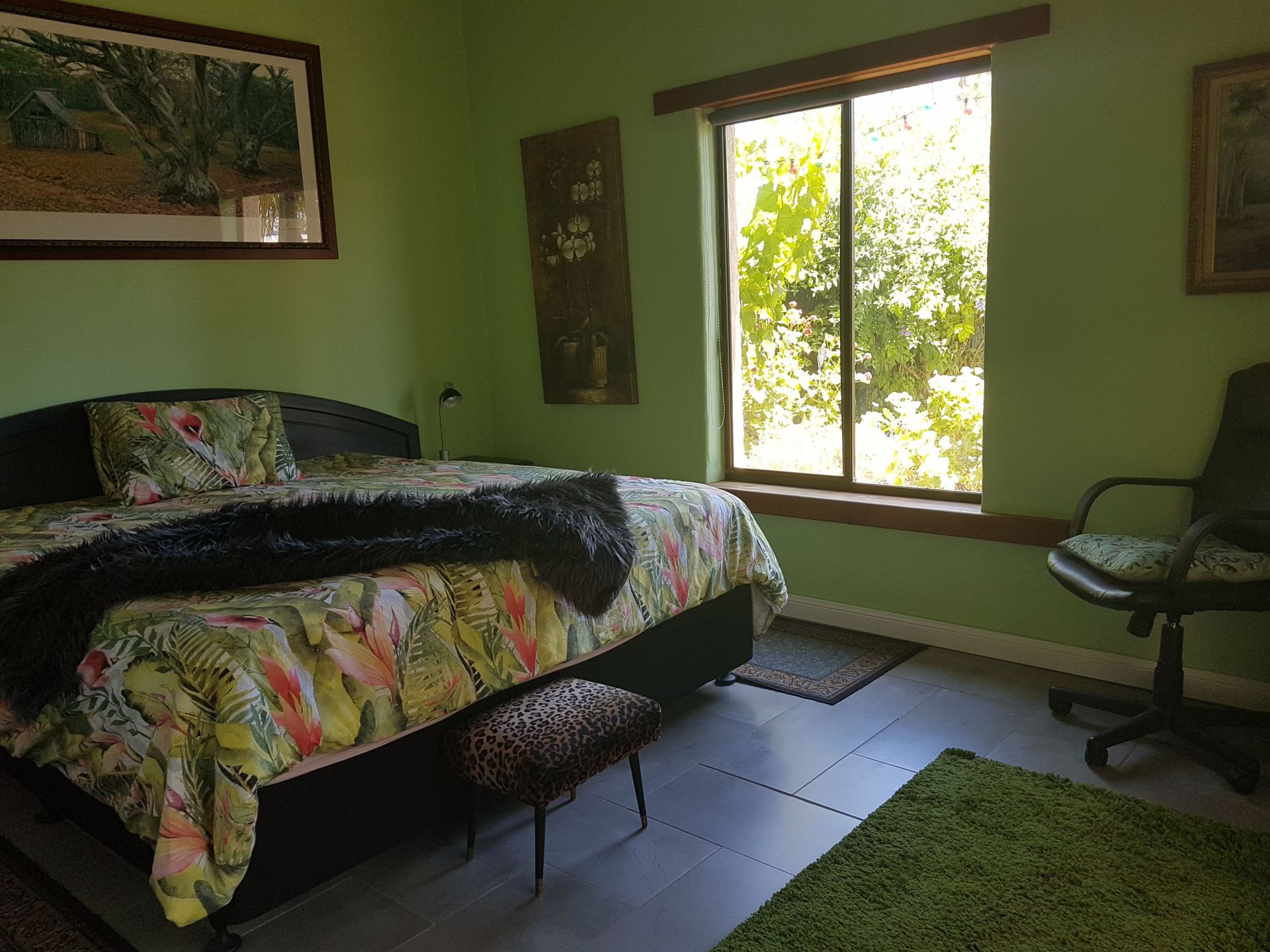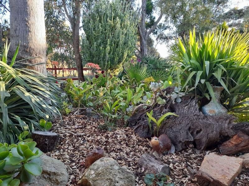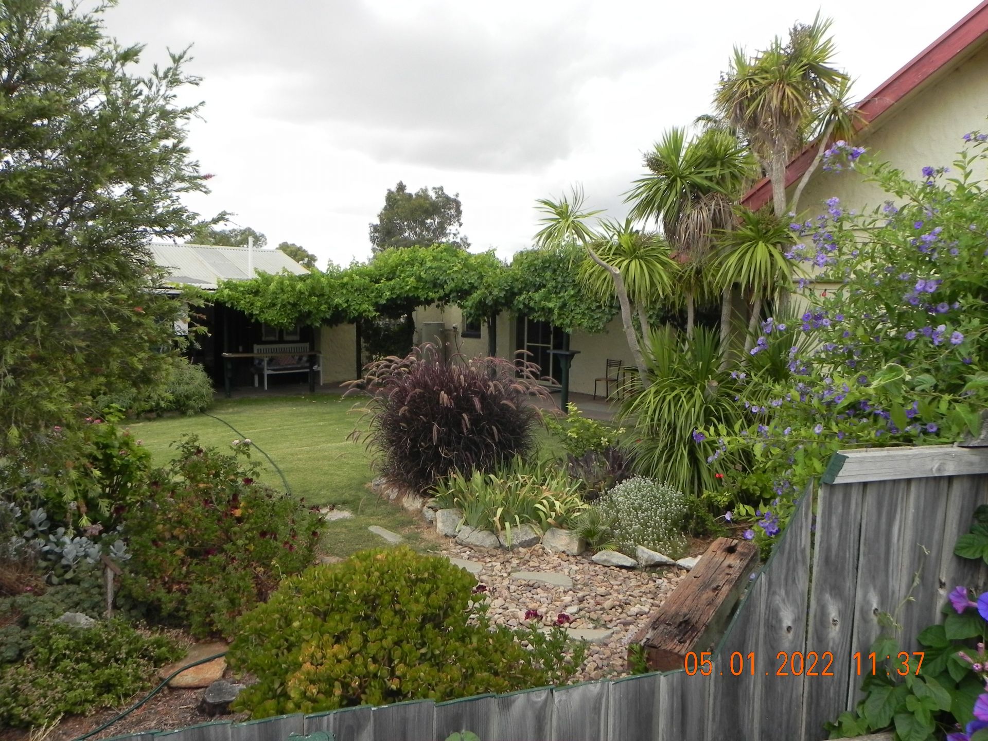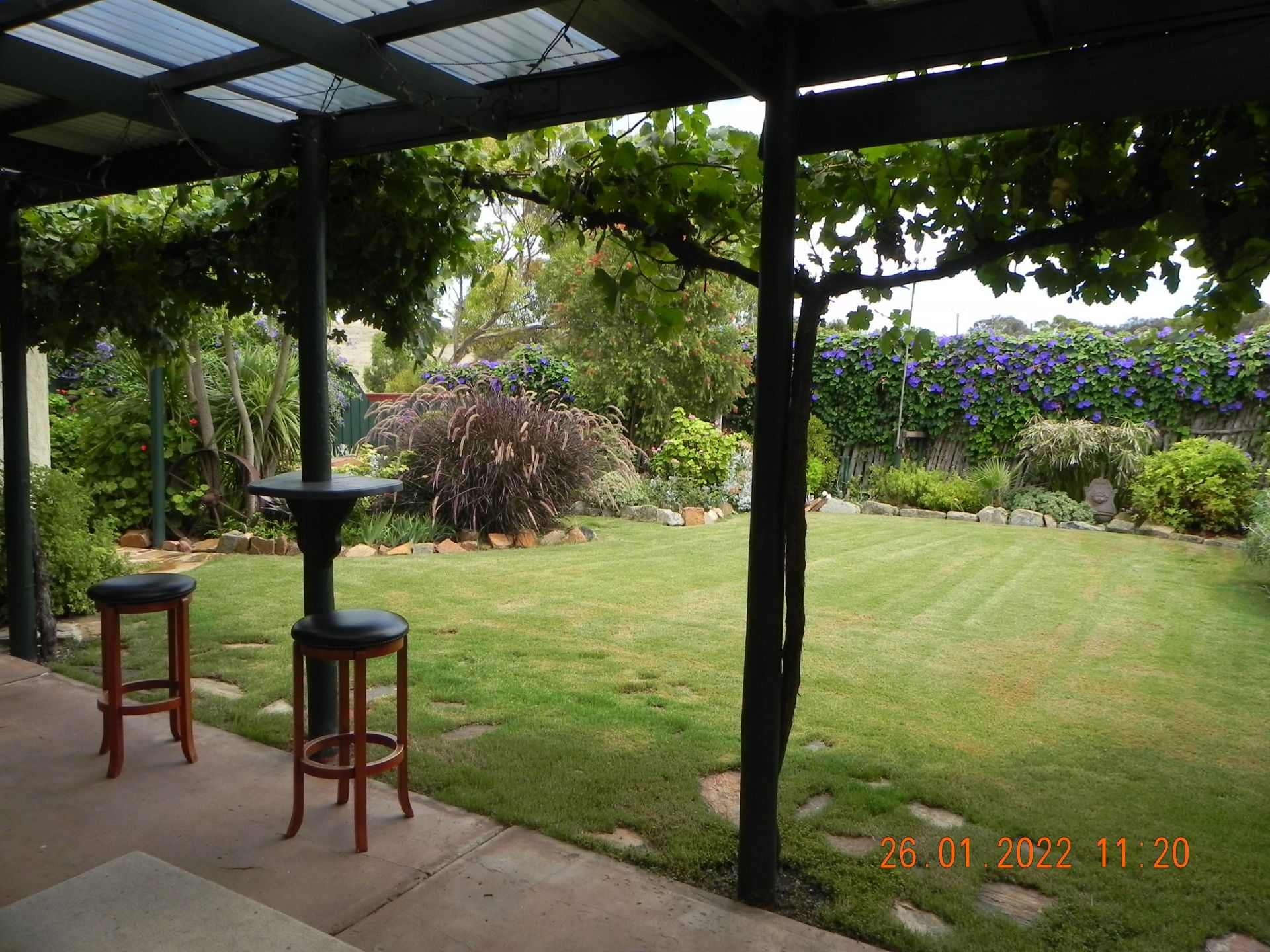 Step outside under the u-shaped verandah draped with 3 varieties of grapes vines which keep the air cool in summer while providing grapes for the table. There is a large range of bird life throughout the year due to the abundance of trees and shrubs.