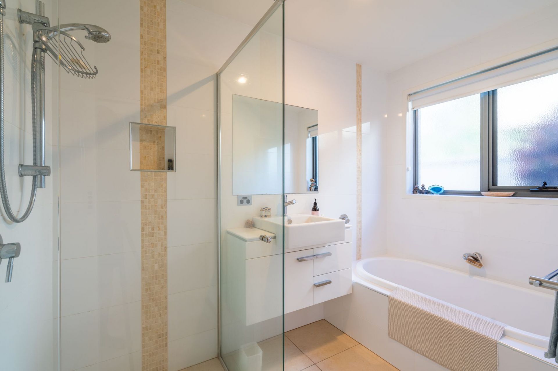 Downstairs features 2 double bedrooms both with built ins. A bathroom featuring floor to ceiling tiles, floating vanity, shower and bath and a separate toilet are also located on this level. An extra wide single garage with built in laundry and storage offers easy access outside and additional storage under the stairs.