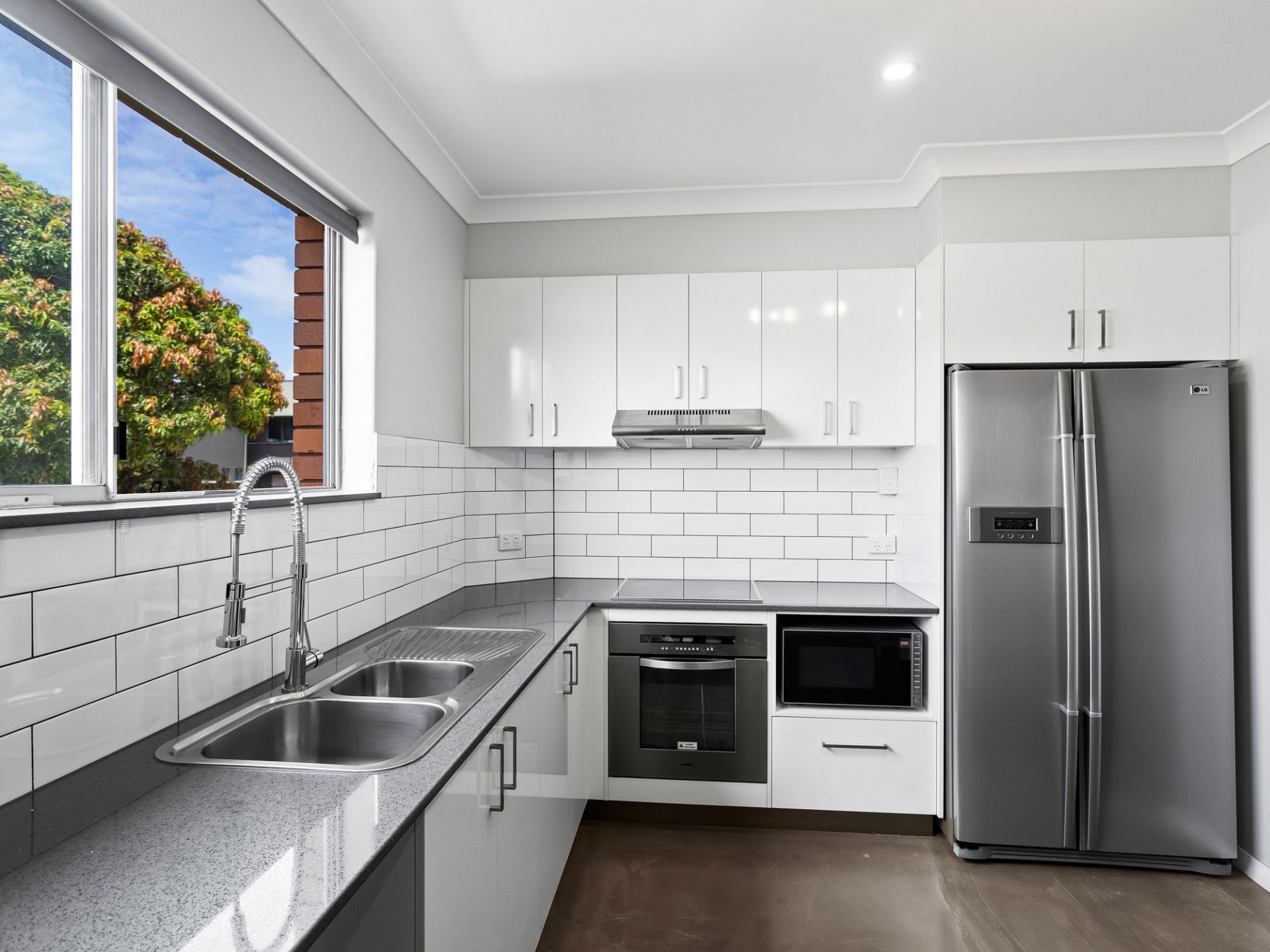 • Modern kitchen with stone benchtops and polished concrete floors.