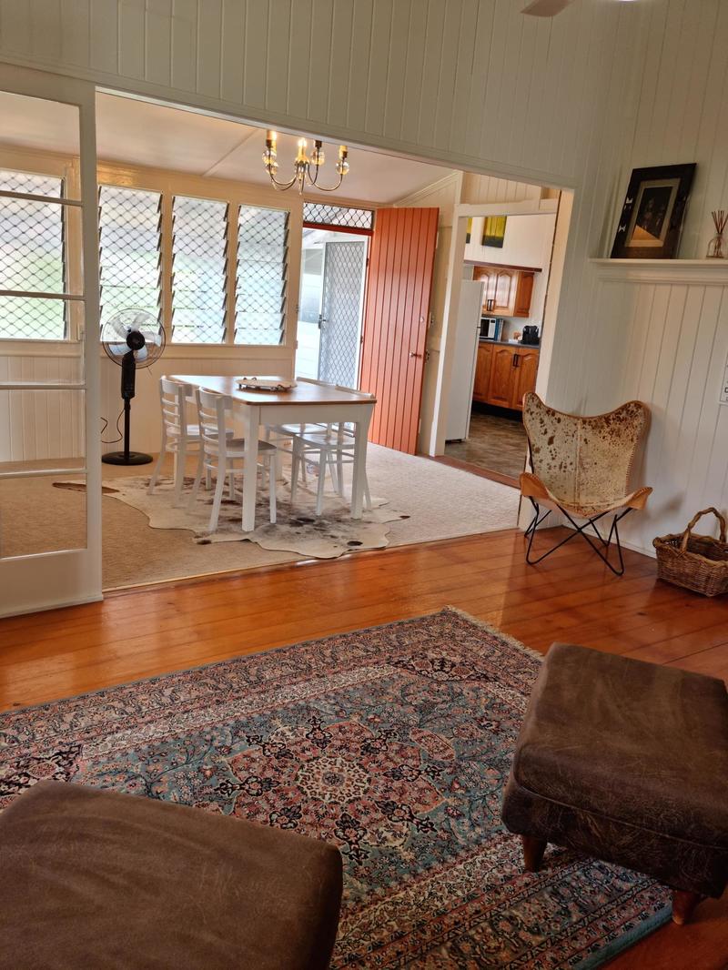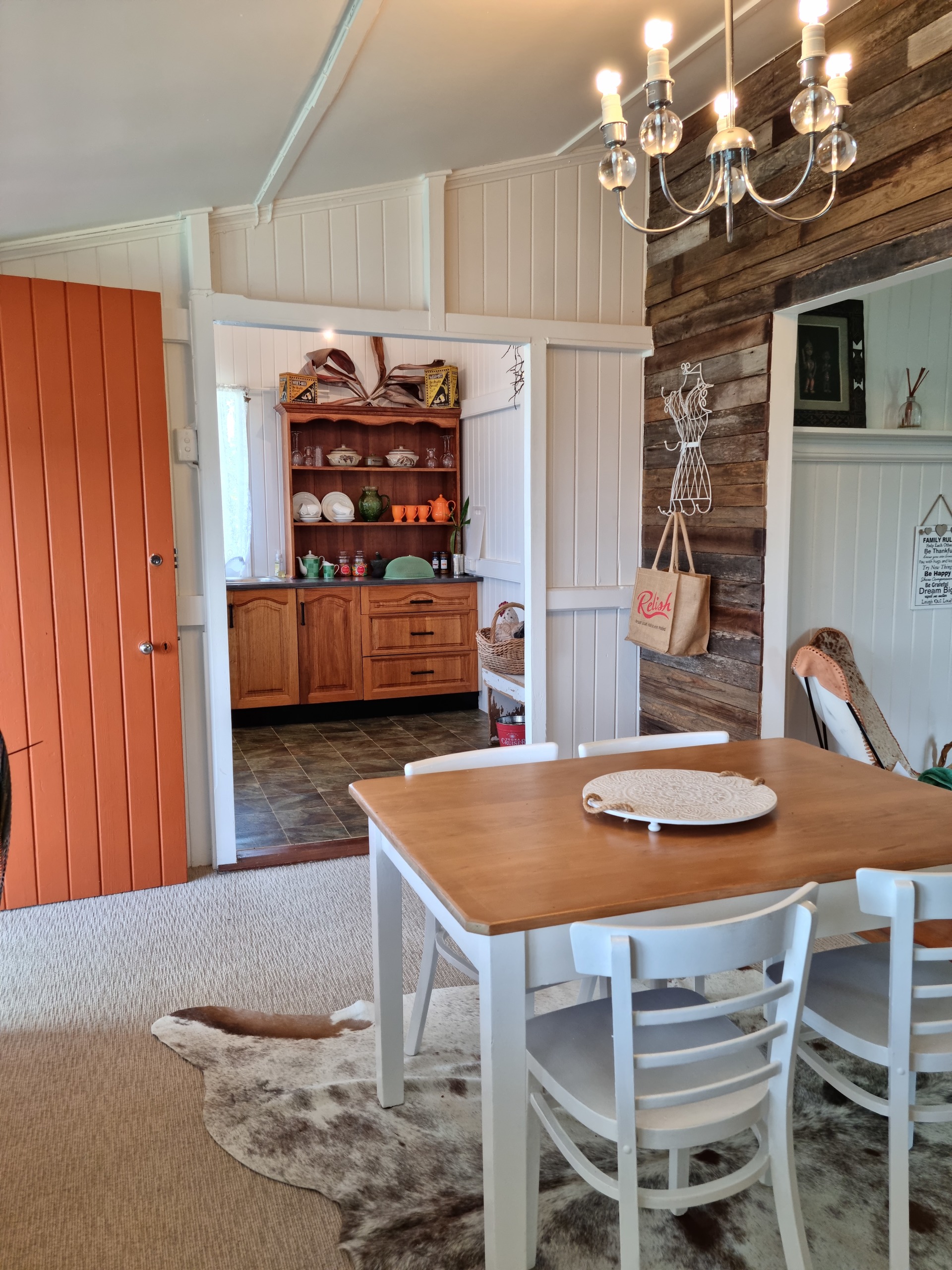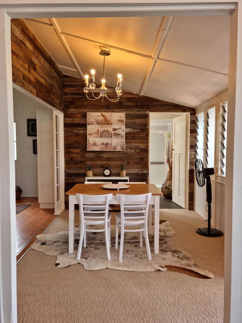 The dining room has complete wall of louver windows for continuous airflow. Fly and security screens. Plenty of character with feature timber walls for that rustic look. Chandelier over the dining table. Open arch that leads you through to the kitchen.