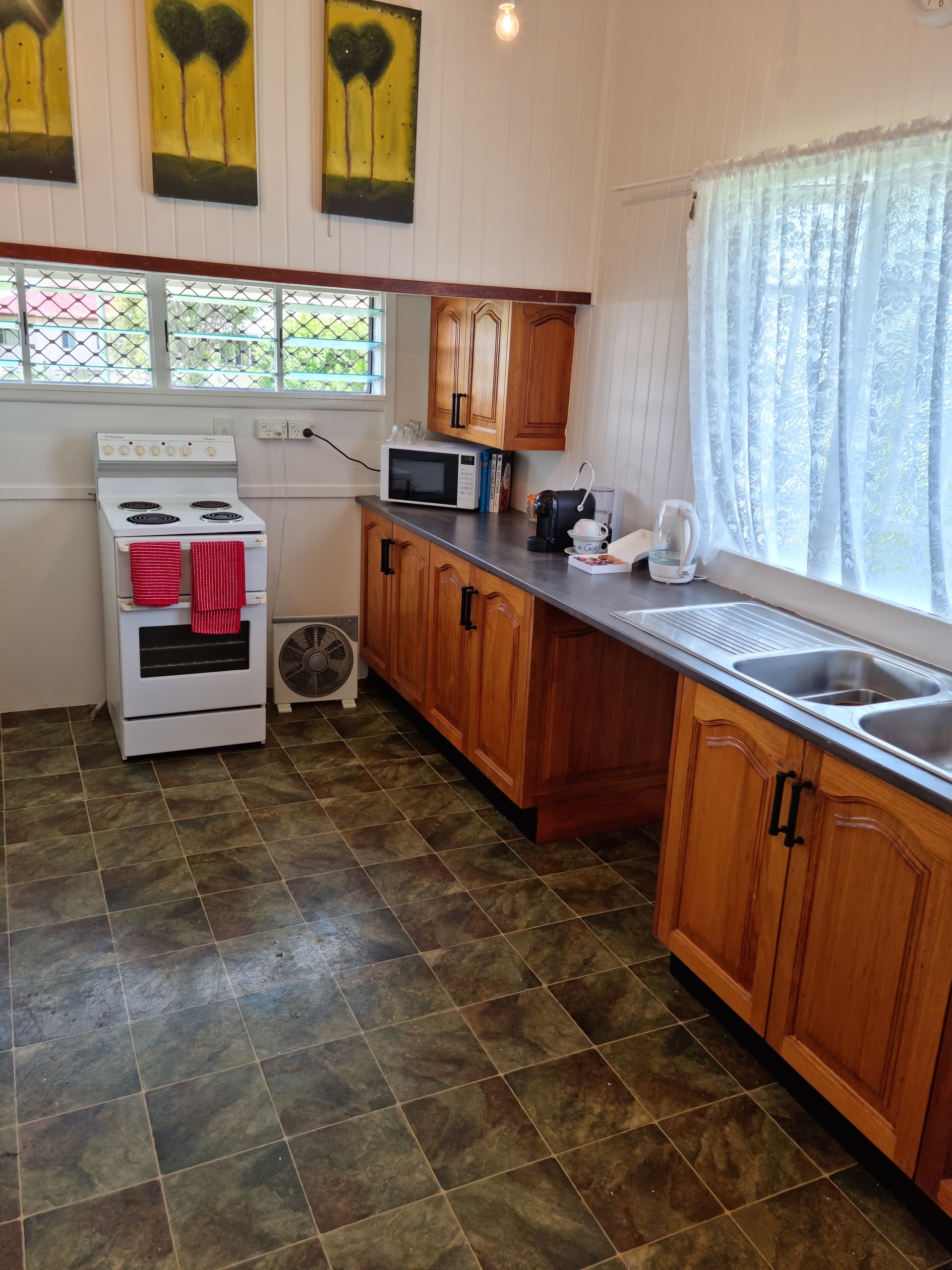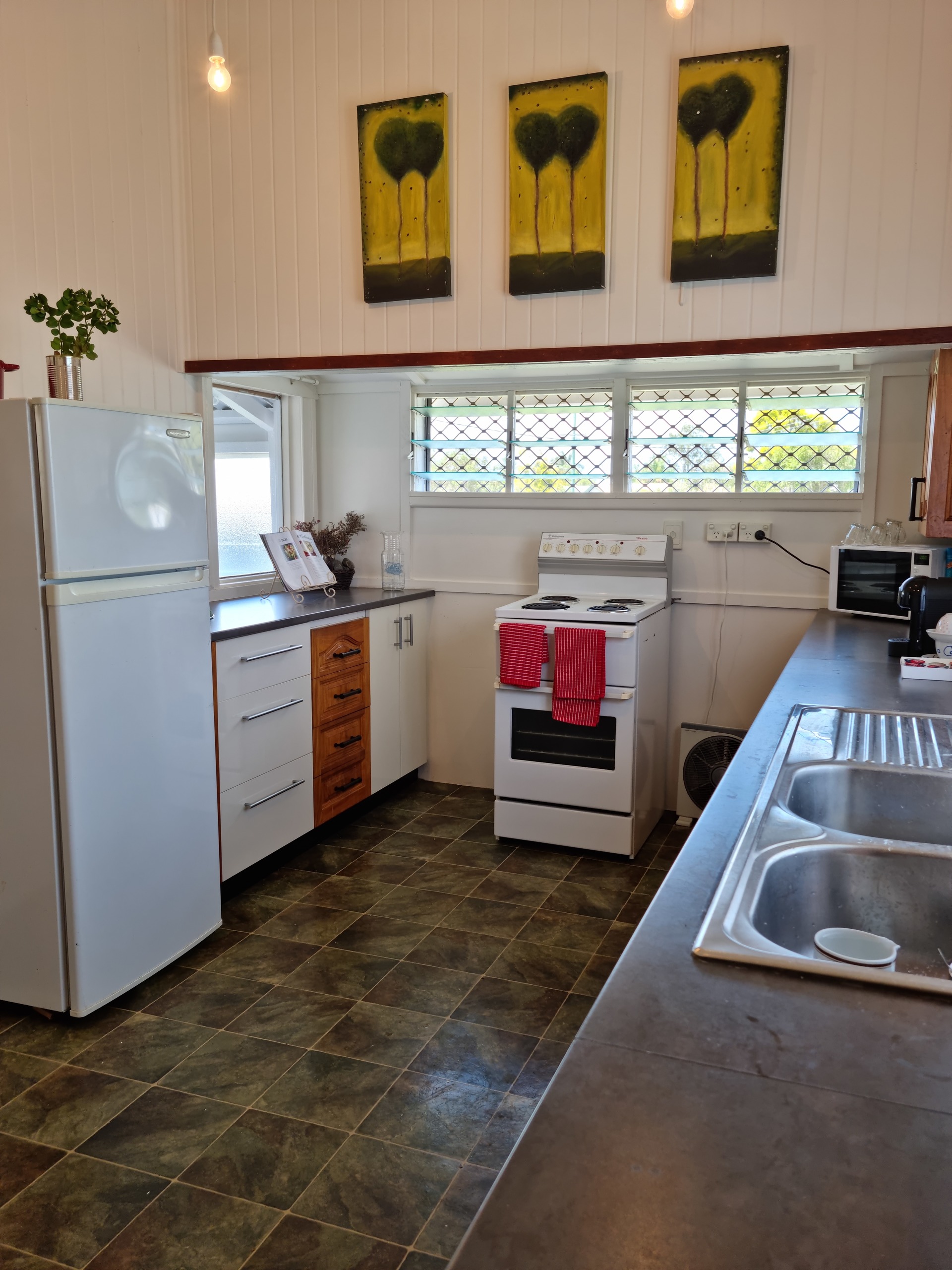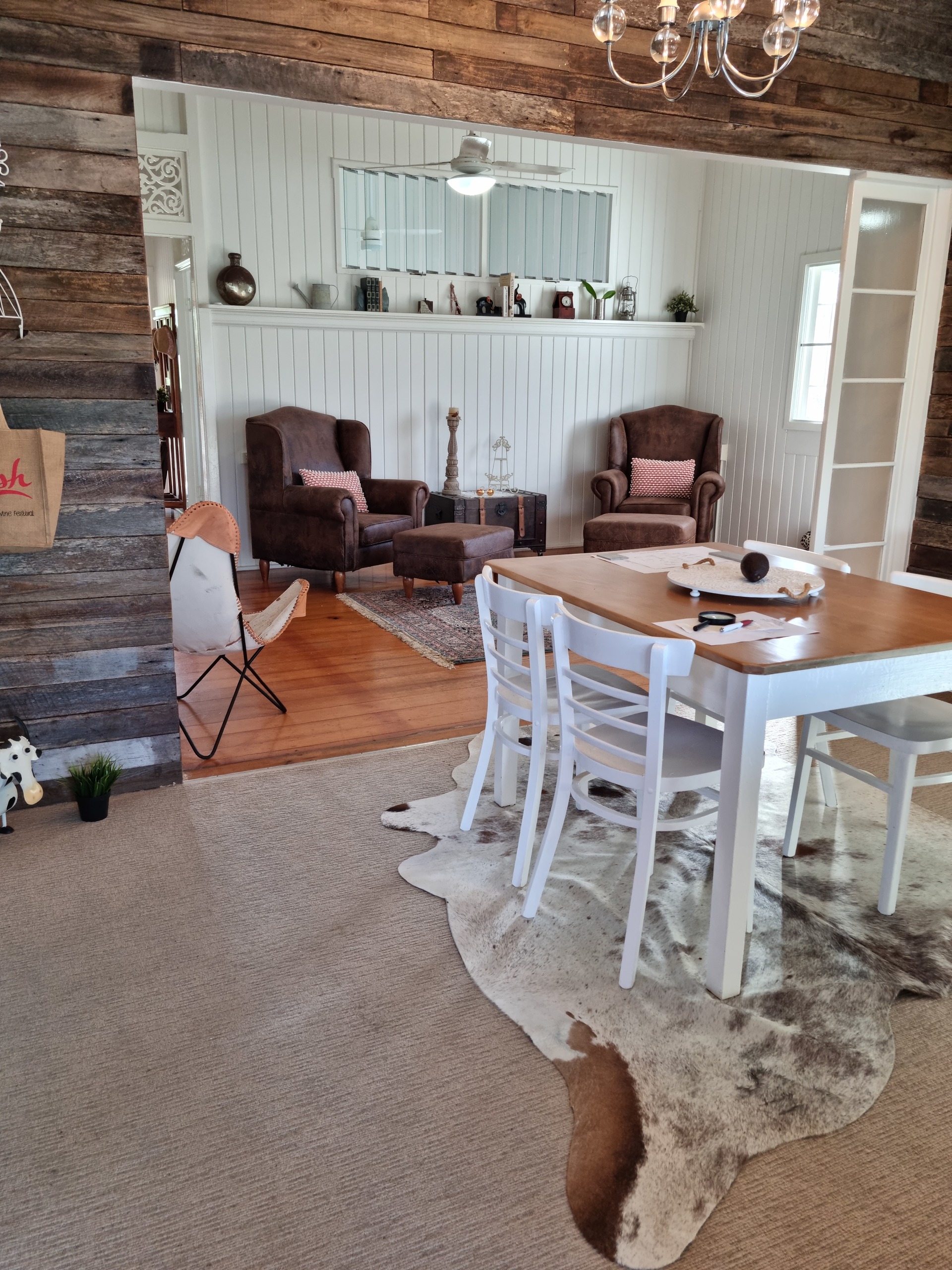 The dining room has complete wall of louver windows for continuous airflow. Fly and security screens. Plenty of character with feature timber walls for that rustic look. Chandelier over the dining table. Open arch that leads you through to the kitchen.