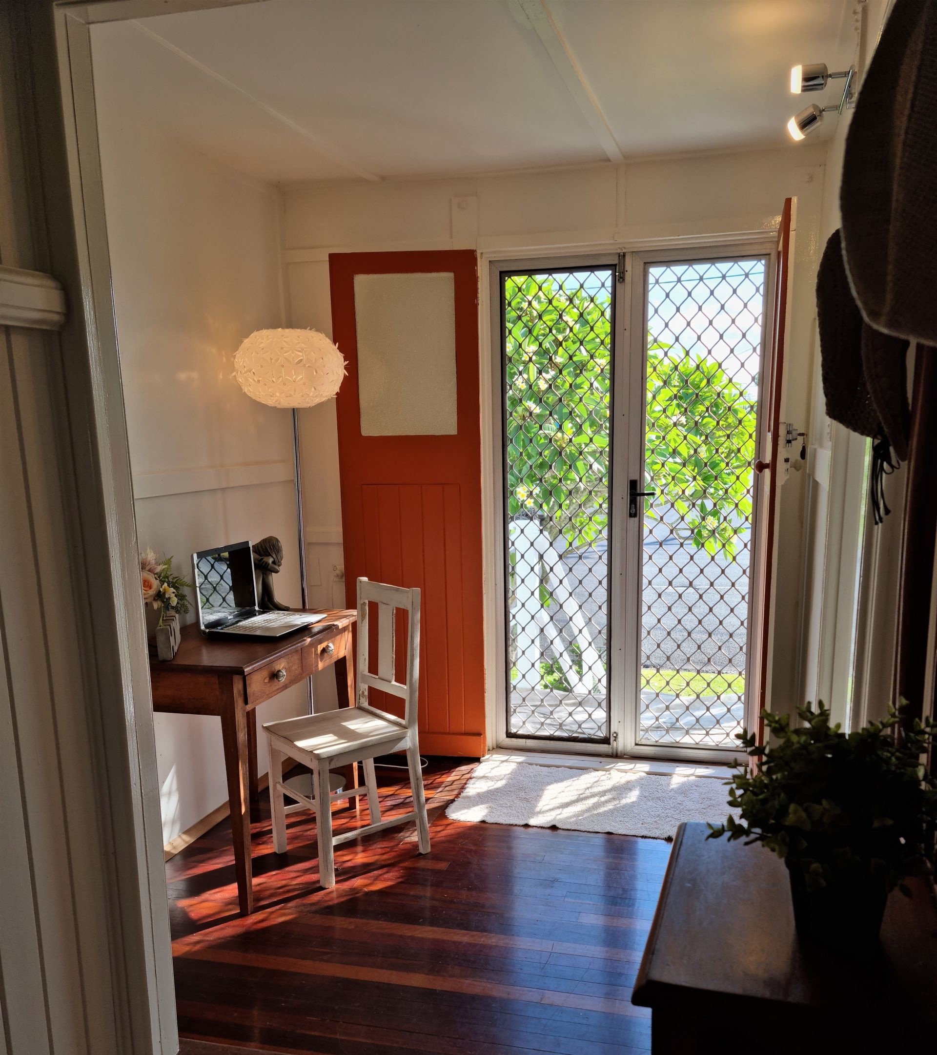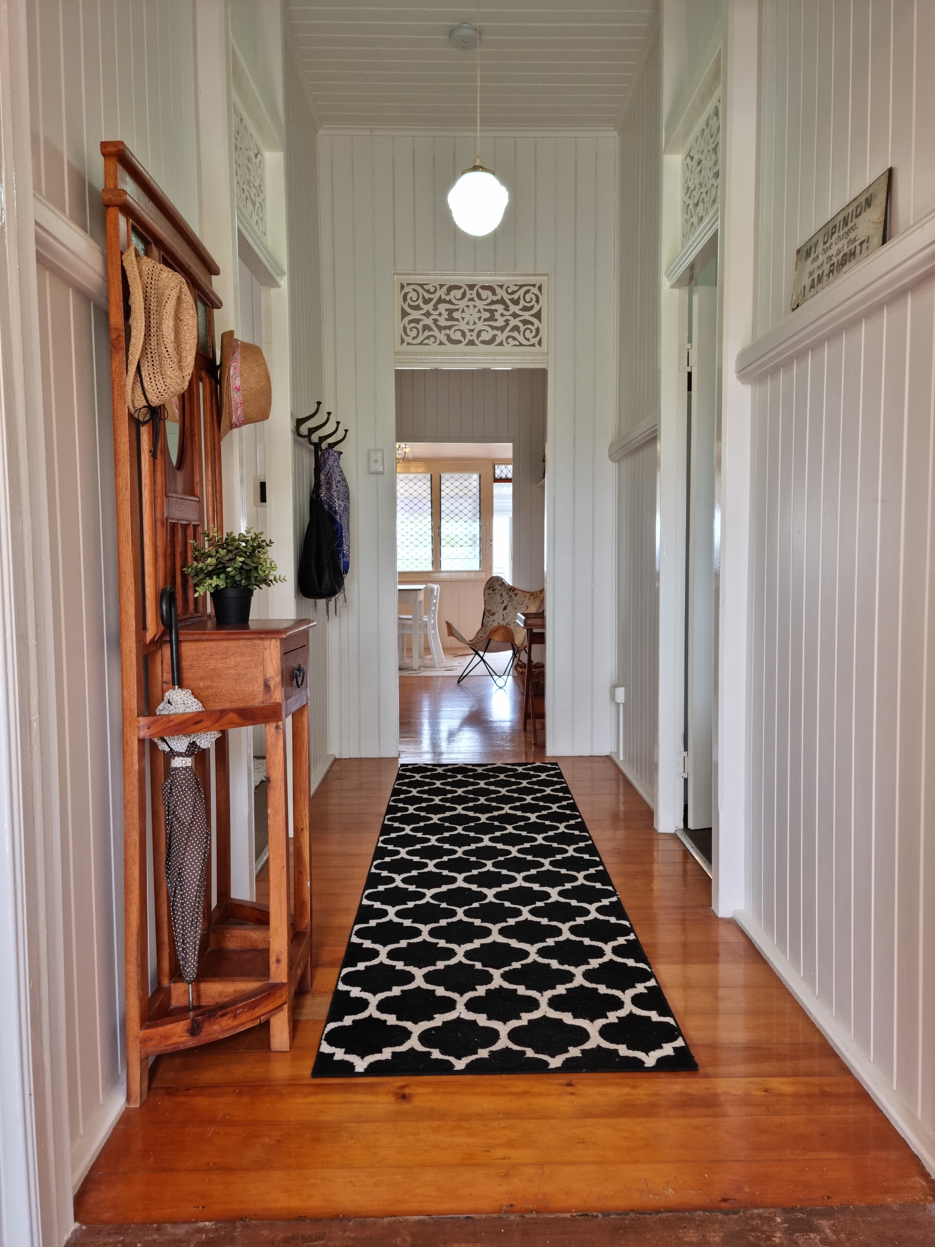 Office: The office is situated on the right after entering through the security screen and front double door. The double door is great for moving bulky items in or out. The beautiful hallway has high ceilings, exposed timber flooring and fretwork over the doors. The hallway allows you to access the bedrooms and lounge.