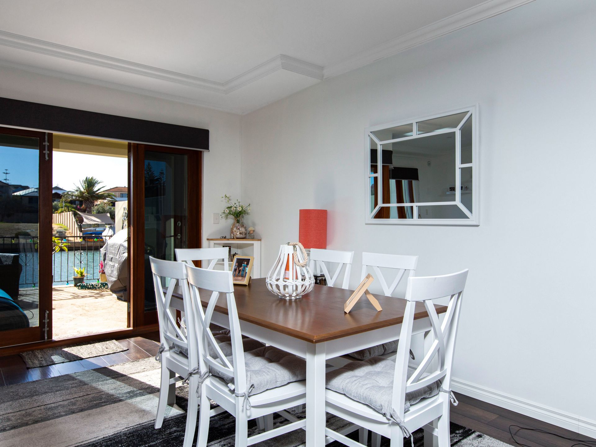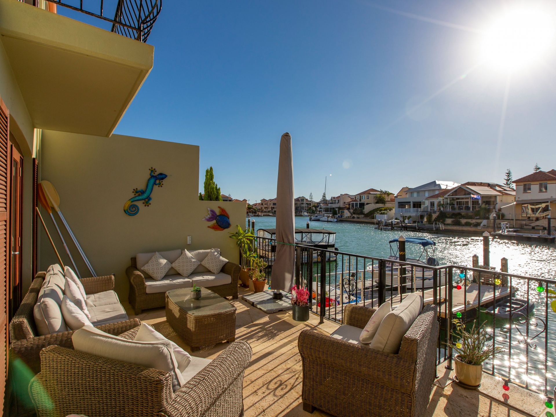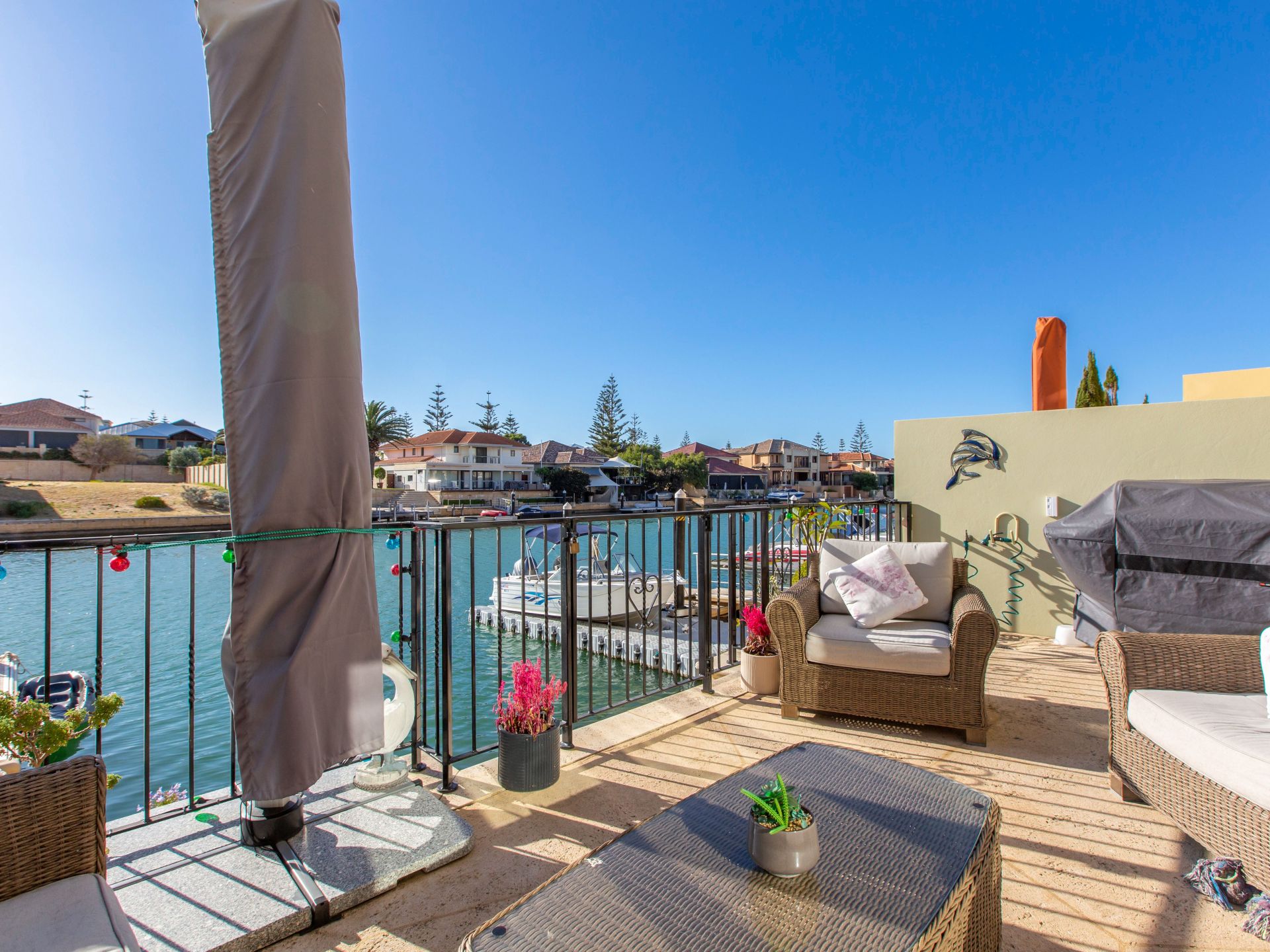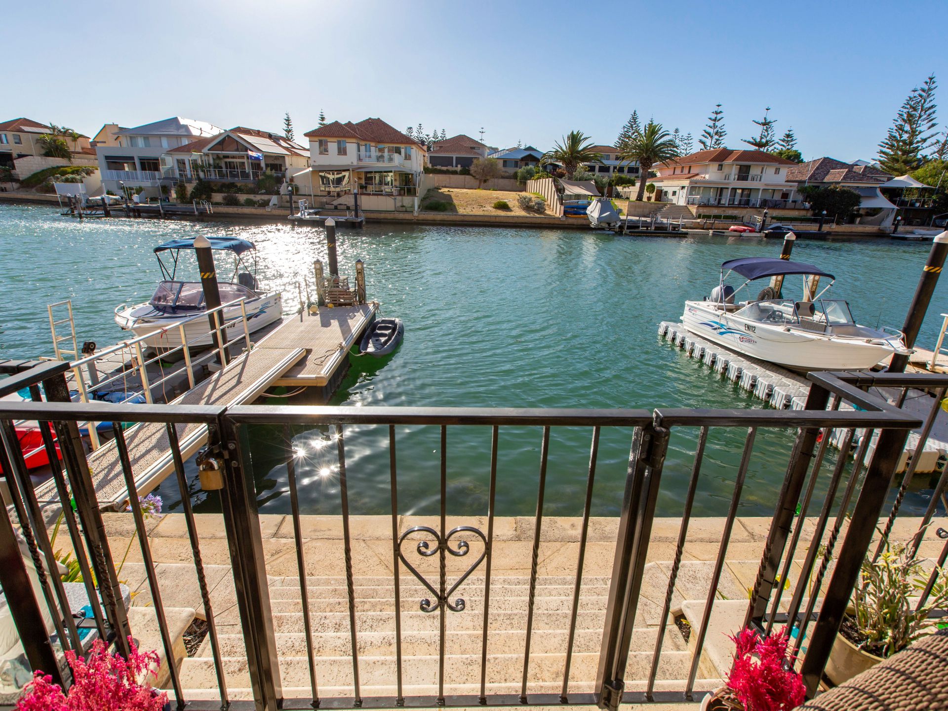Walk through wide cedar doors onto the paved alfresco entertaining area and down to the canal front complete with your own floating jetty with power and water awaiting your pleasure craft.