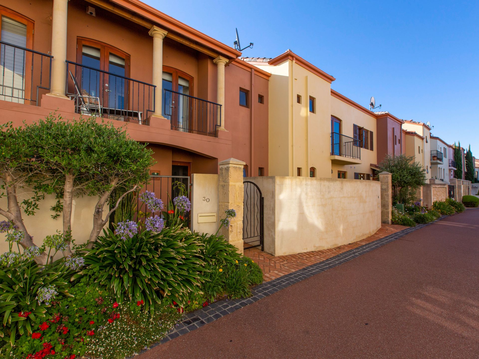 From the cobble line street step through the lovely courtyard entry into this water front villa and immediately you gaze upon the azure waters beyond.