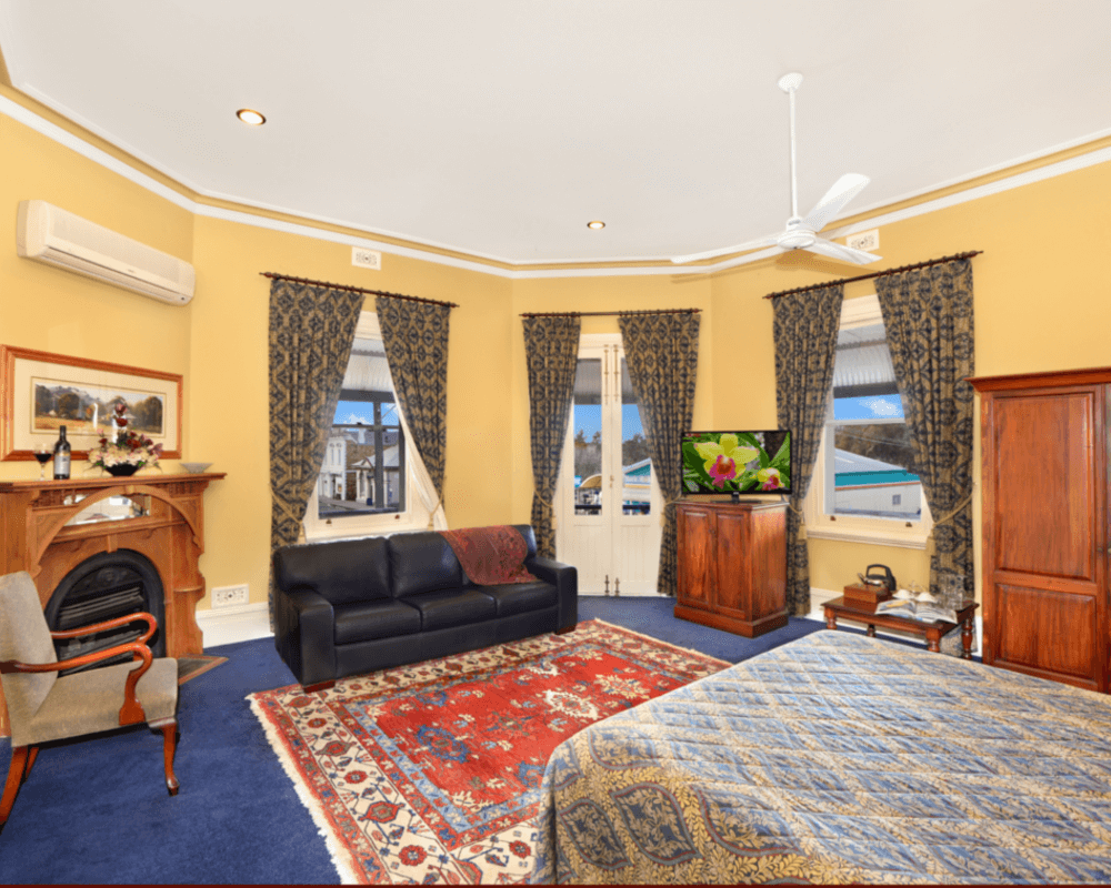 Step into a world of timeless elegance. This stunning hotel blends historic charm with modern luxury, featuring exquisite stained-glass windows, a grand jarrah staircase, soaring high ceilings, and stately pillars. Original doors open to wide verandahs that wrap around two sides, offering breathtaking views. Every room is designed for year-round comfort, with whisper-quiet ceiling fans and state-of-the-art reverse-cycle air conditioning-ensuring the perfect ambiance, whatever the season.