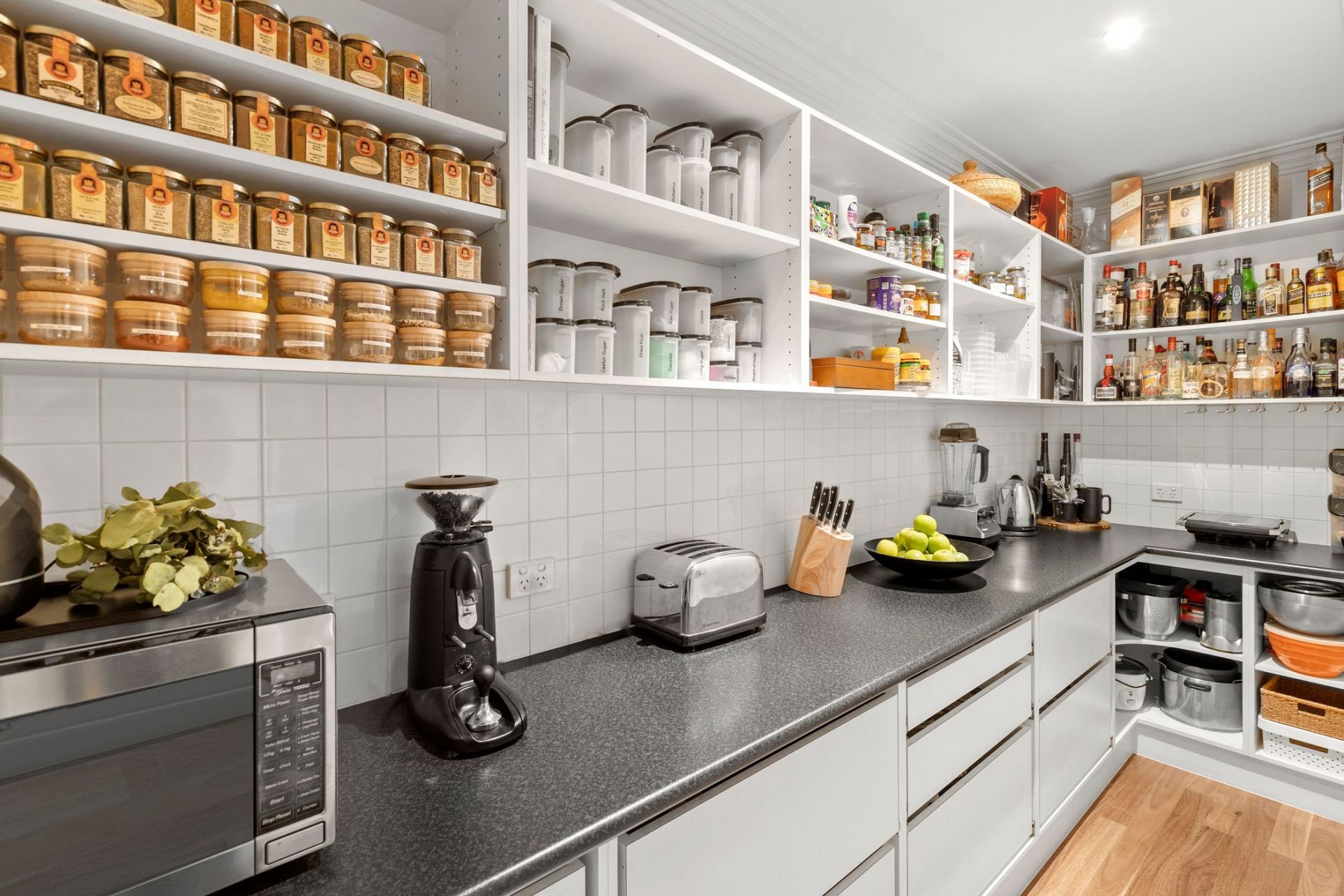 Kitchen: Feature Island bench, stone benchtop, overhead cabinetry, ample under bench storage, walk-in pantry with shelving and drawers galore, 900mm stainless steel appliances, double sink, stone splashback, timber flooring, double fridge space with wine fridge space as well.