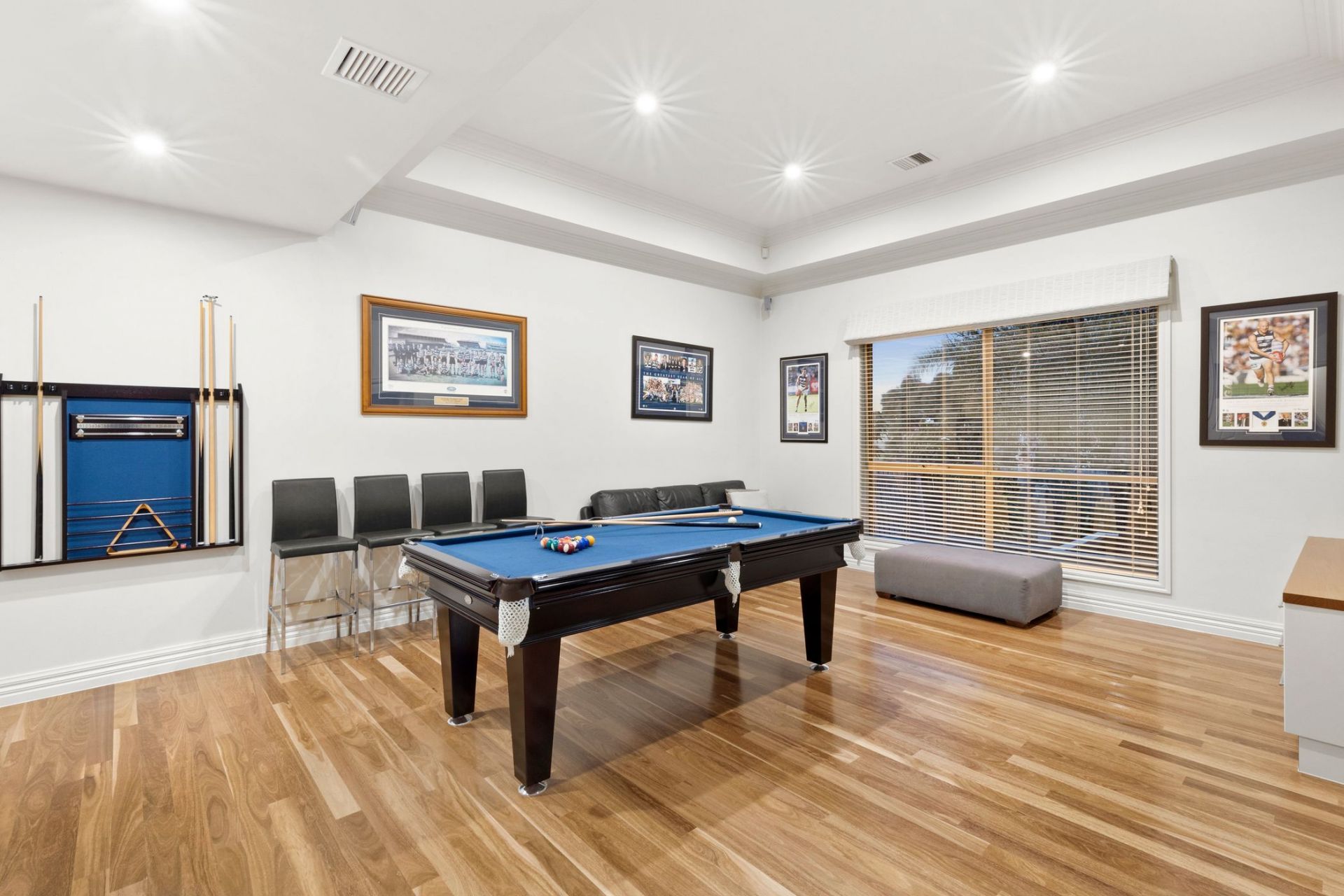 Rumpus/Games: currently used as a games room for a pool table, think home theatre with high ceilings, timber flooring and additional storage, and already comes with full remote roman blind ready to start as theatre room