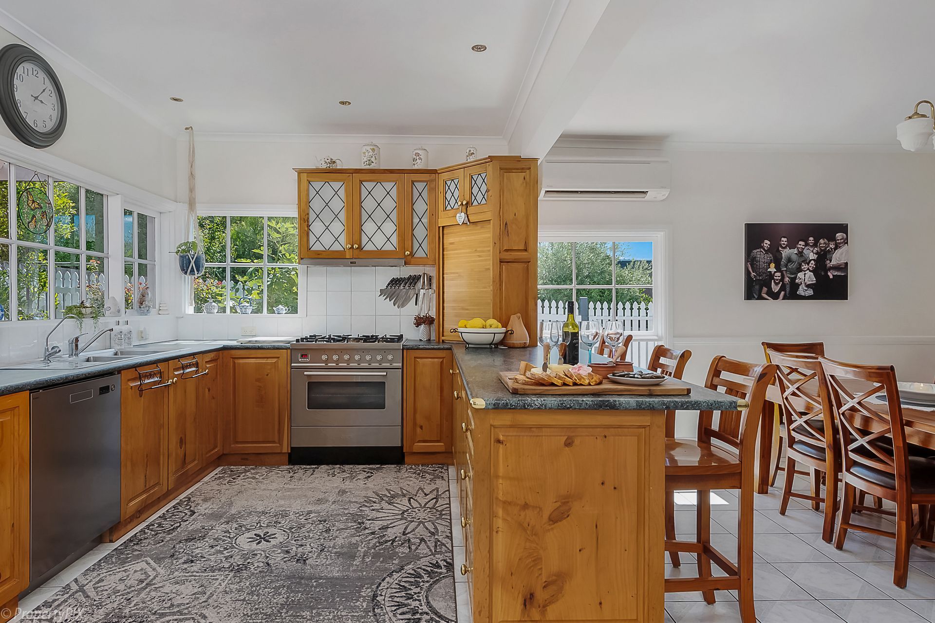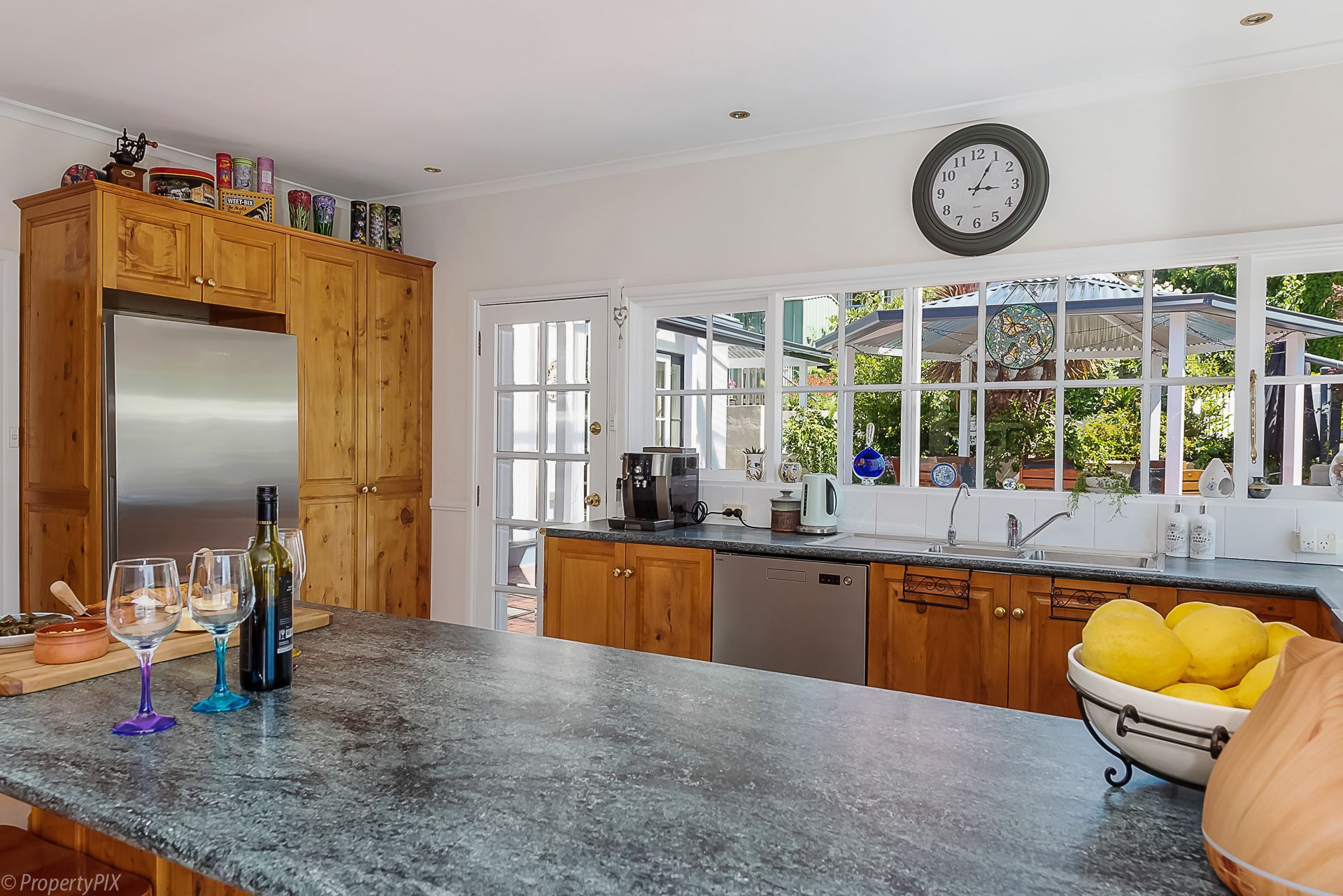 The frosted French door at the end of the entrance leads to the family dining, lounge with stained window skylight and large country style open kitchen in Macrocarpa pine. There are polished floorboards in the family room and tiles through the dining and kitchen area. 800mm gas top free standing iilve stainless steel stove; Asko Stainless steel dishwasher and Fisher & Paykel 790mm 2 door fridge.