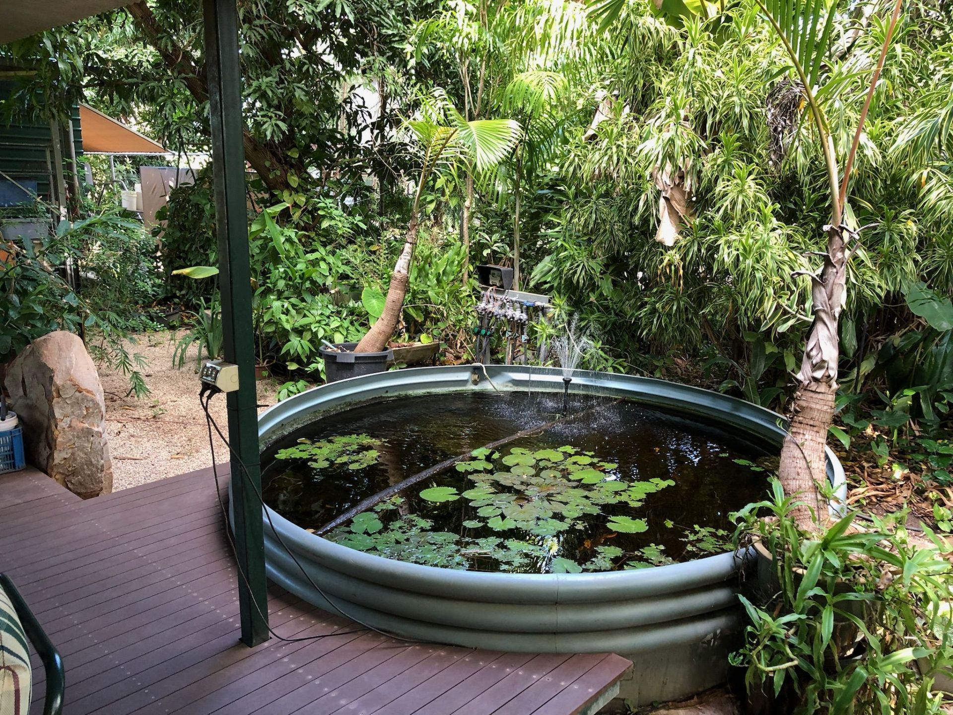 8.5m x 5m undercover deck with a 4500lt above ground pond surrounded by additional water features and tropical gardens.